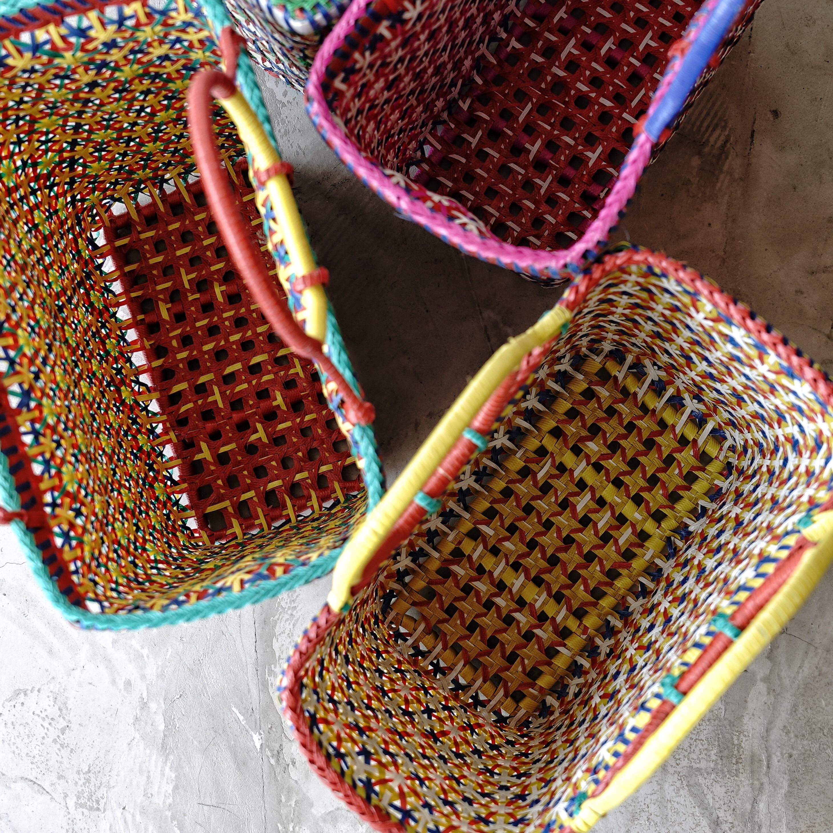 エコフレンドリーなリサイクルプラスチックを使用し、インドの職人によるハンドメイドで仕上げられています。優れた耐久性とカラフルなデザインで、インテリアとしても楽しめるアイテムです。お部屋の整理整頓や収納に最適なバスケットです!