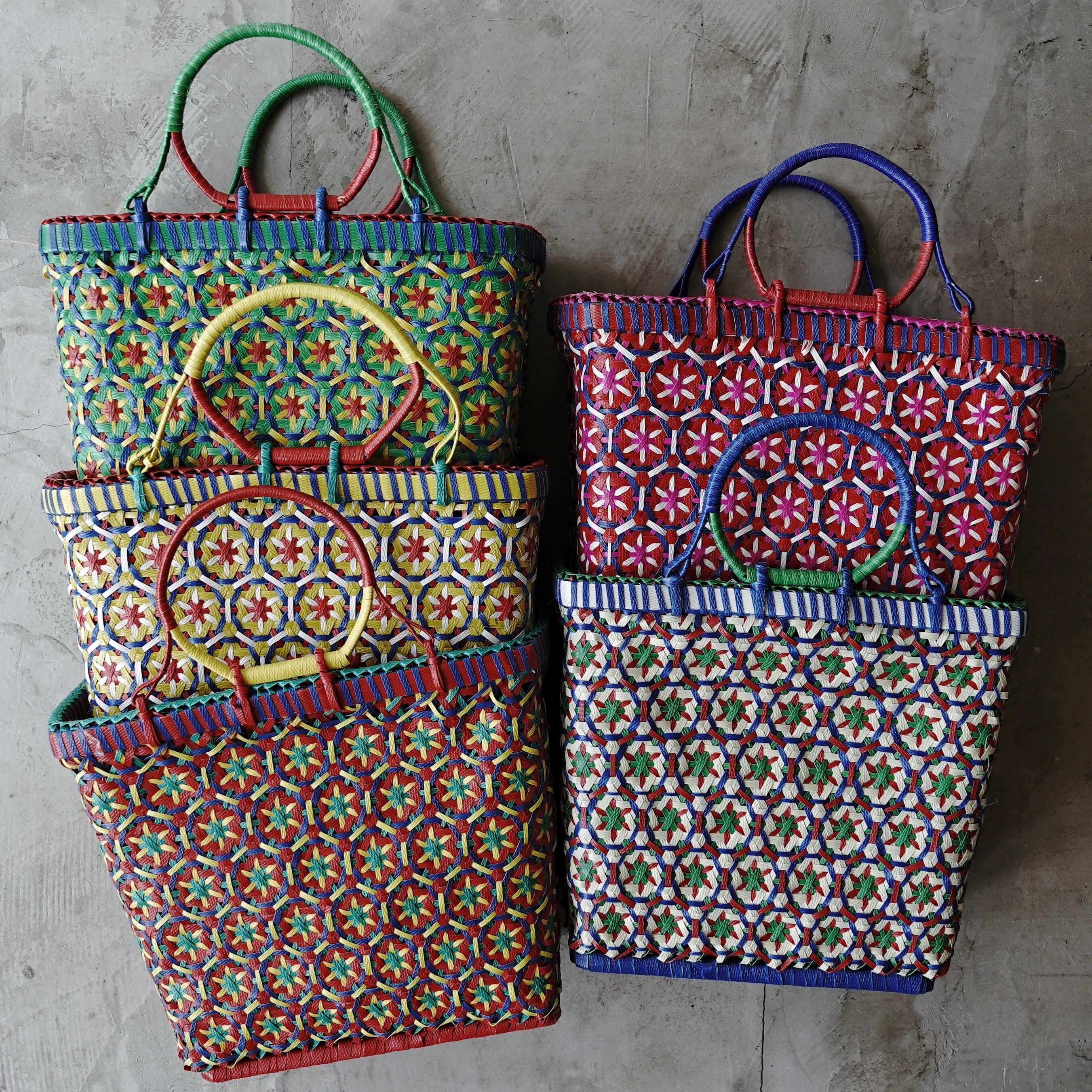 エコフレンドリーなリサイクルプラスチックを使用し、インドの職人によるハンドメイドで仕上げられています。優れた耐久性とカラフルなデザインで、インテリアとしても楽しめるアイテムです。お部屋の整理整頓や収納に最適なバスケットです!