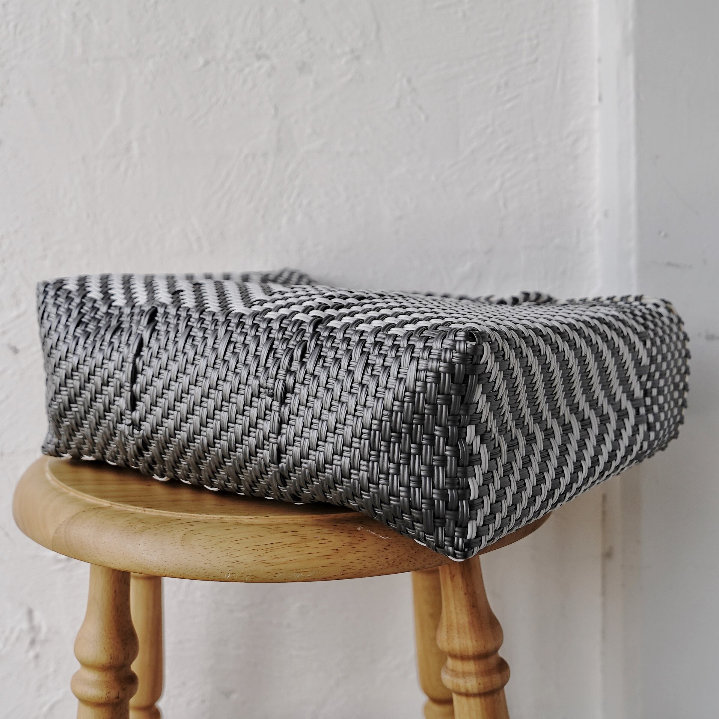 プラスティックをリサイクルしたテープを使用し、手編みで作られています。
