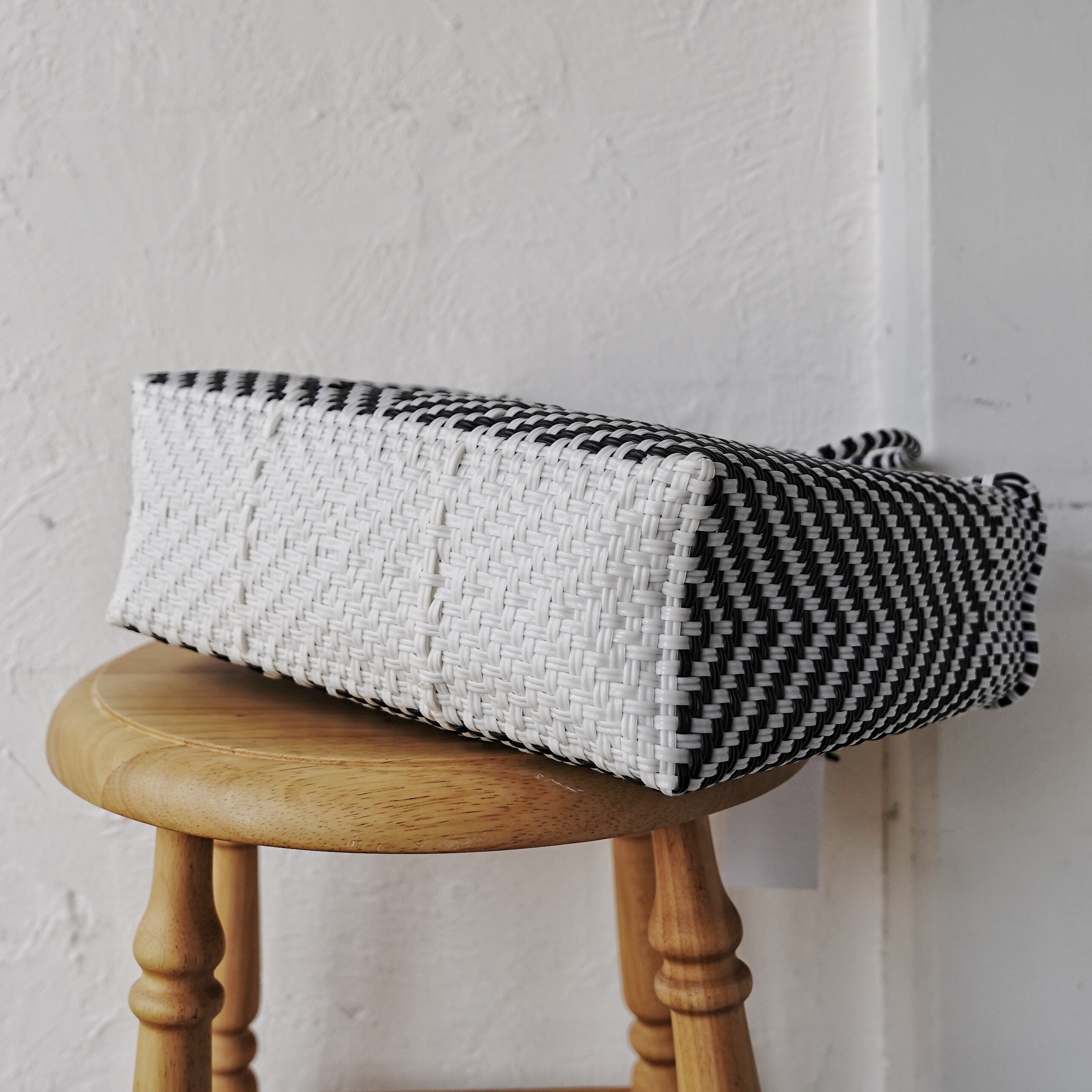 プラスティックをリサイクルしたテープを使用し、手編みで作られています。