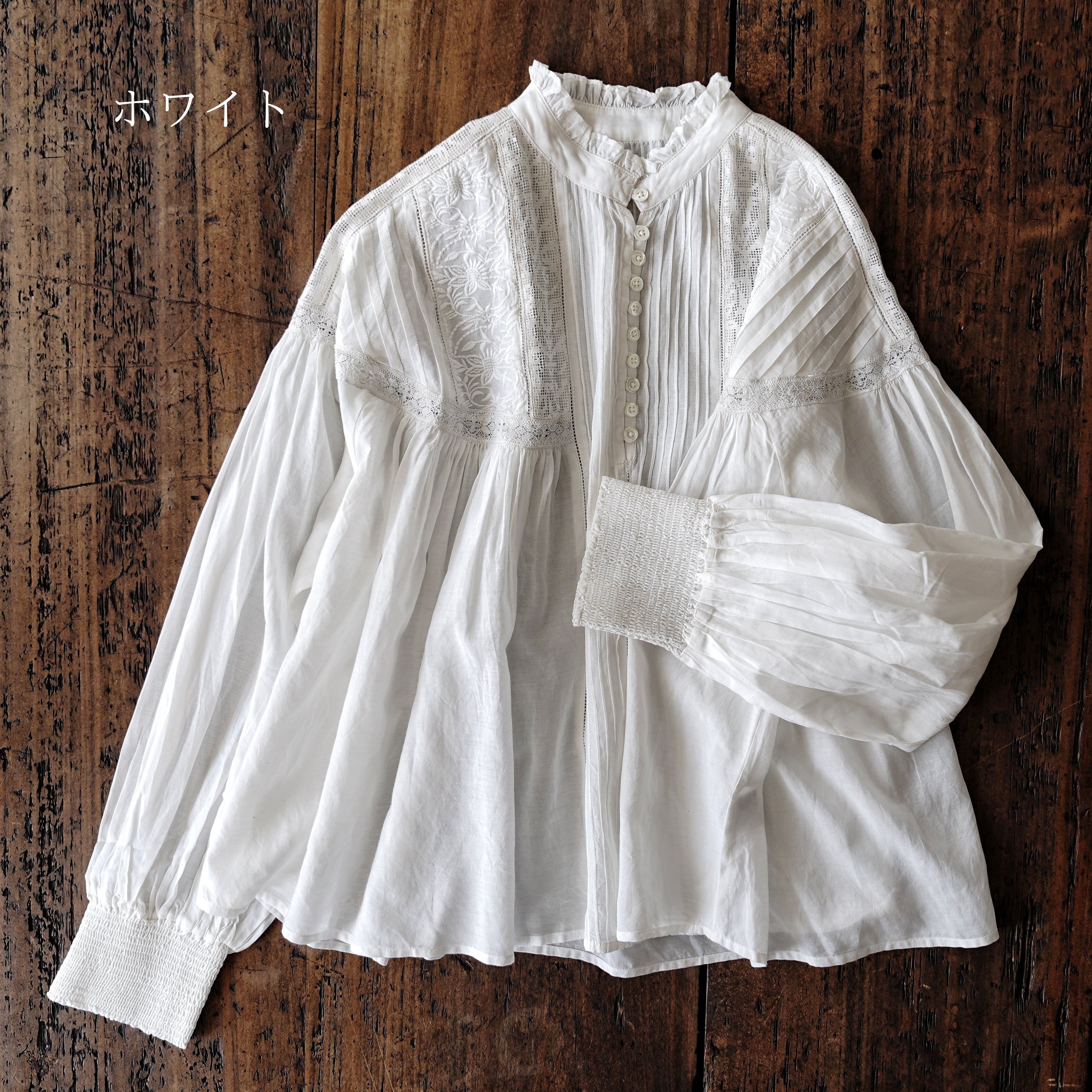 ヨークにはリバーレースを含む3種類のレースと、刺繍やピンタックも入って豪華なブラウスに仕上がっています。