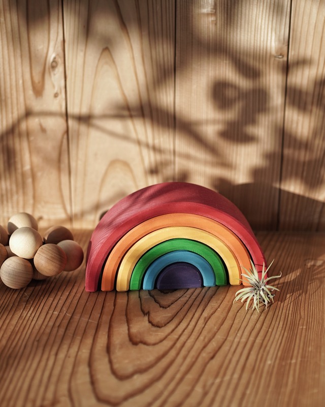 ハンノキを使用。順番にはめていくだけでなく、上に積み上げたり反対に置いてみたりと、橋やトンネル・フェンスや小さなおうちなど見立て方次第で遊び方は無限大。ダイナミックな遊びが楽しめる多様性をもった積み木です。虹色のトンネルの中に車や汽車を通らせれば子供たちの目が輝きます。