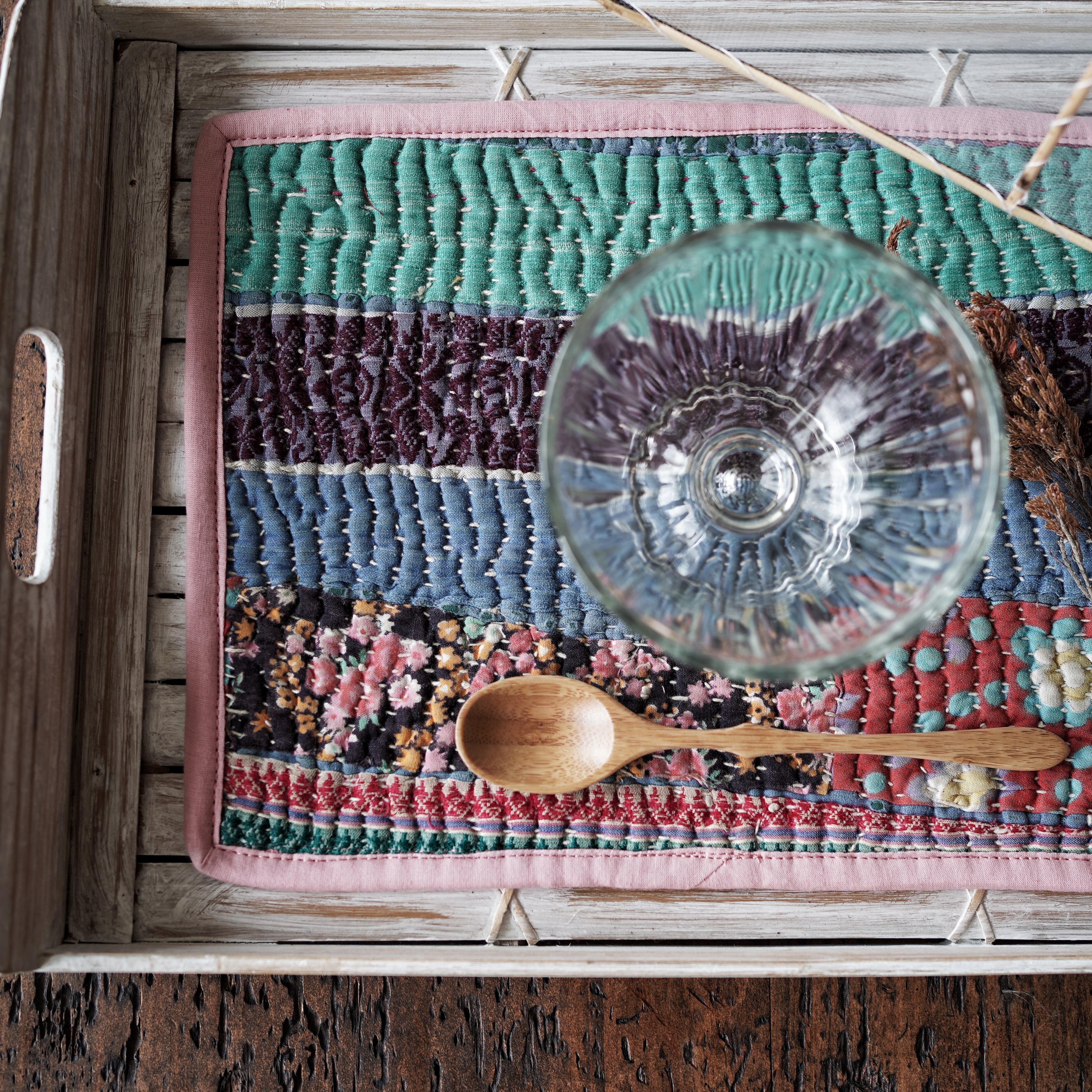 インドの伝統的な刺し子刺繍「グドゥリー」で仕立てられた、手仕事のぬくもりあふれるプレースマット。