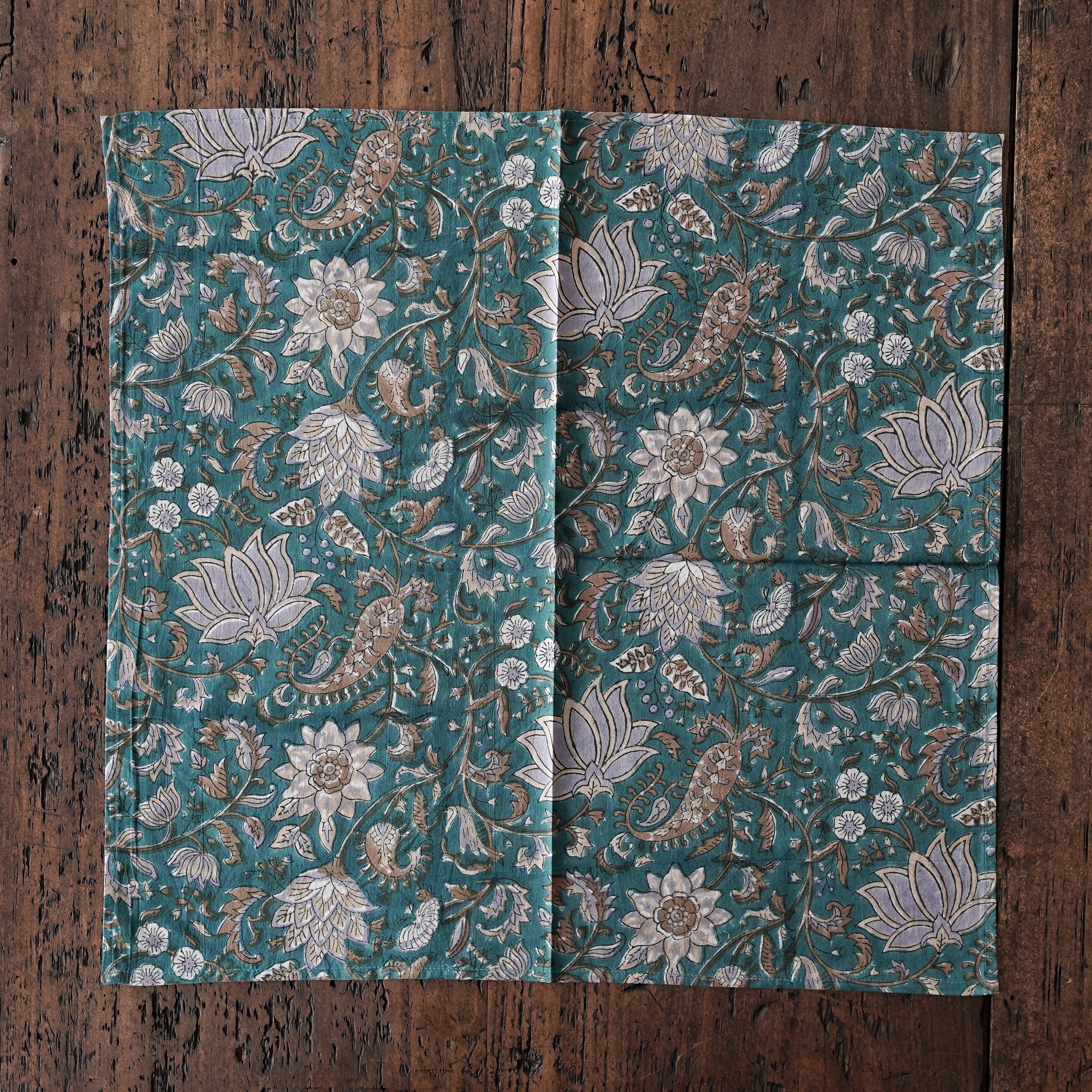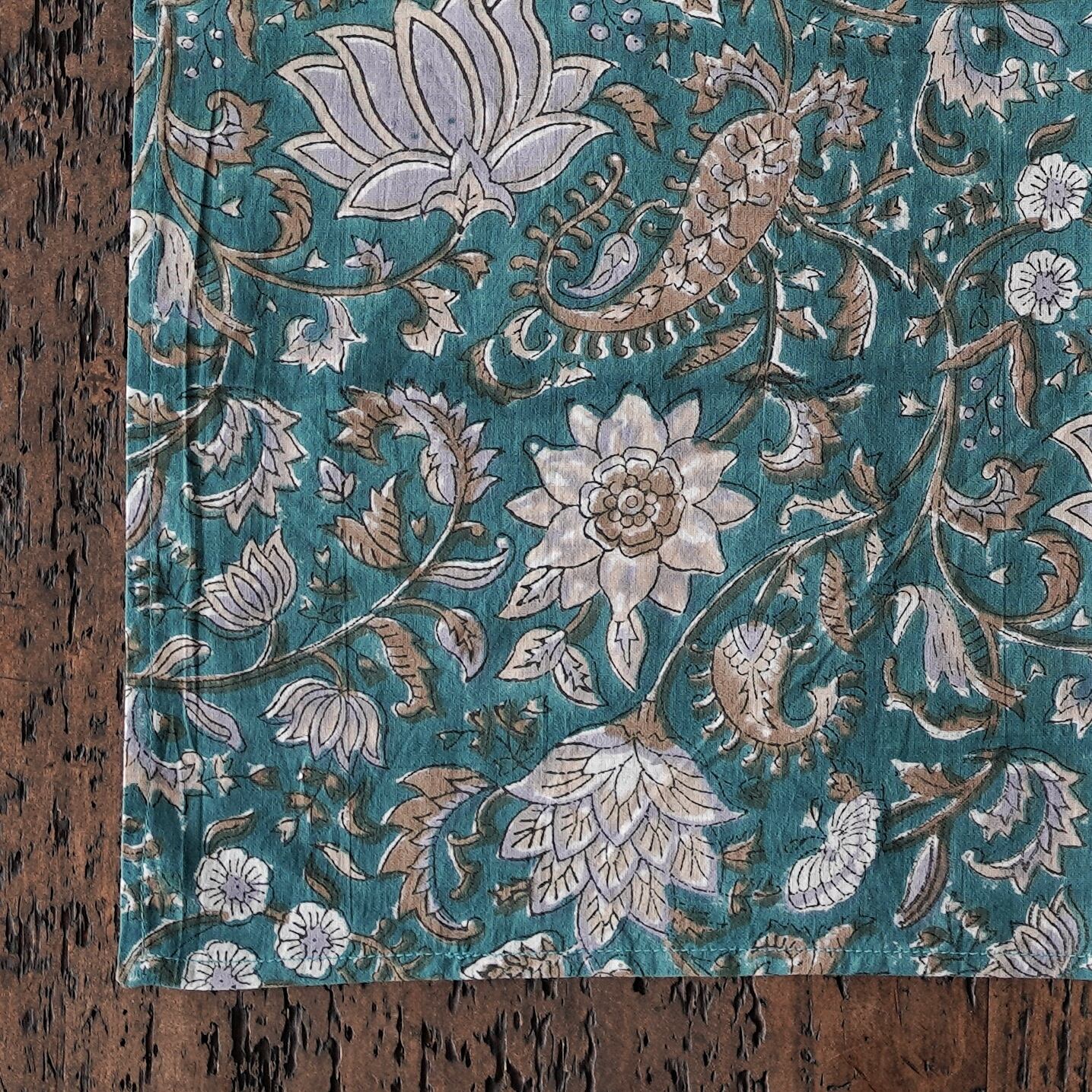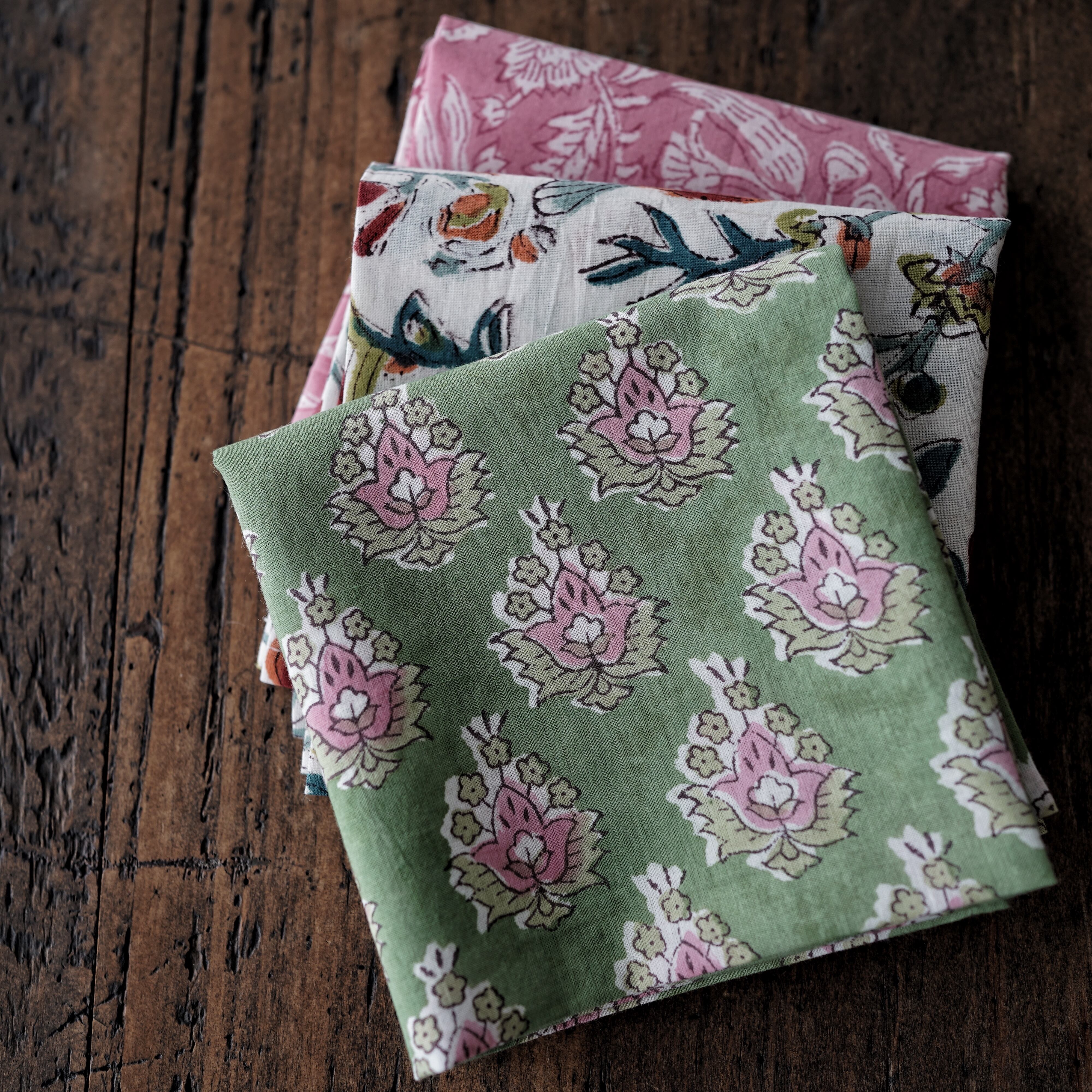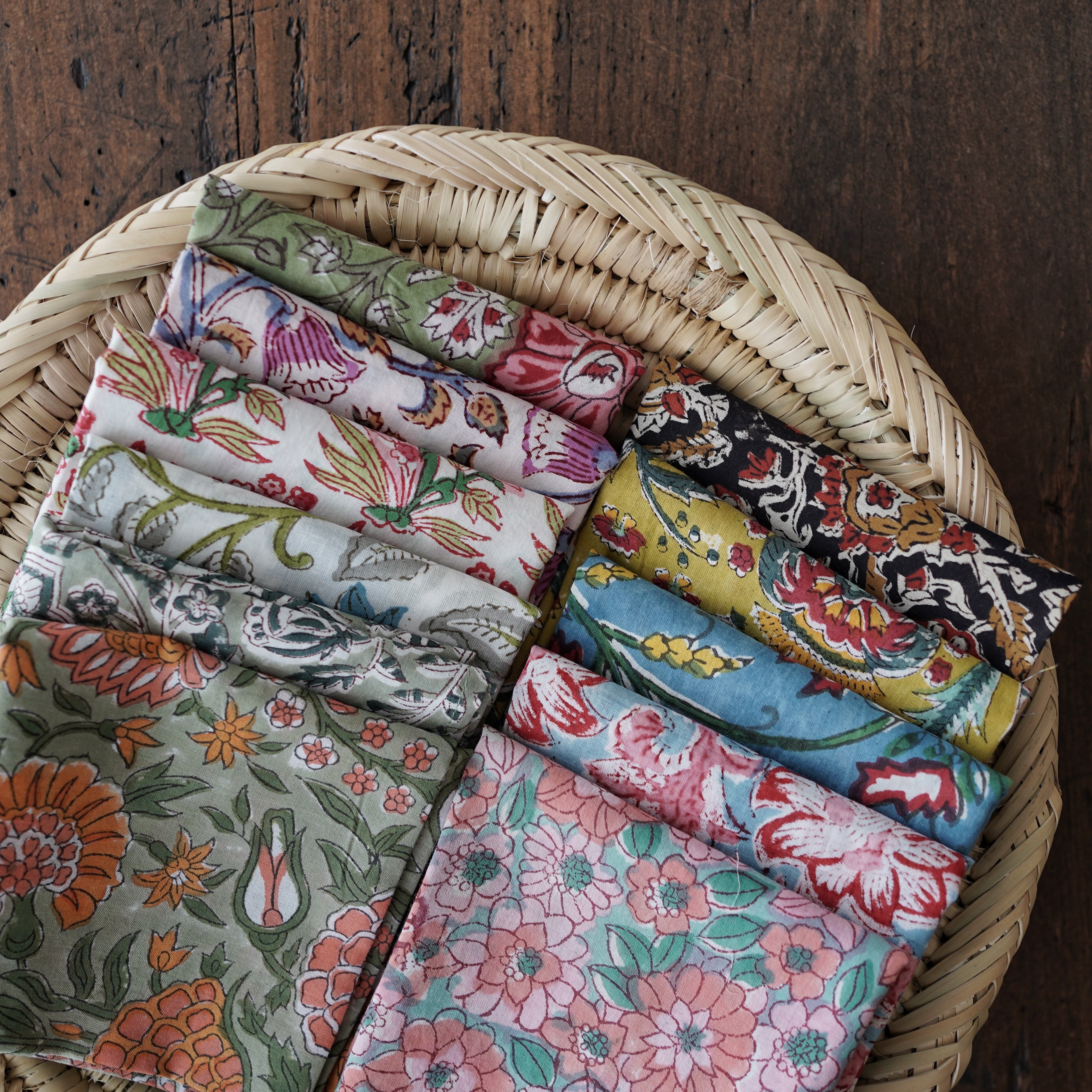 手彫りの木版を使って模様を押していく、インド伝統のブロックプリント。その名産地として知られるサンガネールで、一点一点手作業でプリントされたバンダナです。