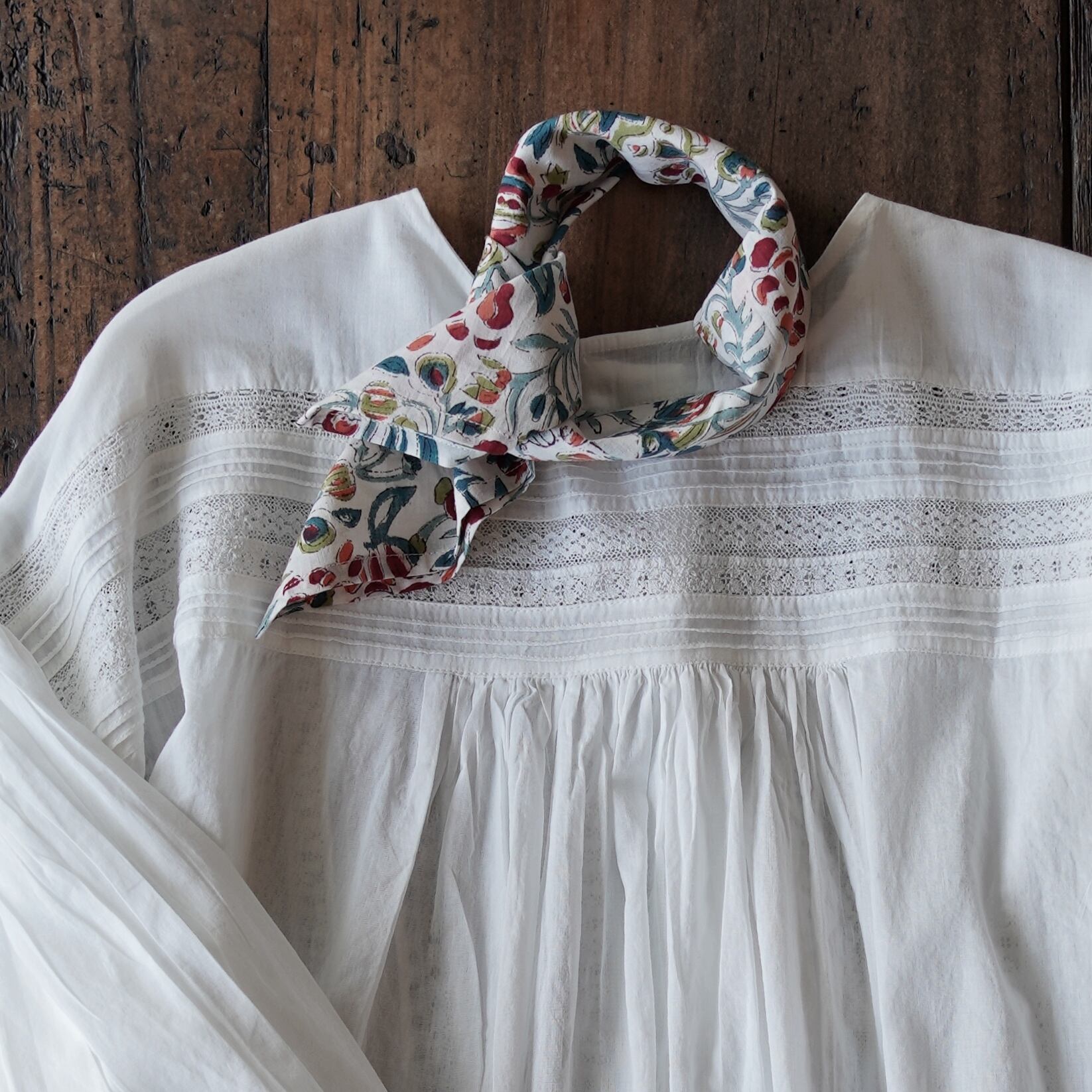 首元に巻いたり、バッグのアクセントにしたり、ランチクロスやハンカチ代わりにも。暮らしの中でいろんな表情を見せてくれる、手しごとの布です。