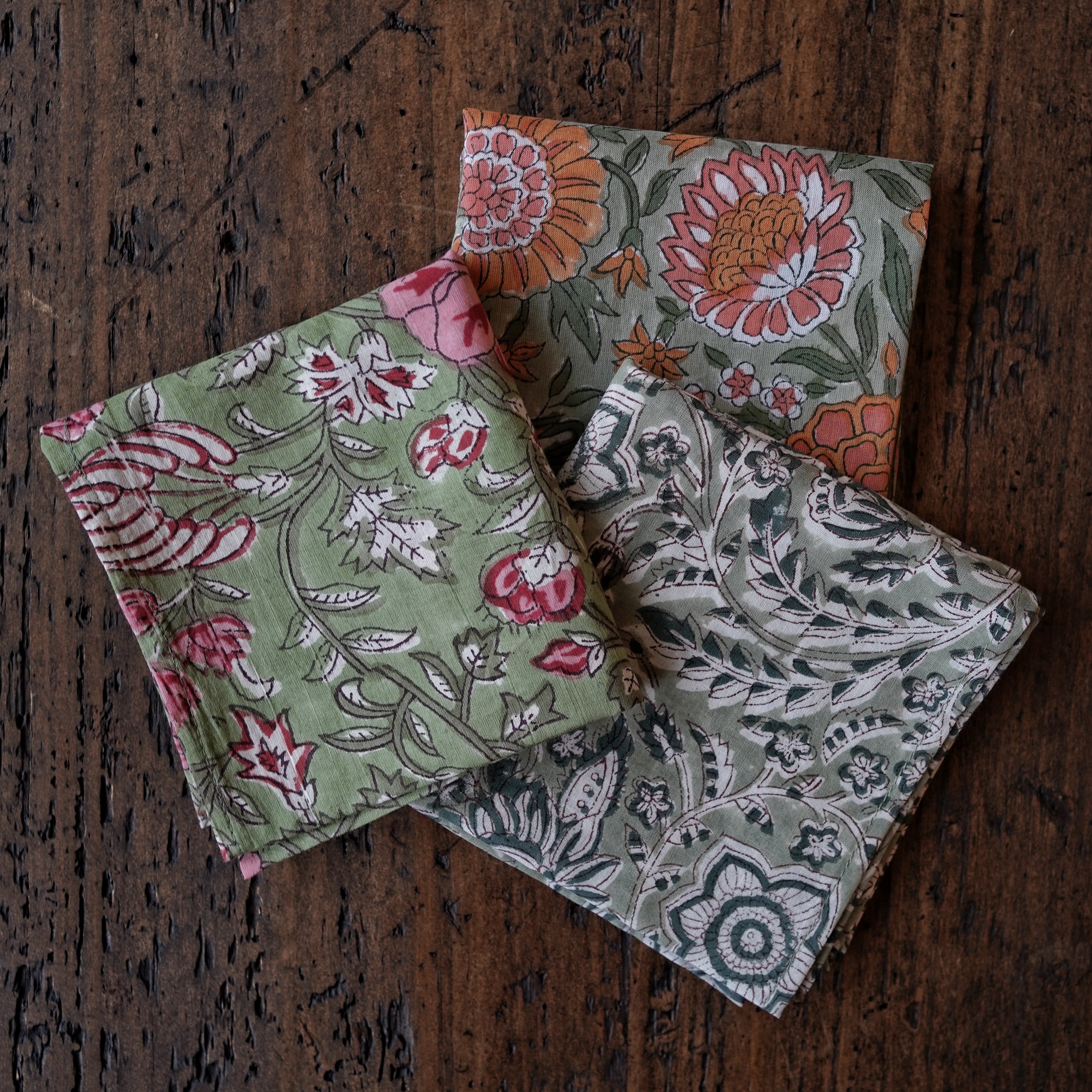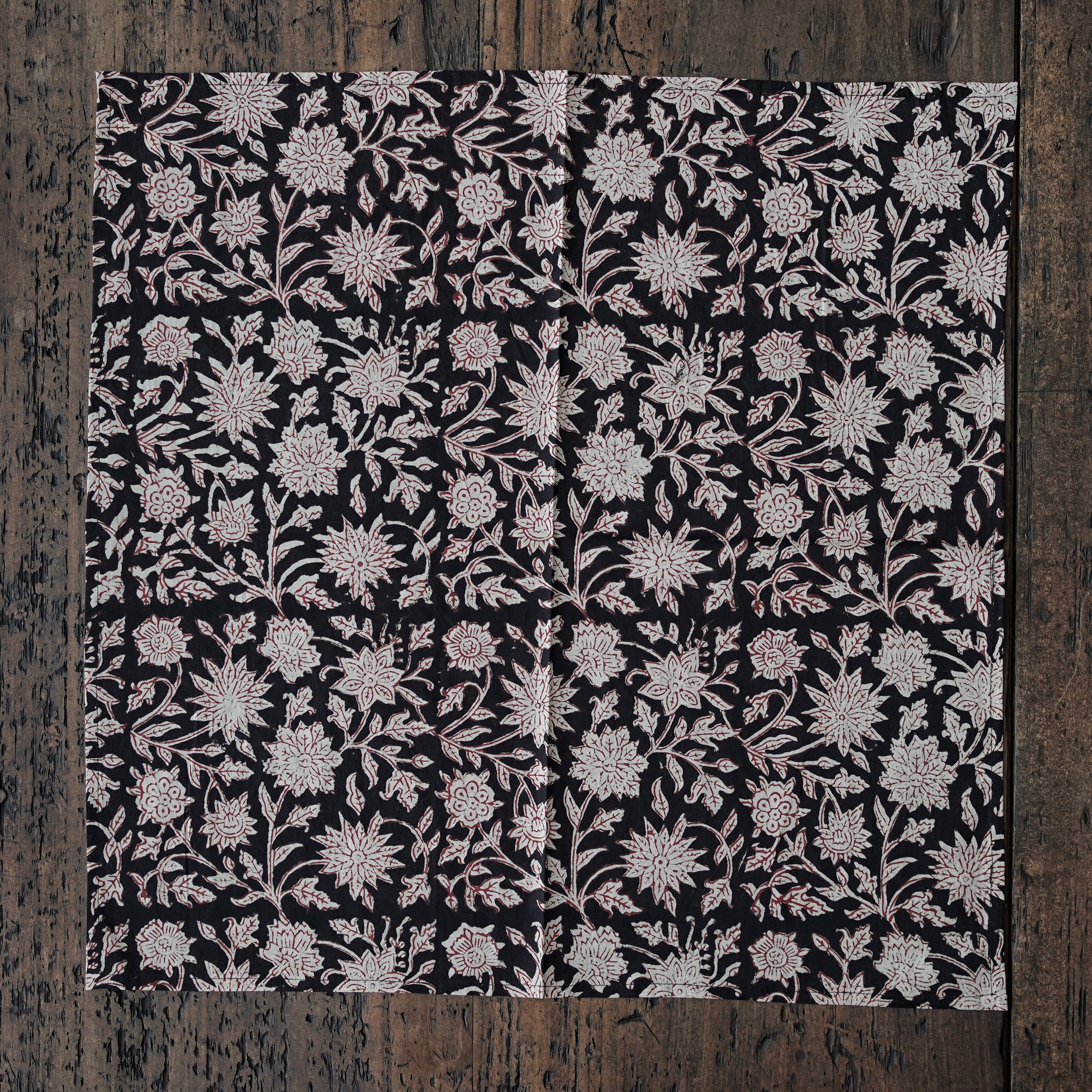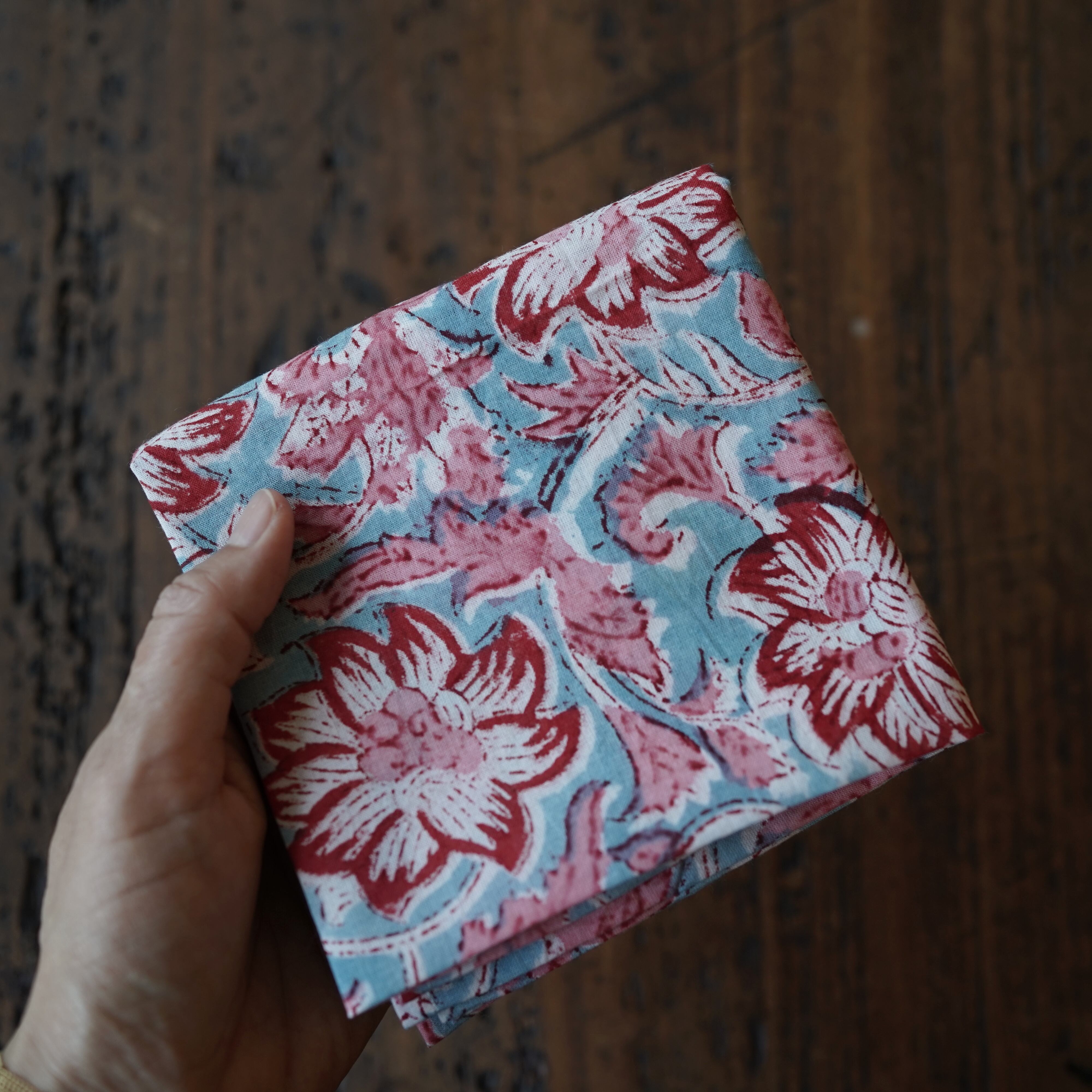 手彫りの木版を使って模様を押していく、インド伝統のブロックプリント。その名産地として知られるサンガネールで、一点一点手作業でプリントされたバンダナです。