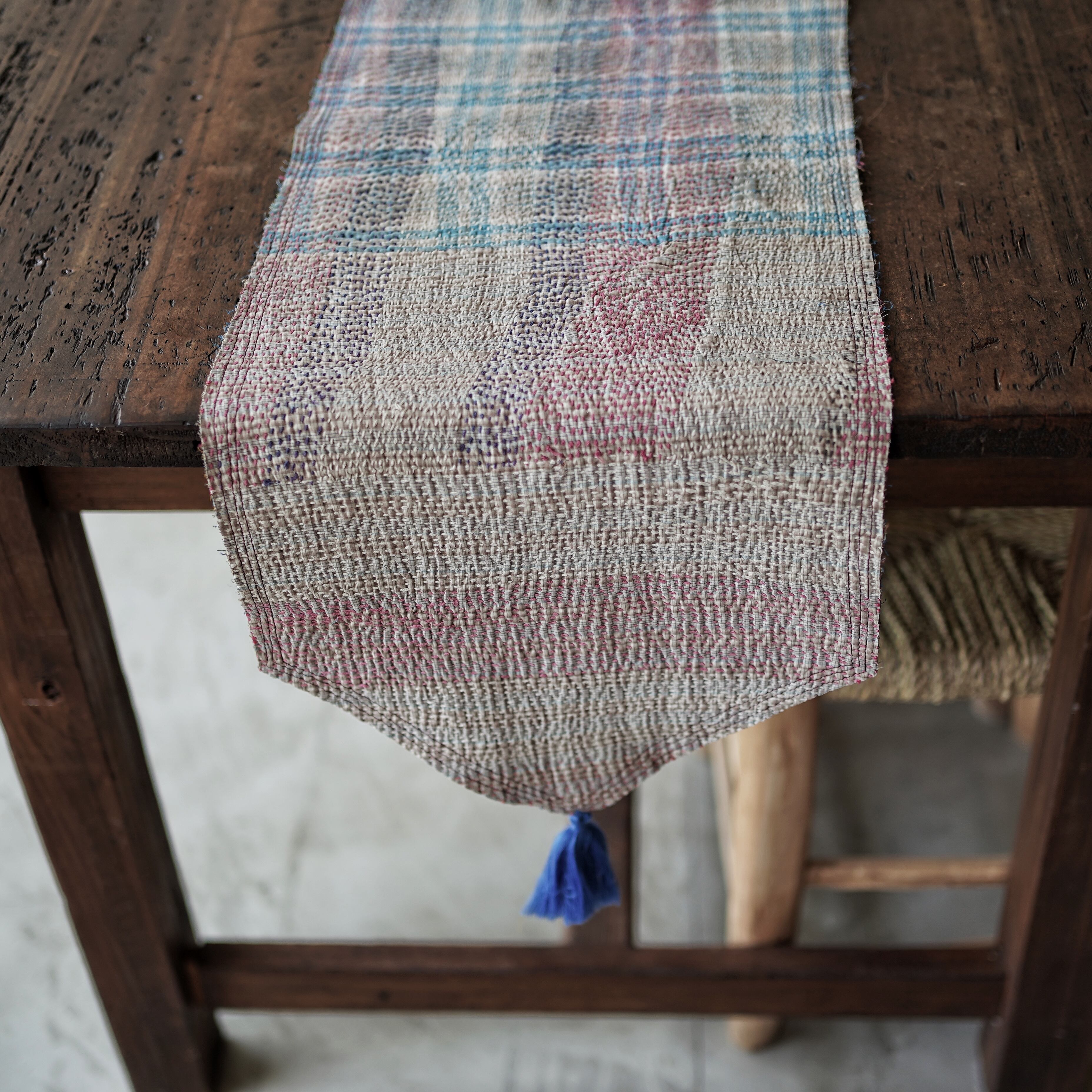 このテーブルランナーは、そんなグドゥリークロスの中でも、とりわけ細やかな刺し子や、ダイヤ型・花型などの意匠が際立つ一枚を選び抜き、仕立てられています。