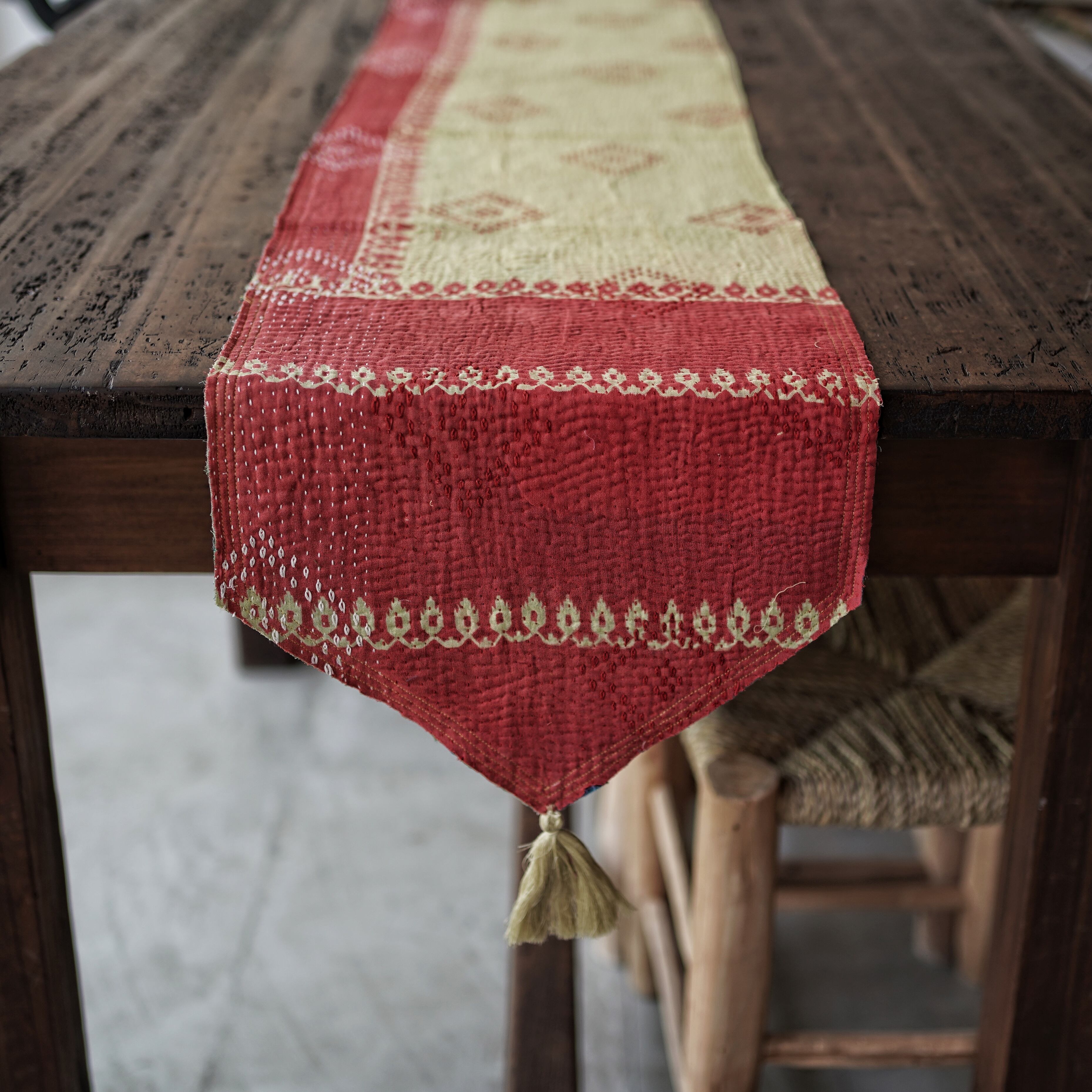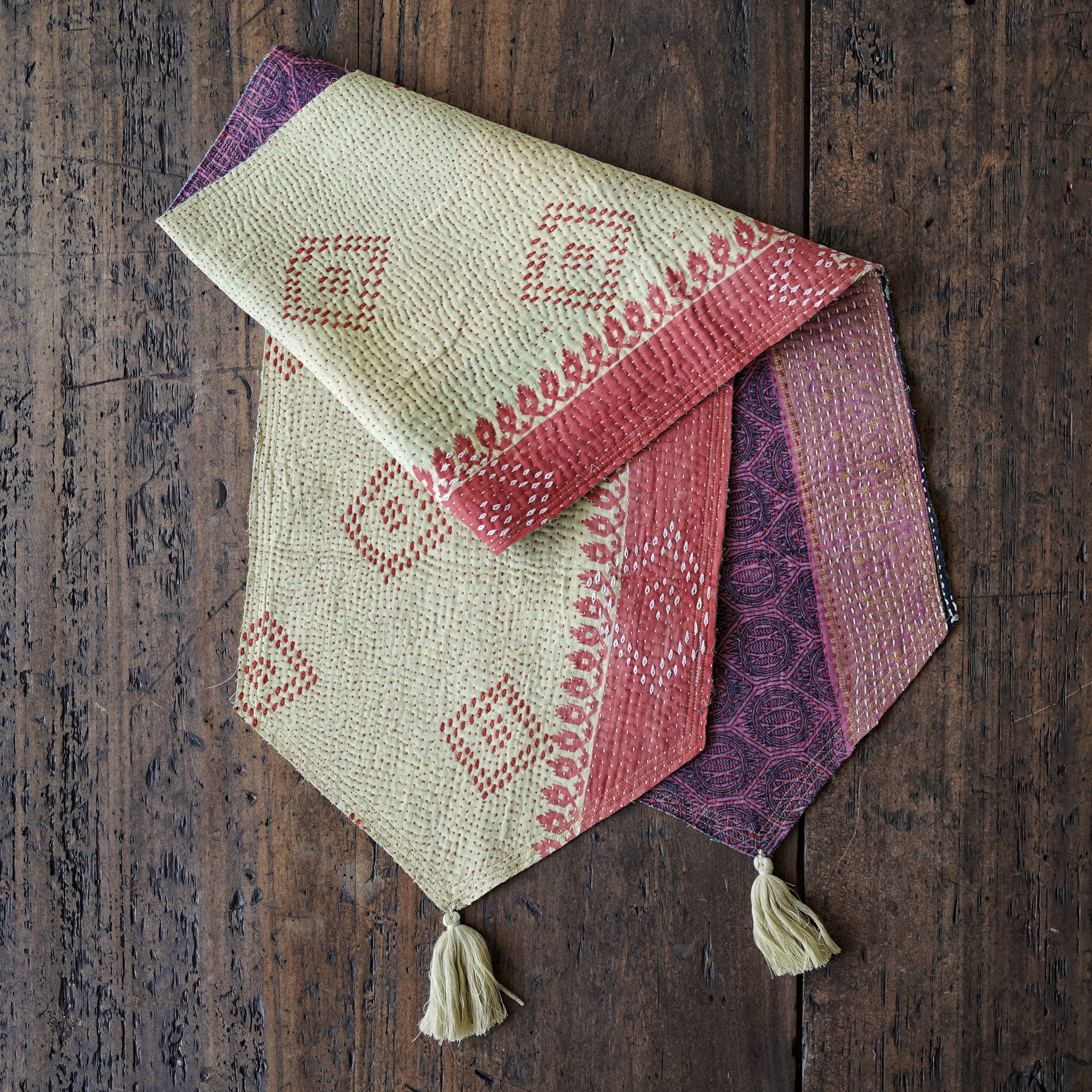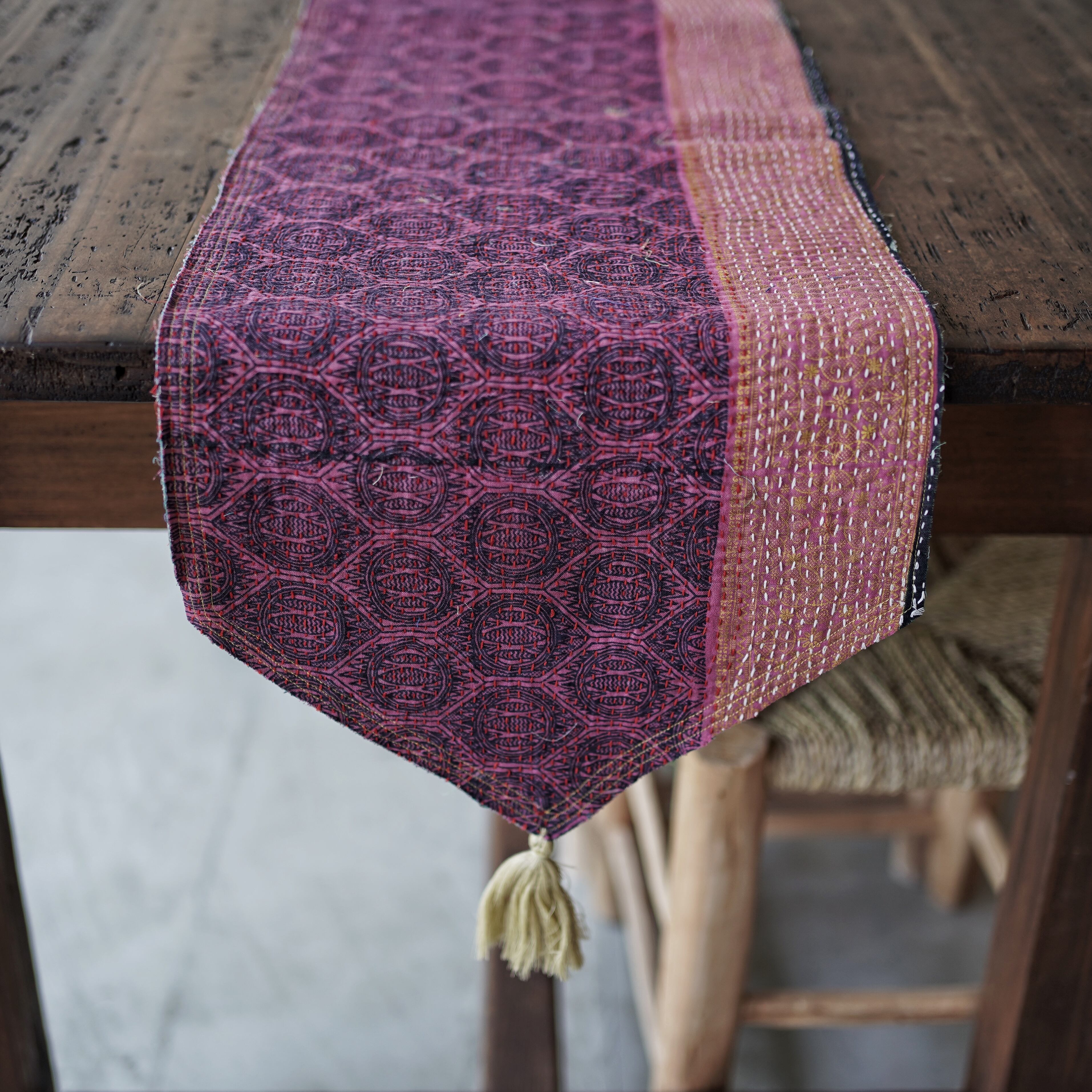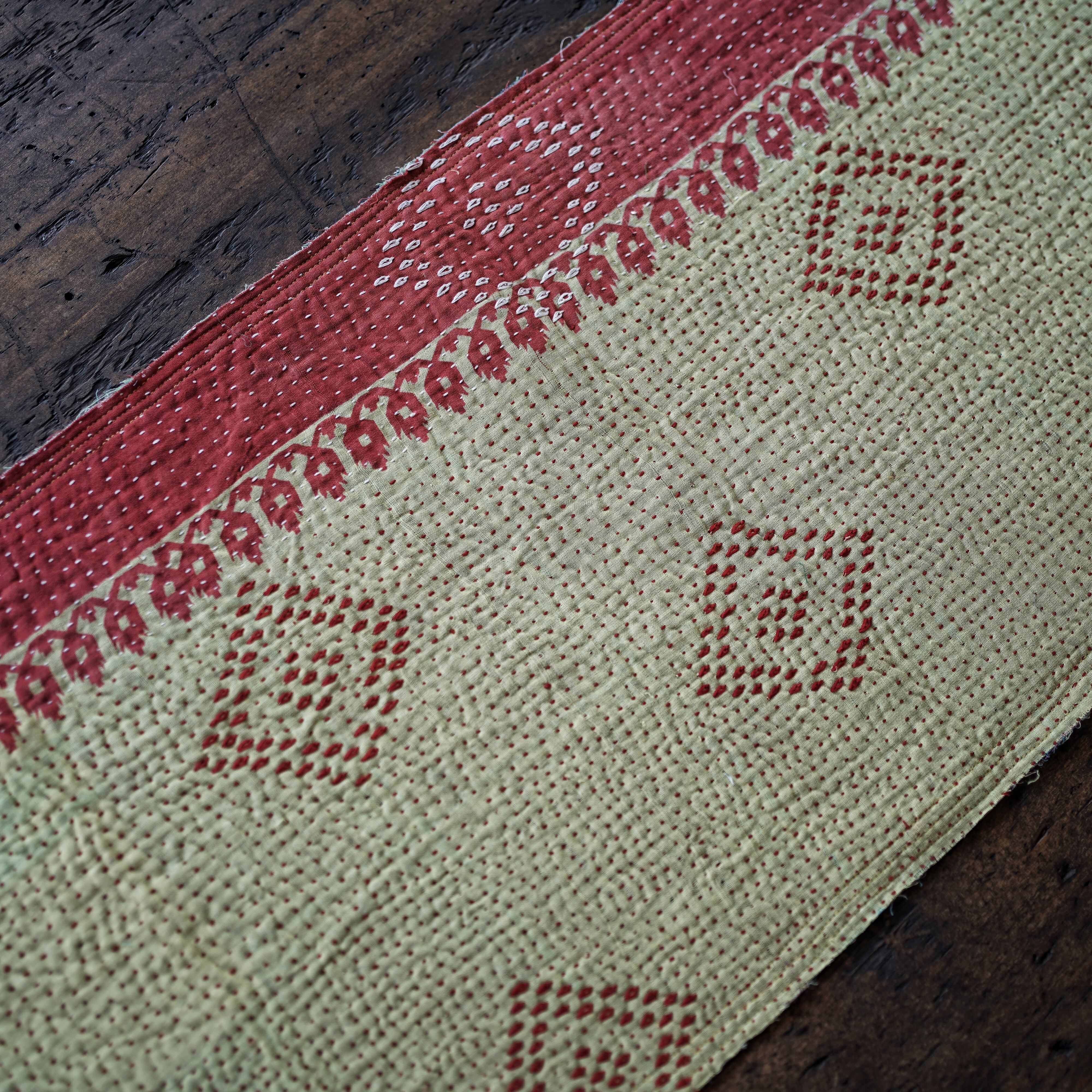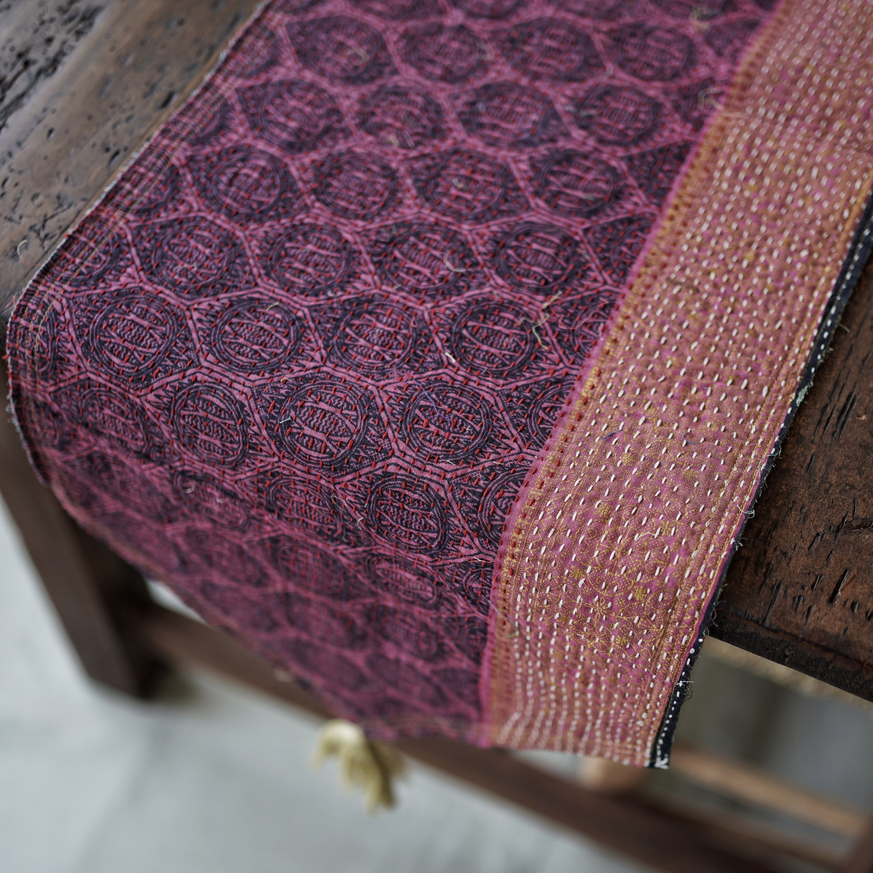 このテーブルランナーは、そんなグドゥリークロスの中でも、とりわけ細やかな刺し子や、ダイヤ型・花型などの意匠が際立つ一枚を選び抜き、仕立てられています。