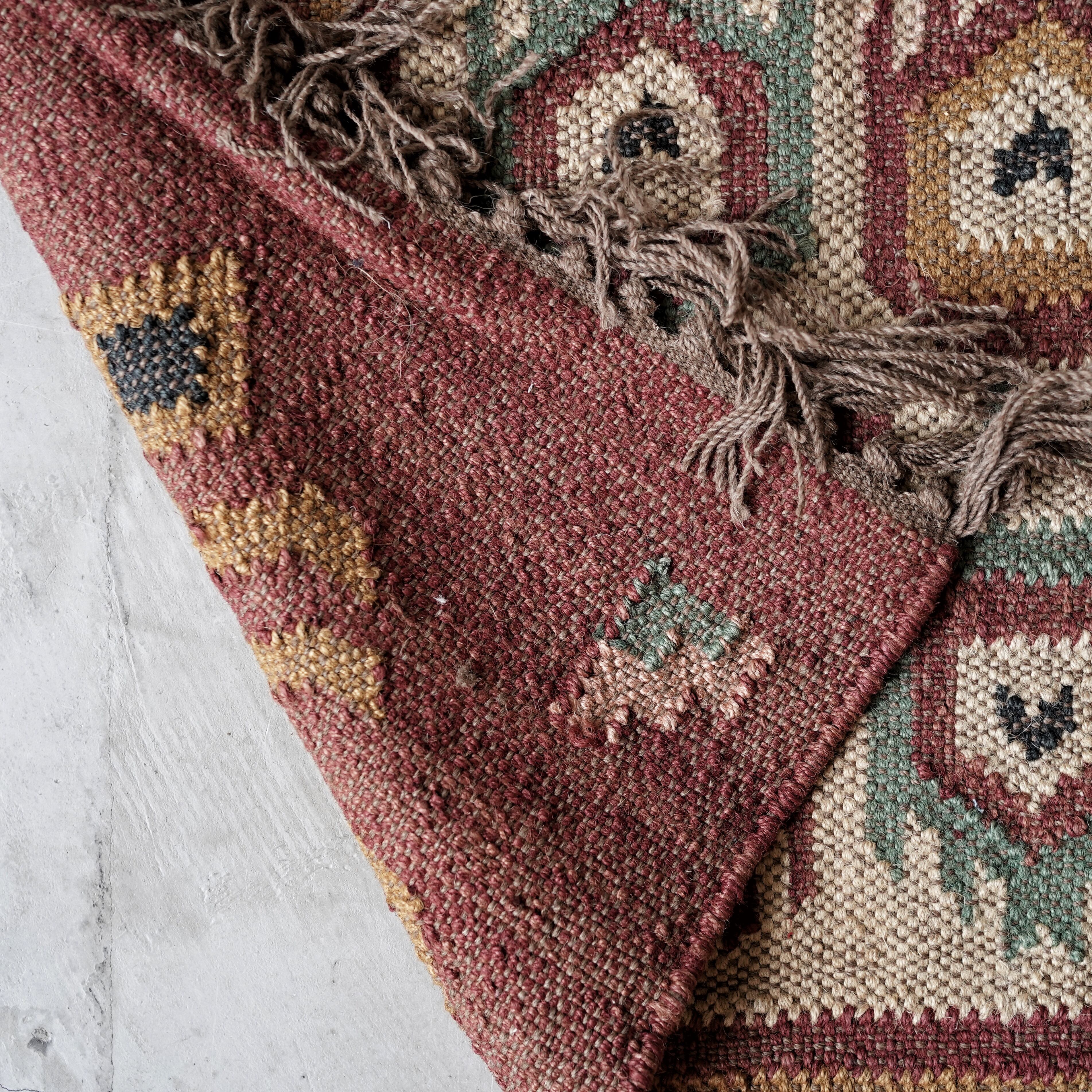 インドの職人たちによって一枚一枚丁寧に織り上げられたラグは、しっかりとした厚みがあり、足元に心地よい質感をもたらします。ソファの前やベッドサイド、デスク下など、暮らしのさまざまなシーンでお使いいただけます。