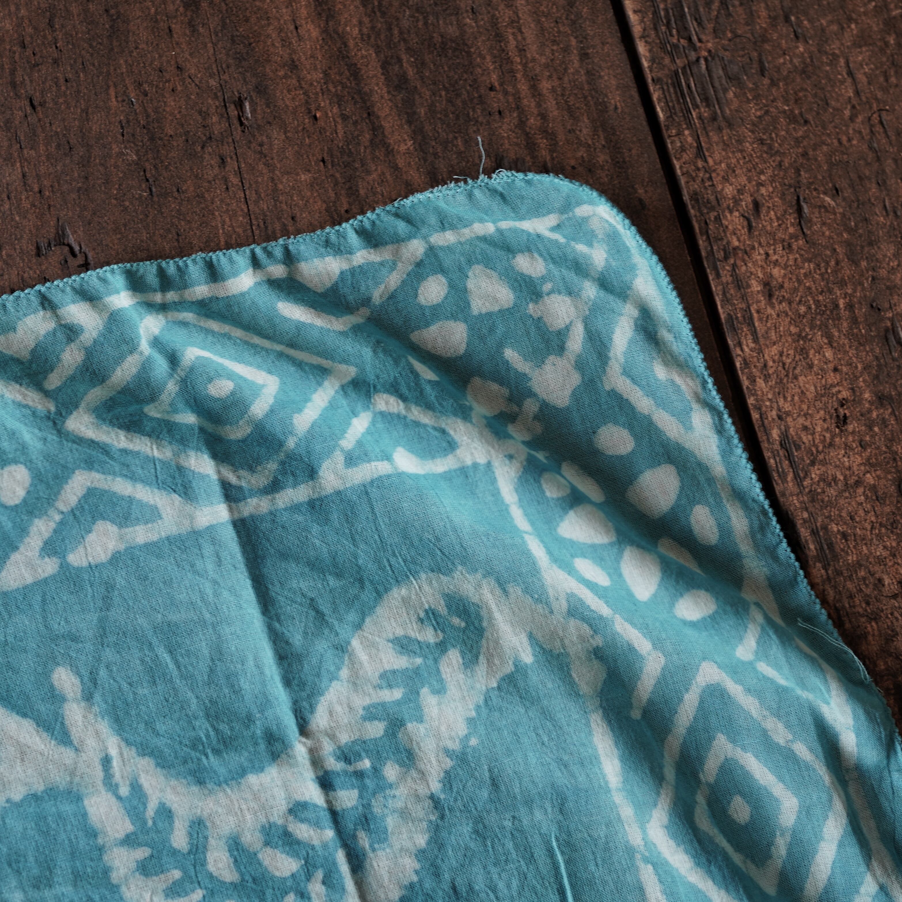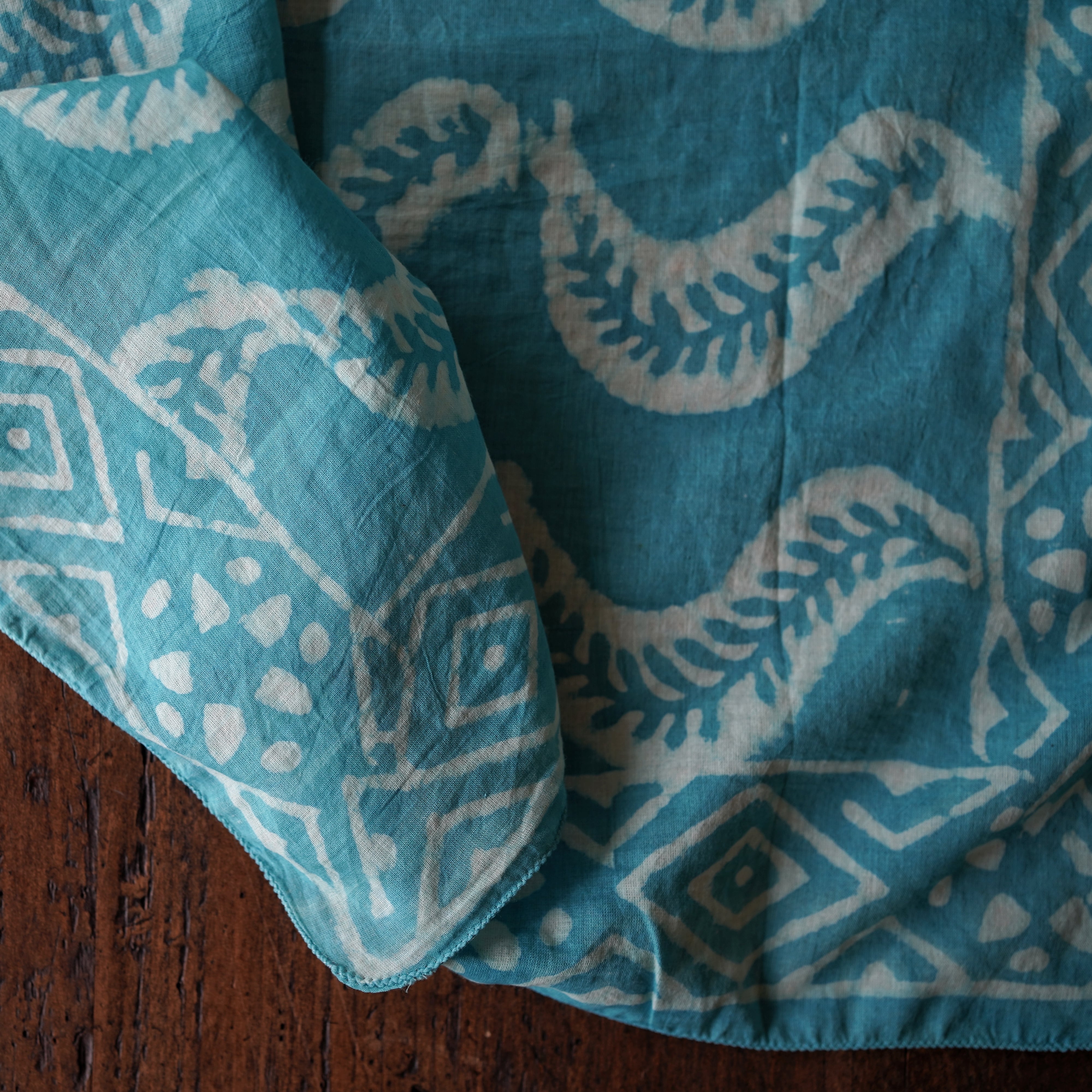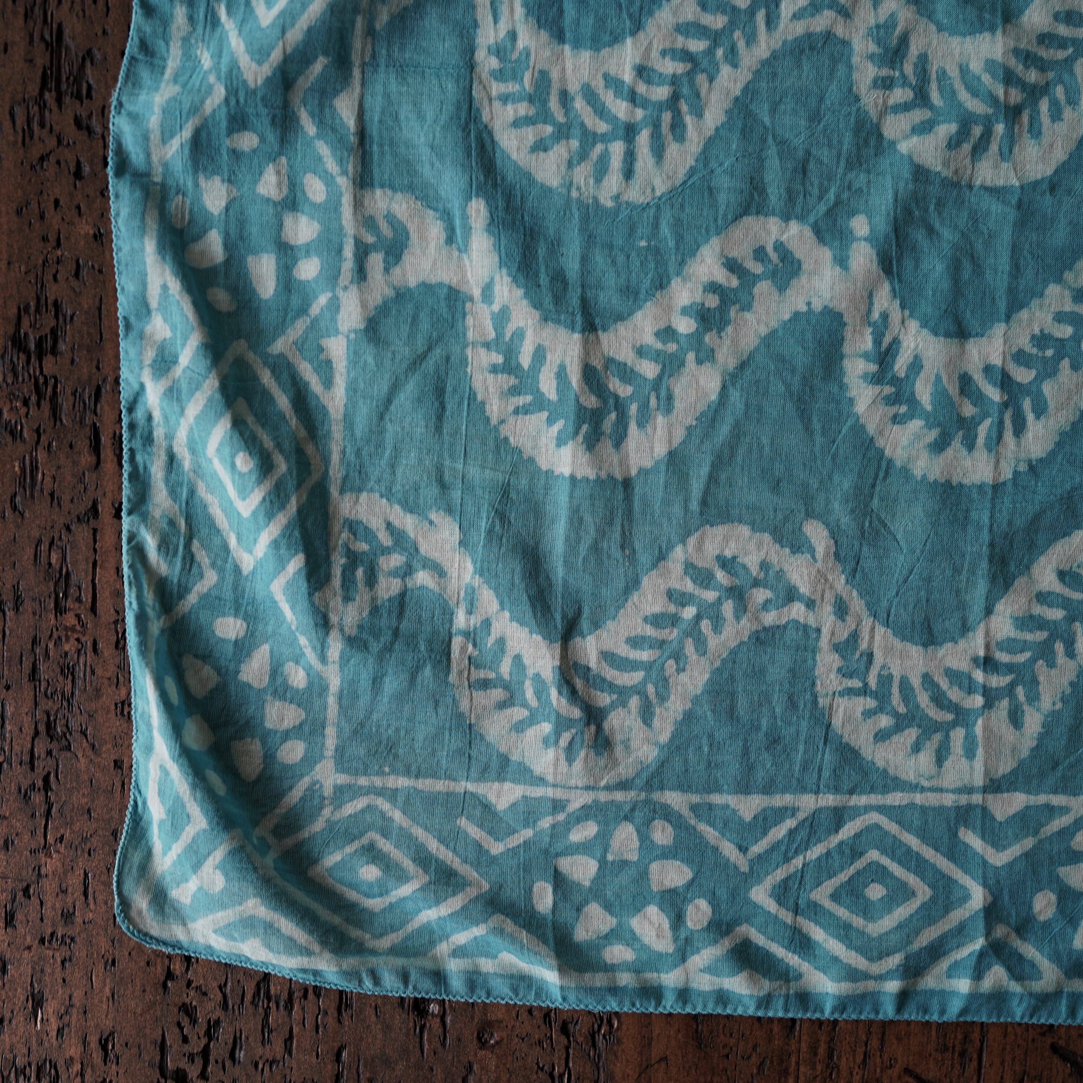インドの職人によって、一枚一枚ていねいに木版で染め上げられたコットンバンダナ。