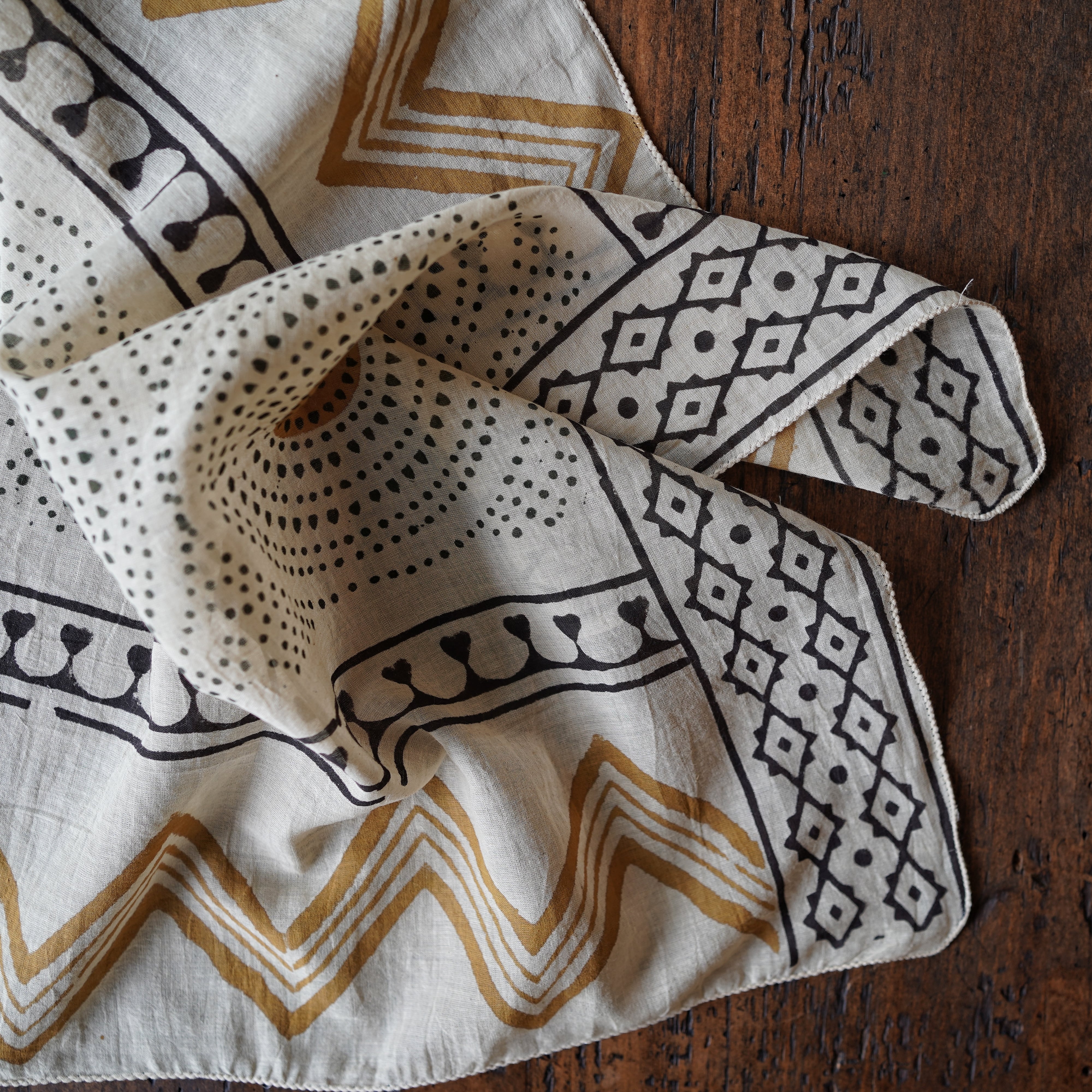 インドの職人によって、一枚一枚ていねいに木版で染め上げられたコットンバンダナ。