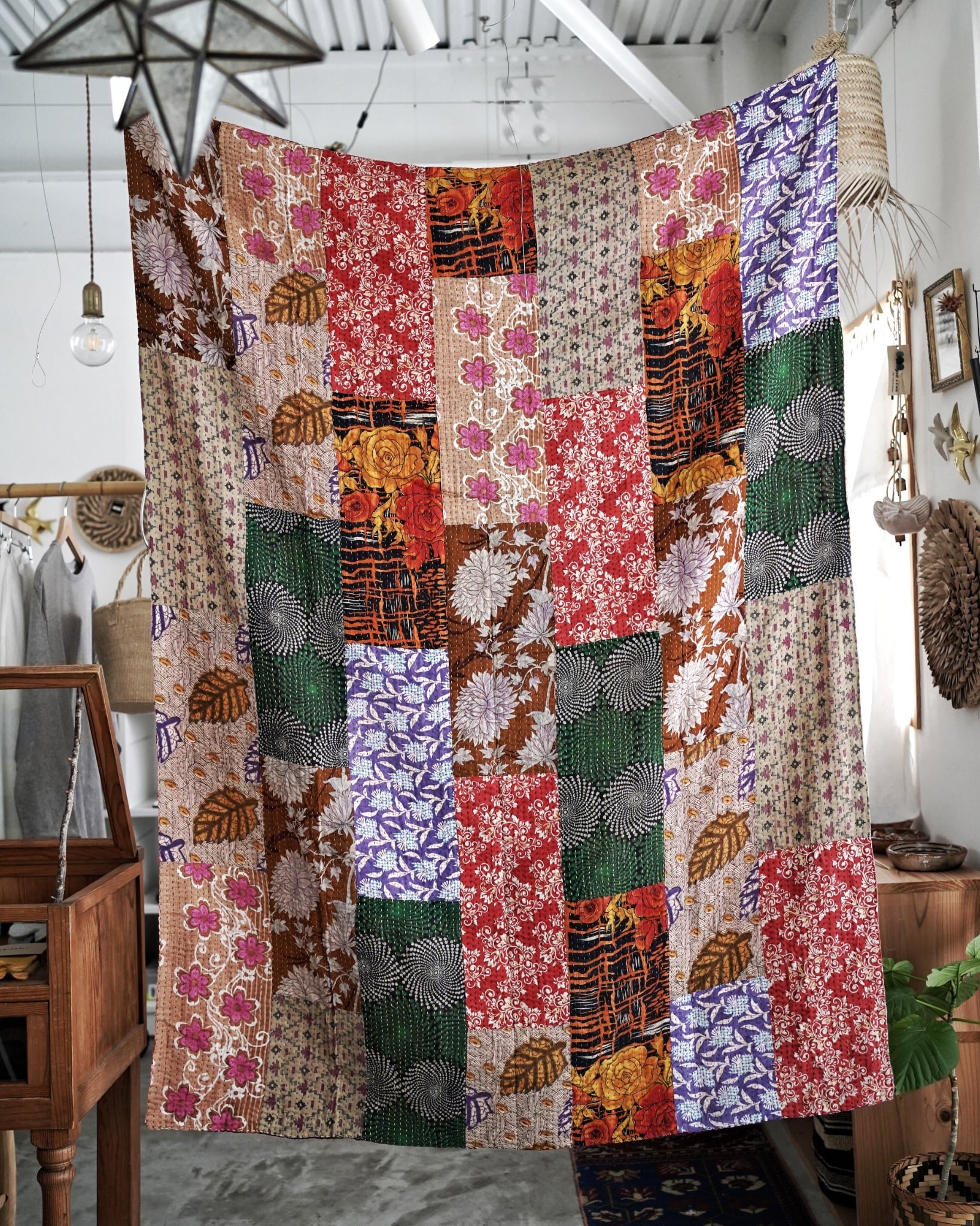 リサイクルサリーをランダムに使った、世界に1枚のパッチワーク調マルチカバー。
