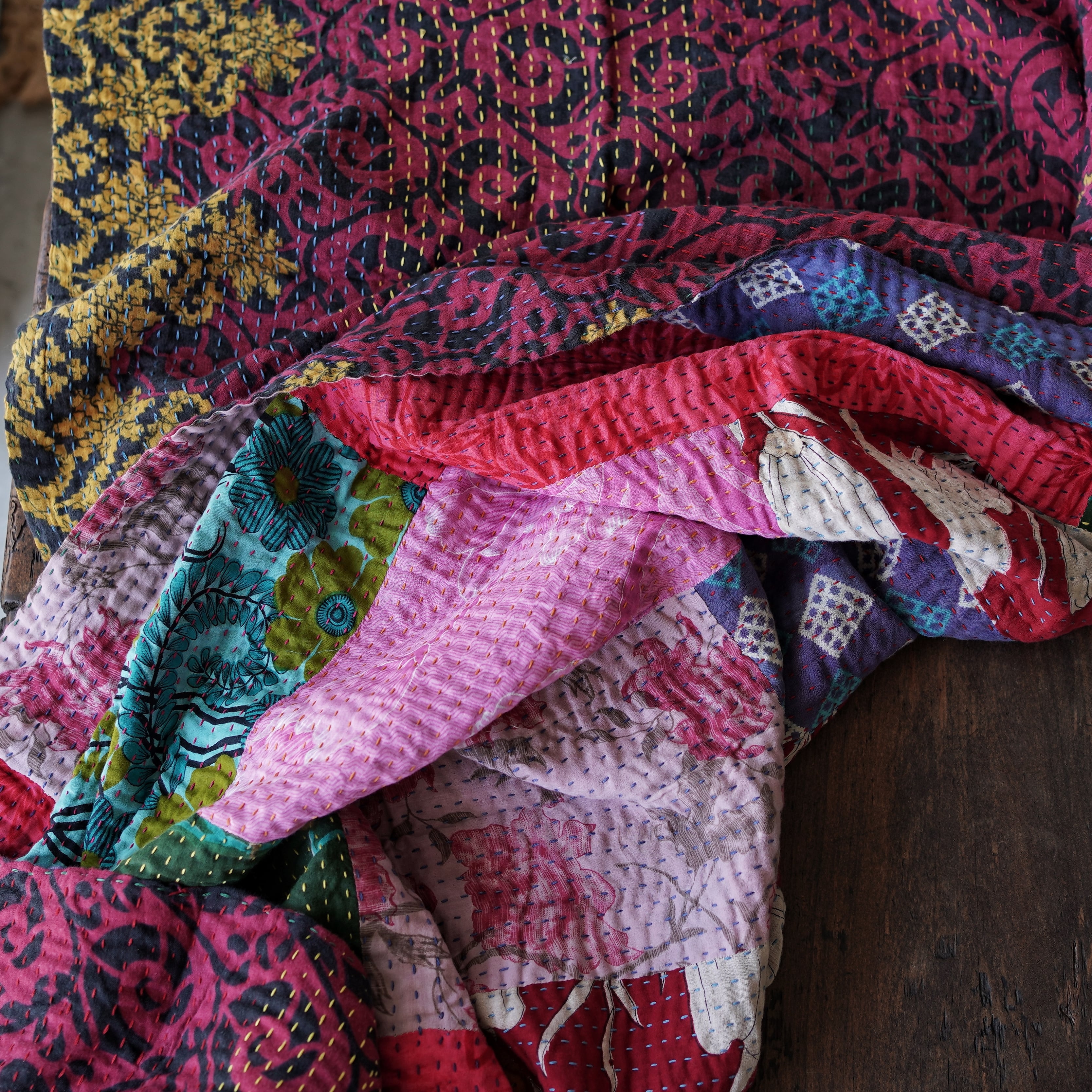 リサイクルサリーをランダムに使った、世界に1枚のパッチワーク調マルチカバー。