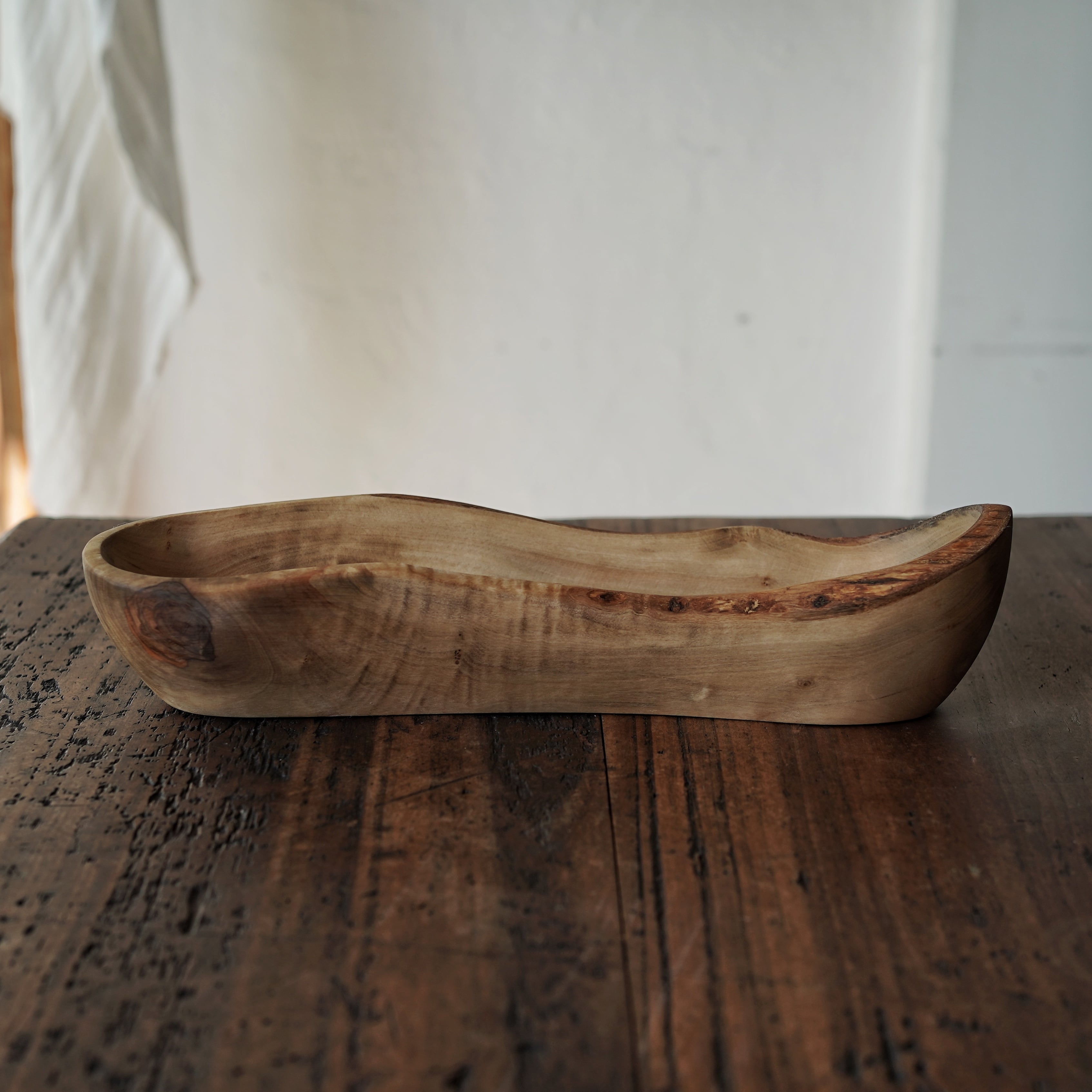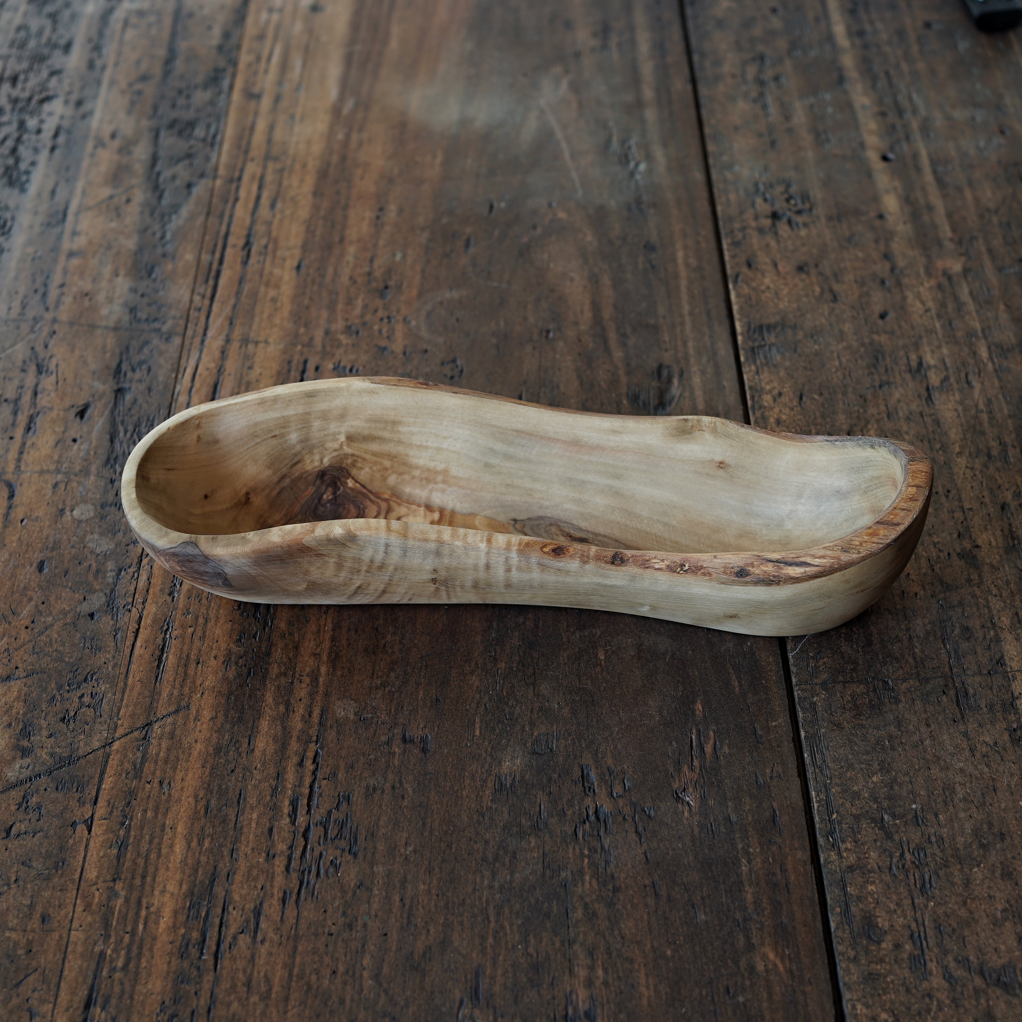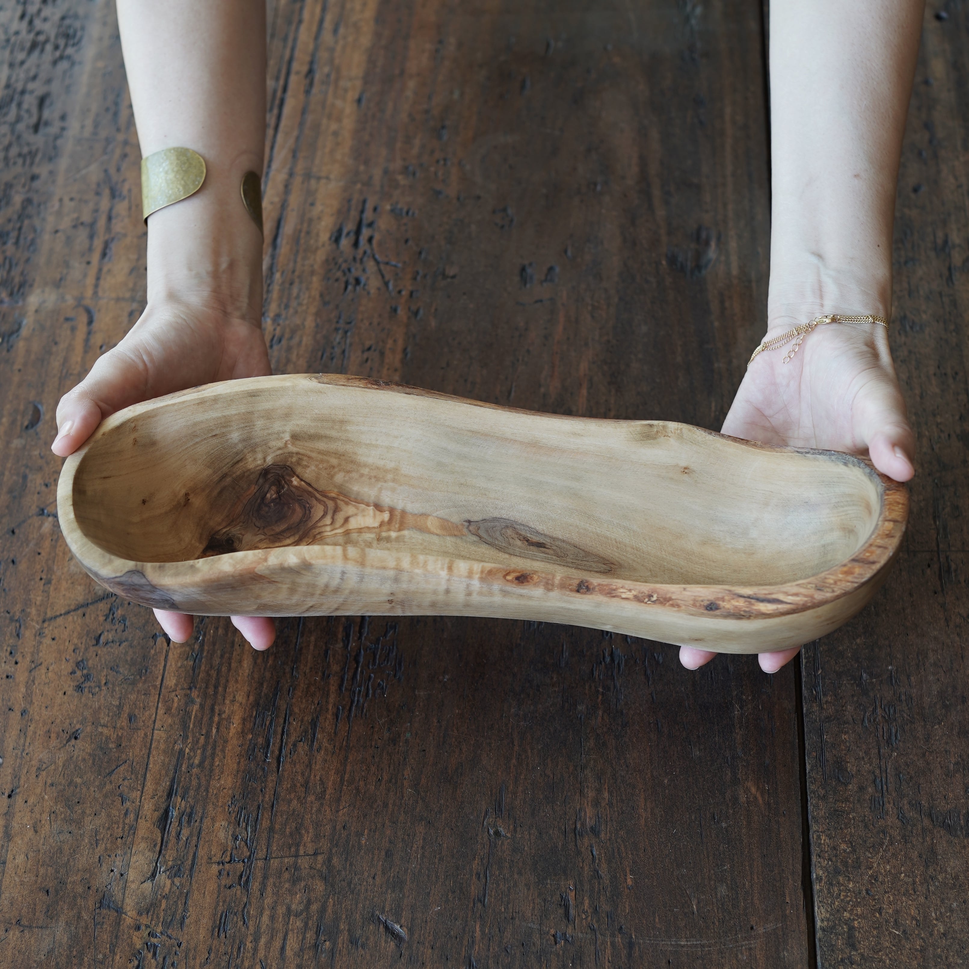 オリーブの木を丁寧に削り出して作られた、細長いフォルムのハンドクラフトトレイ。