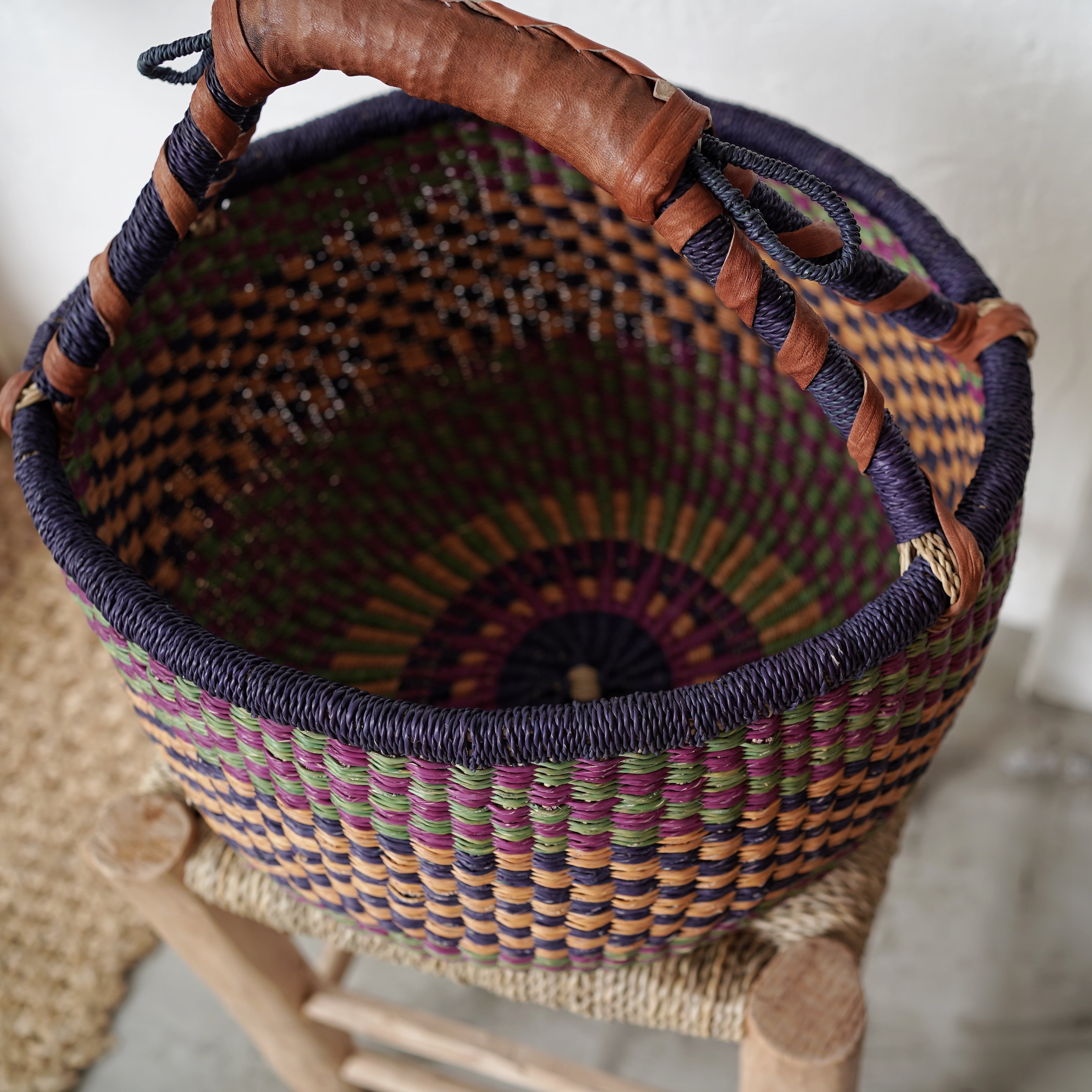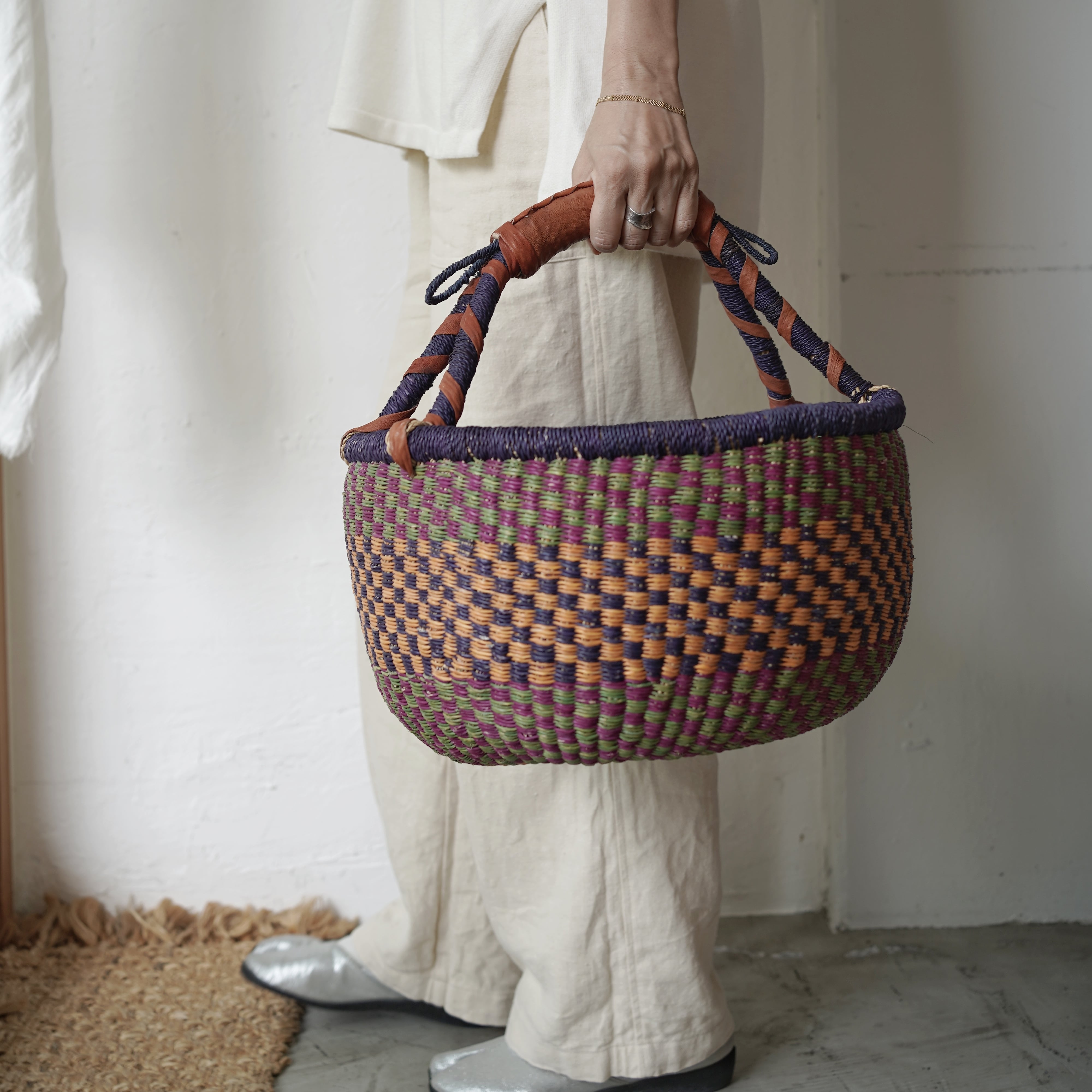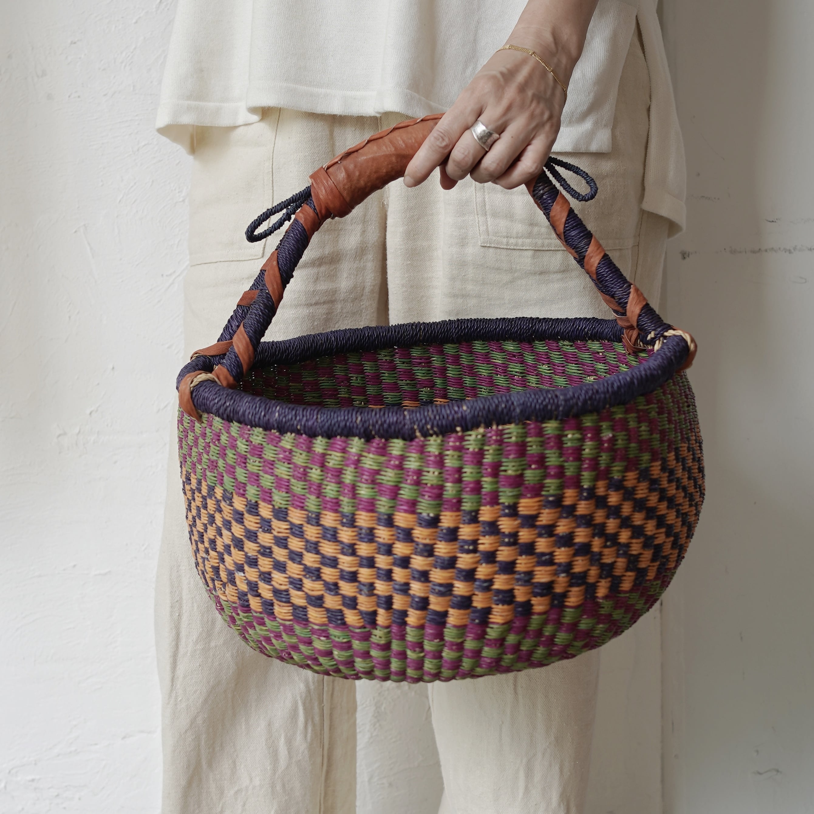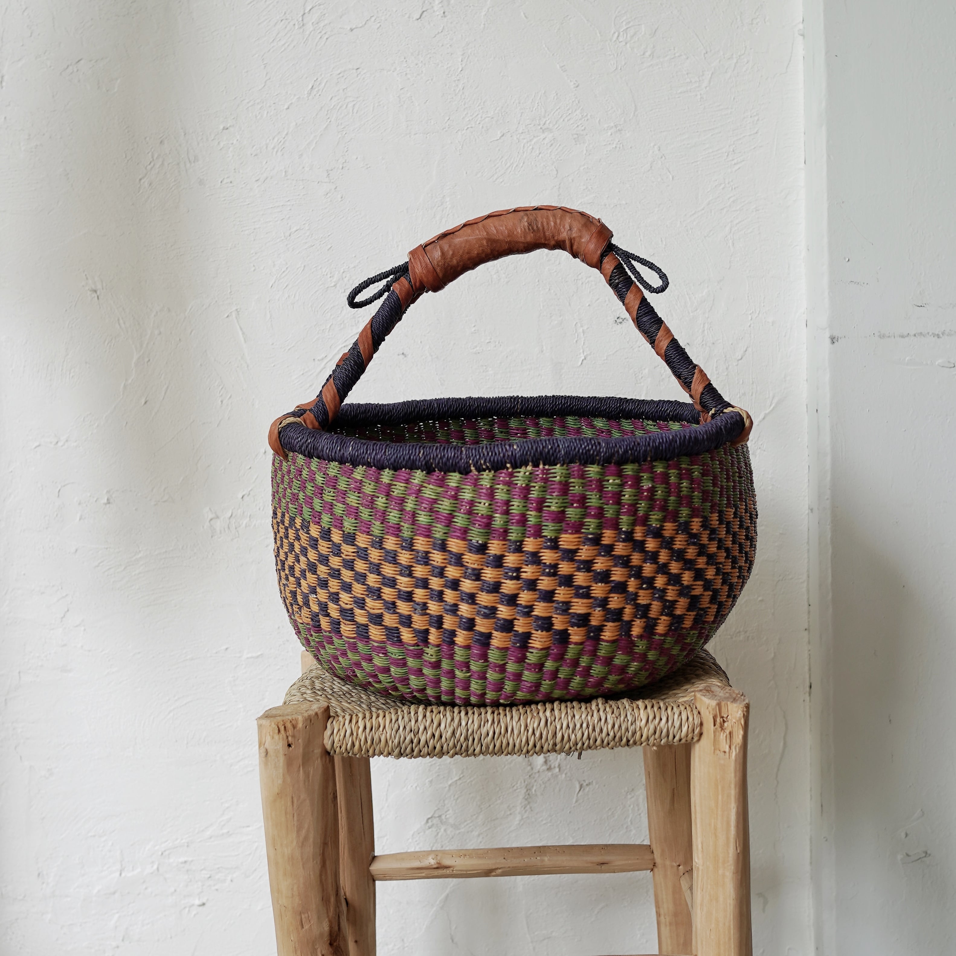 しなやかで丈夫なエレファントグラスを、職人それぞれの感性で色を組み合わせて編み上げた、カラフルなタイプです。