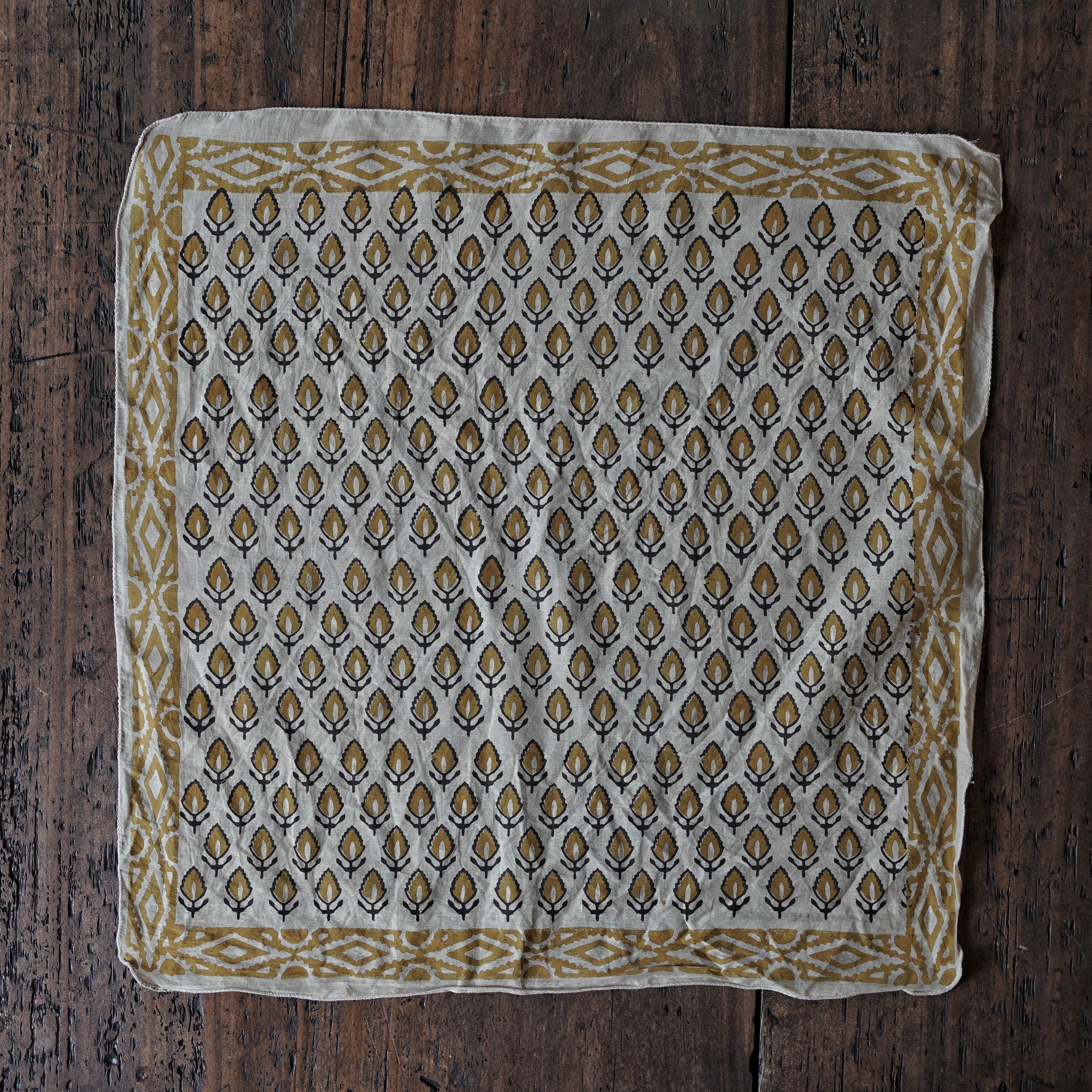 インドの職人によって、一枚一枚ていねいに木版で染め上げられたコットンバンダナ。