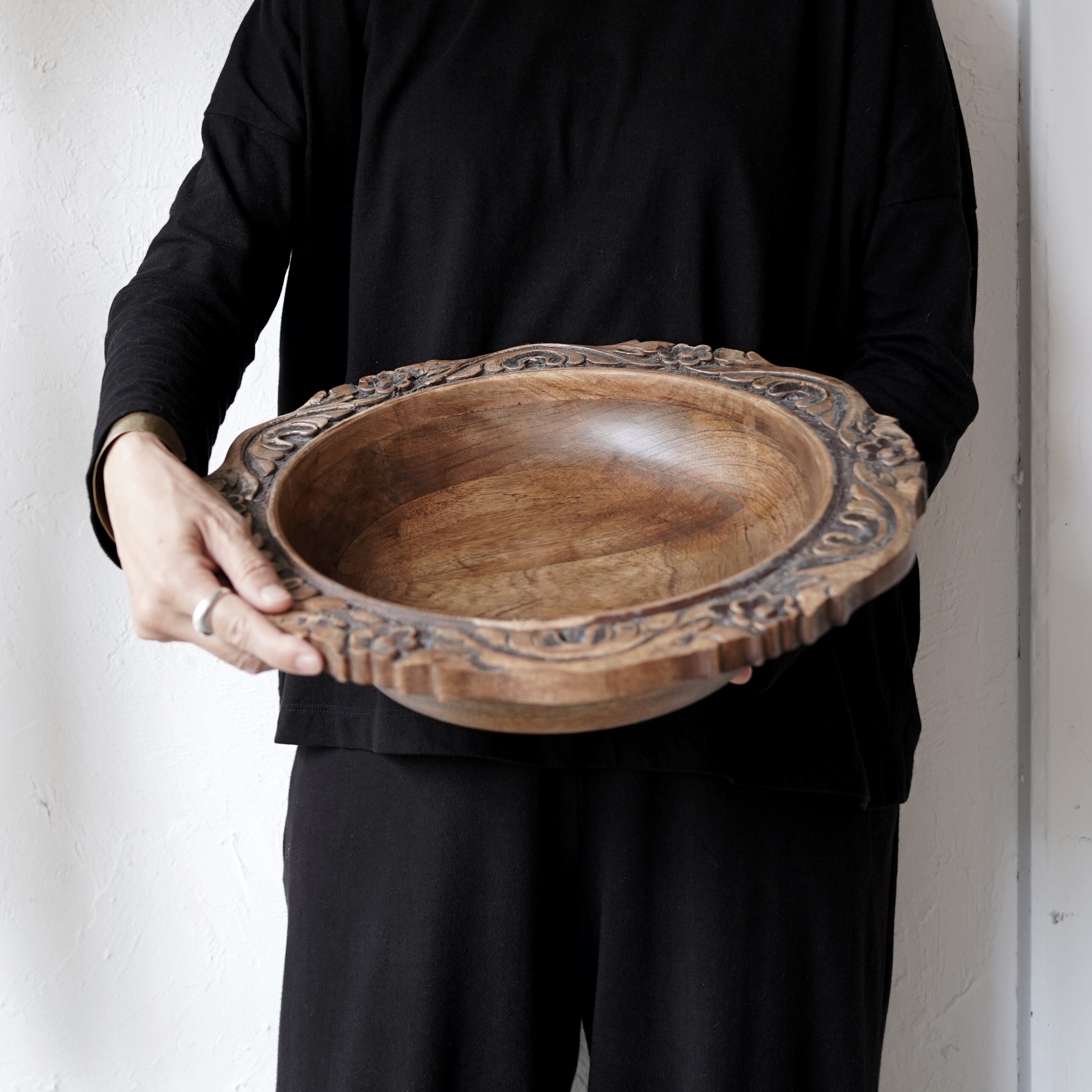 やわらかな木肌に浮かぶ自然の木目と、縁に施された植物モチーフの彫刻が美しく調和しています。