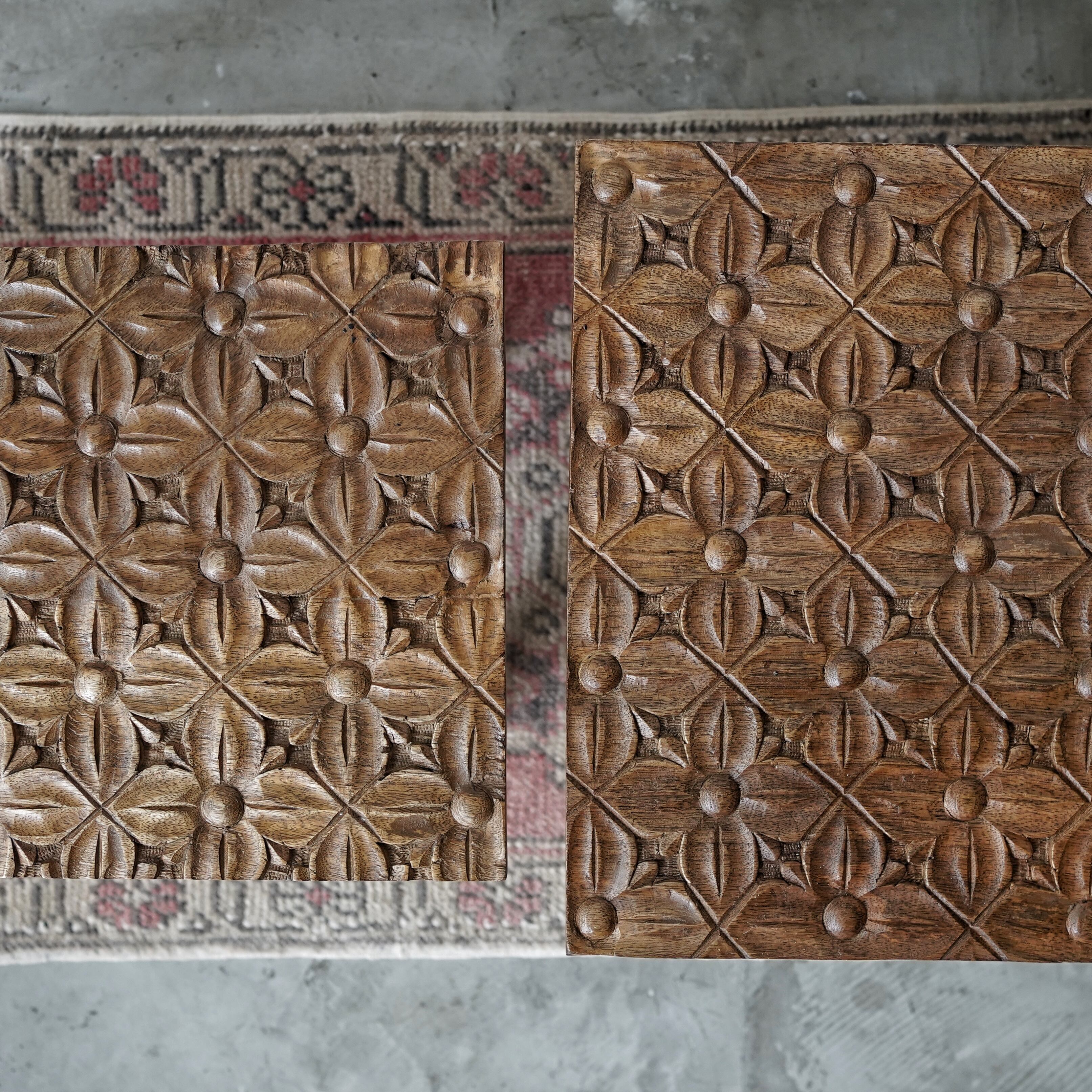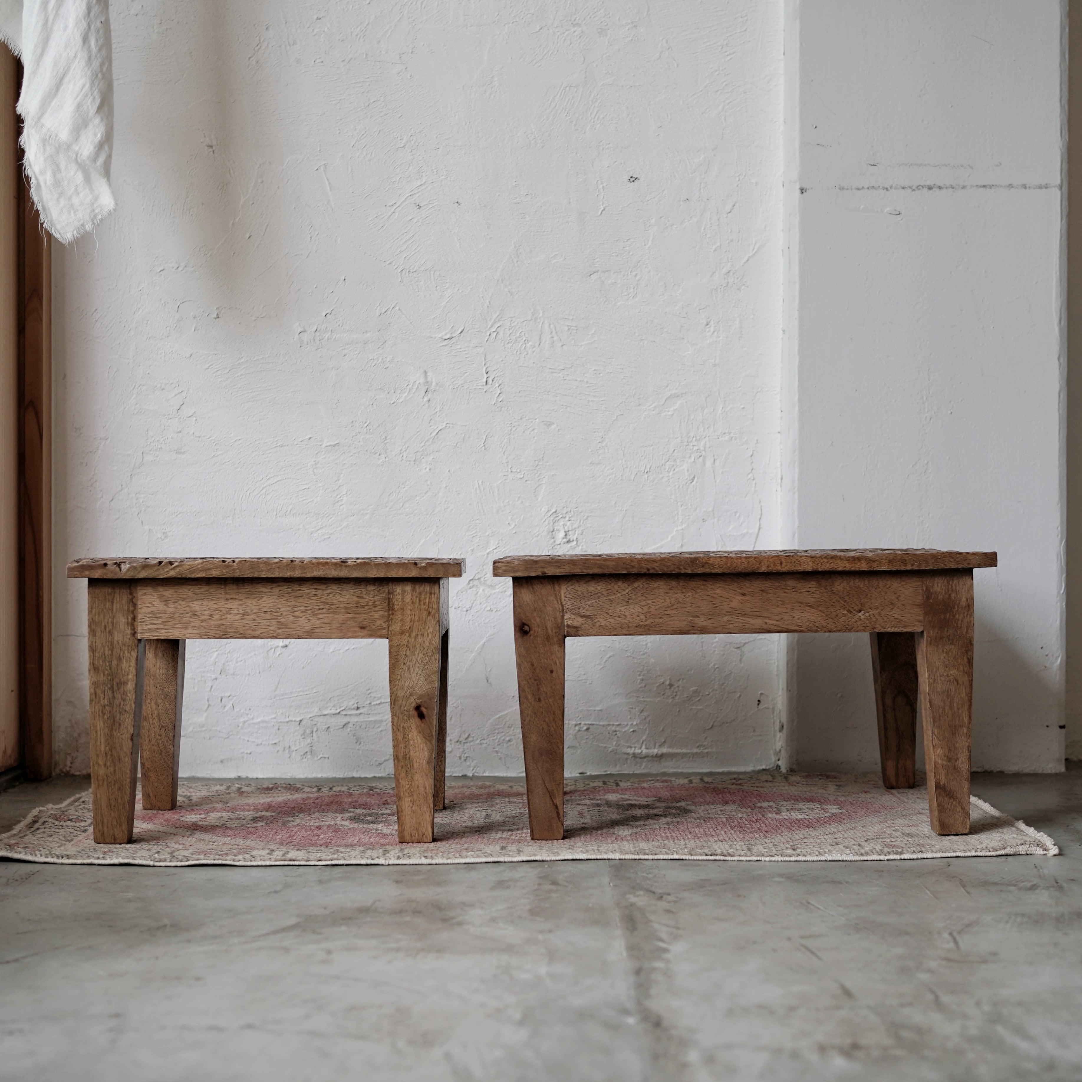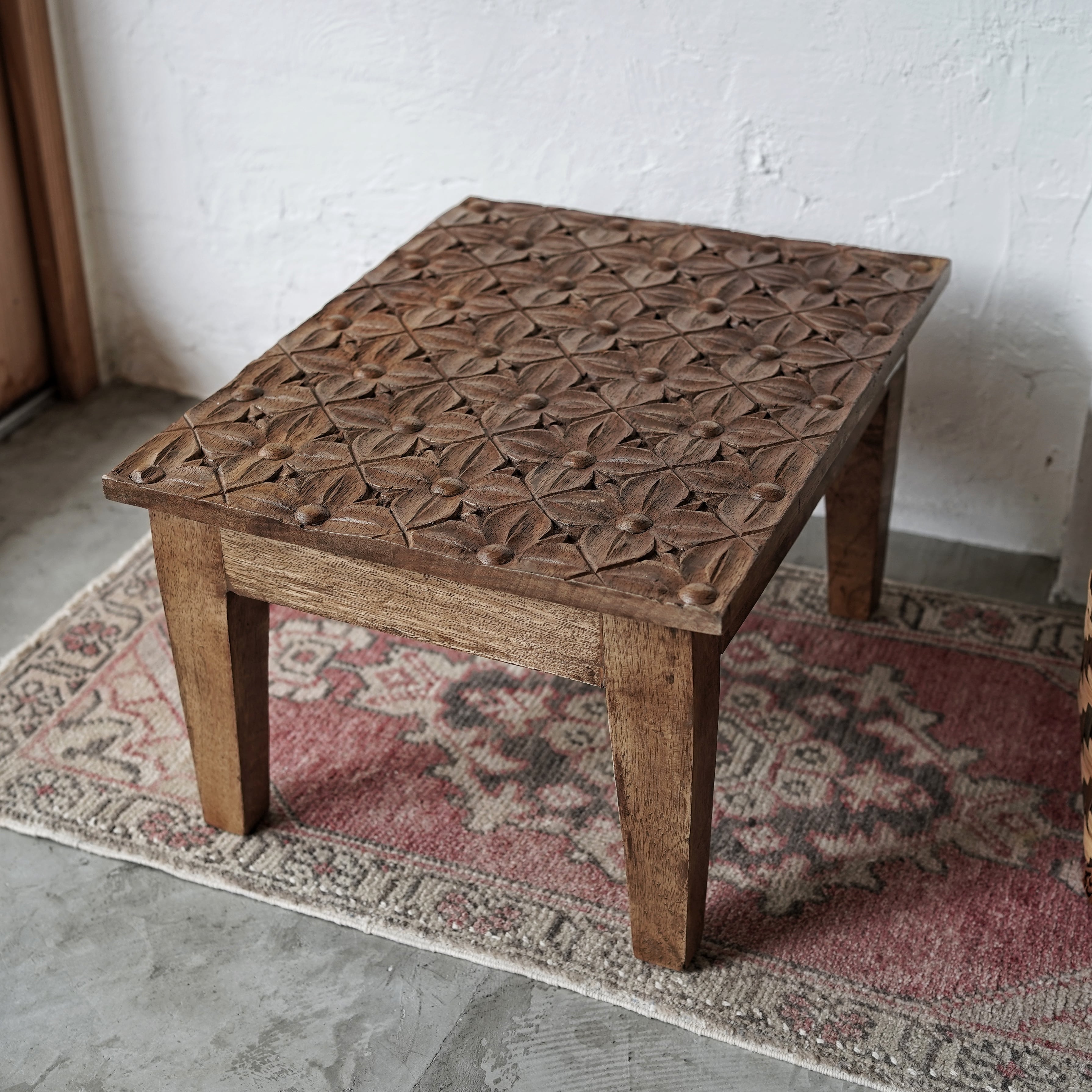 インドの職人によって丁寧に手彫りされた、マンゴーウッドのサイドテーブル。