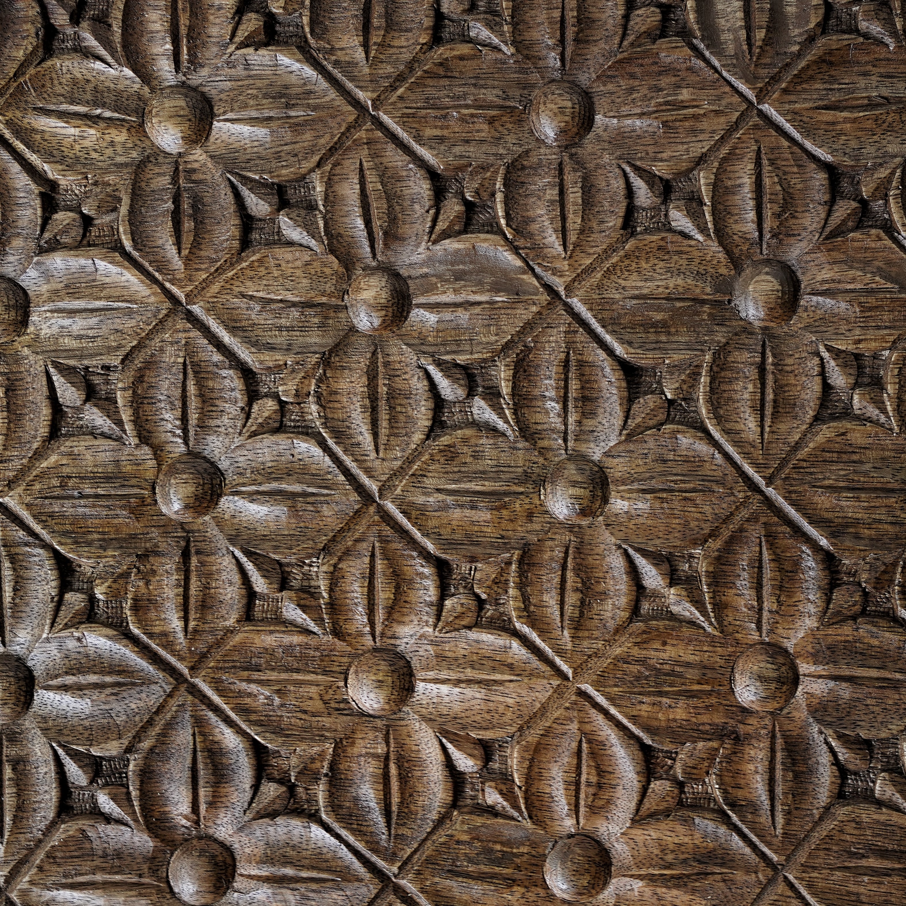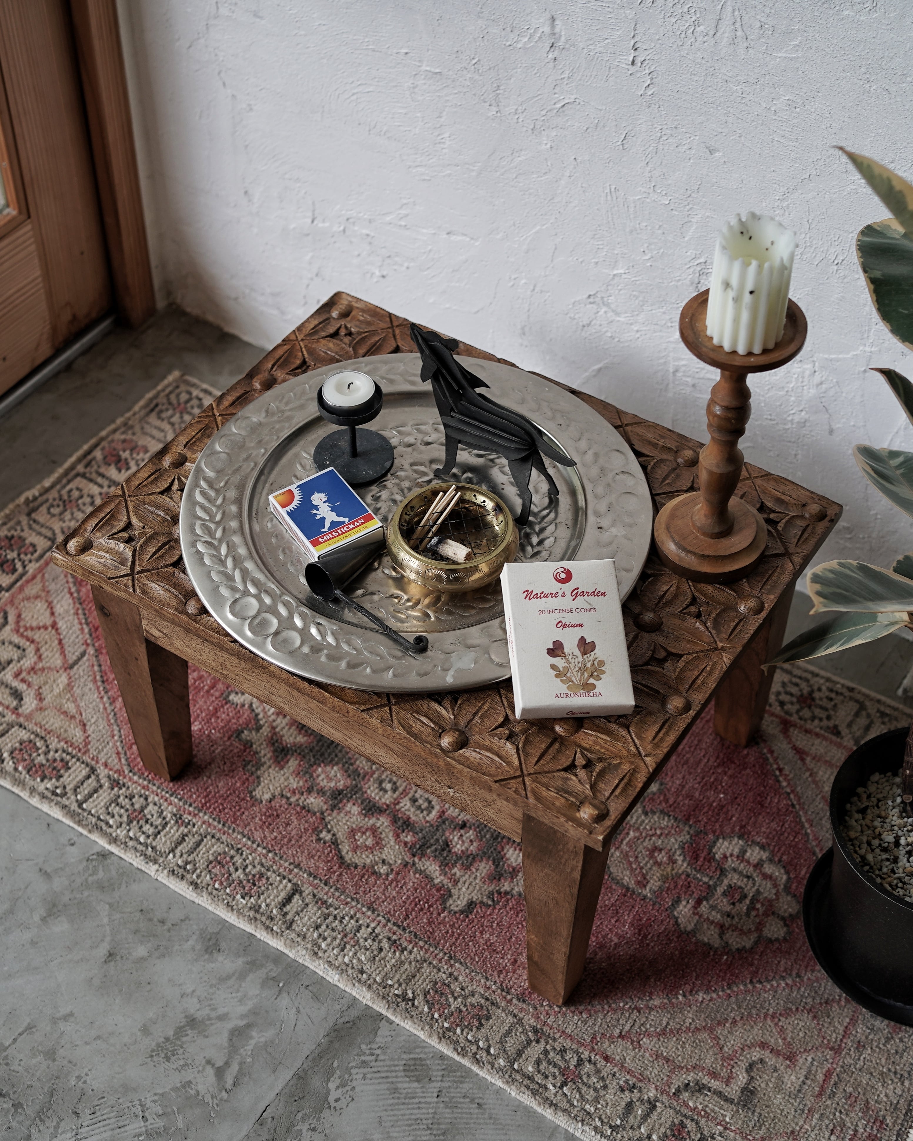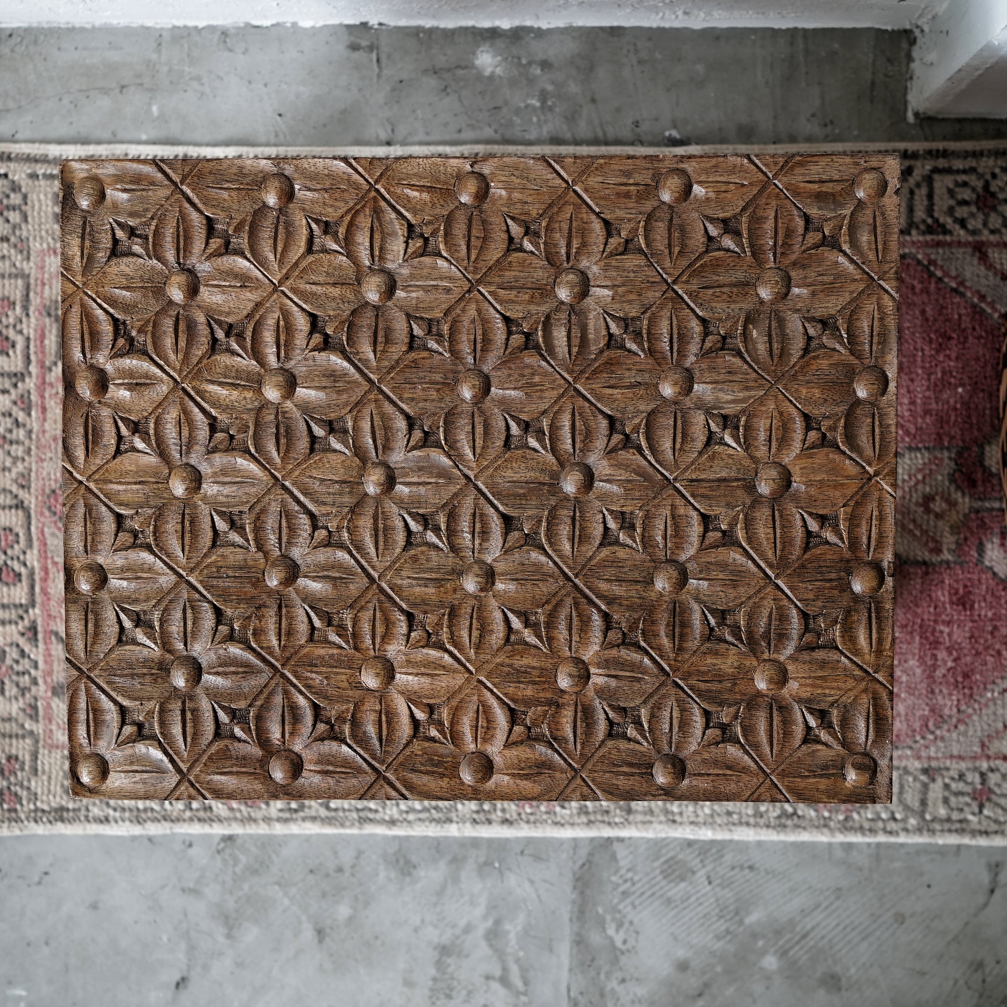 天板を覆うように施された花模様の彫刻が印象的で、アンティークのような存在感を放ちます。