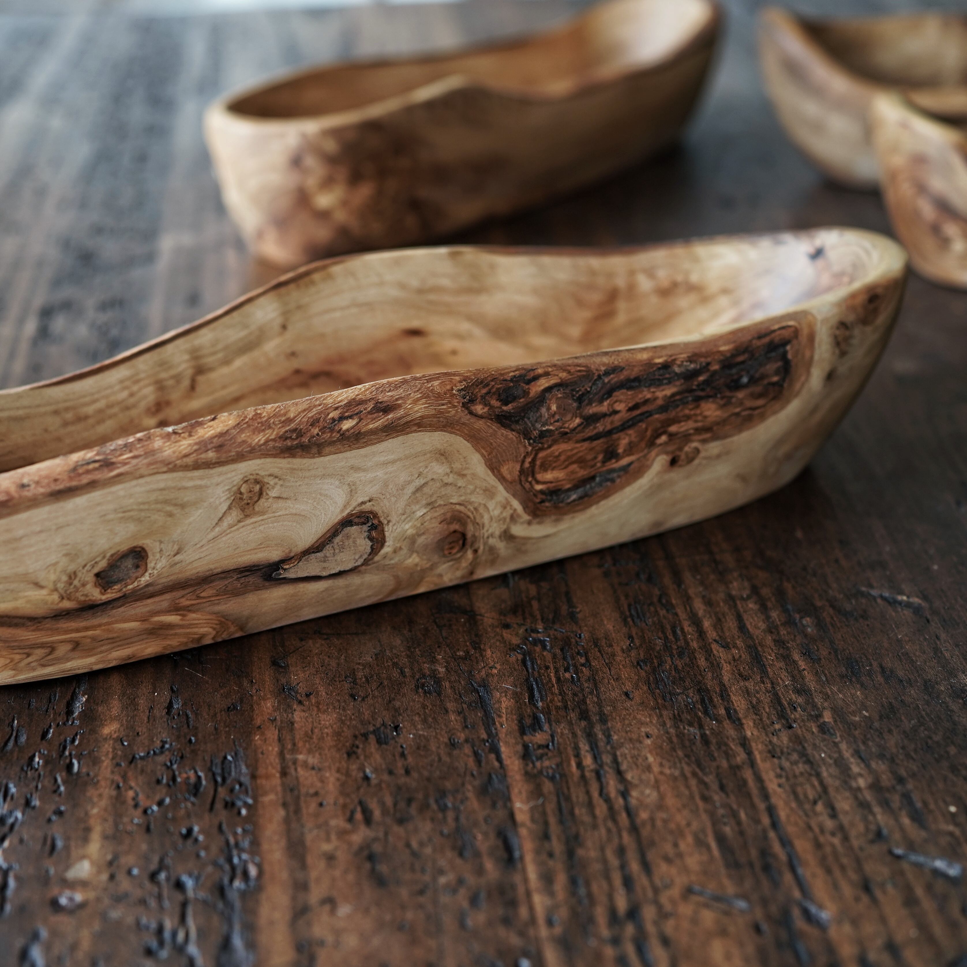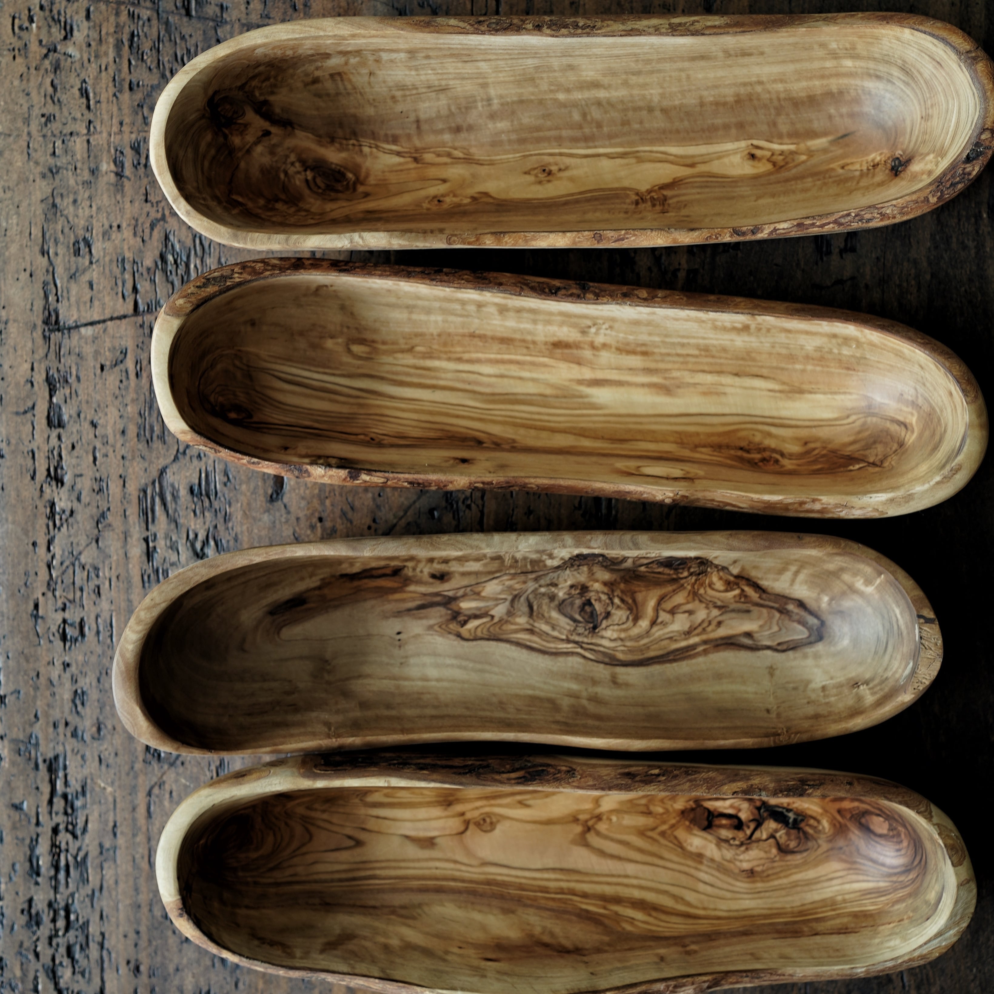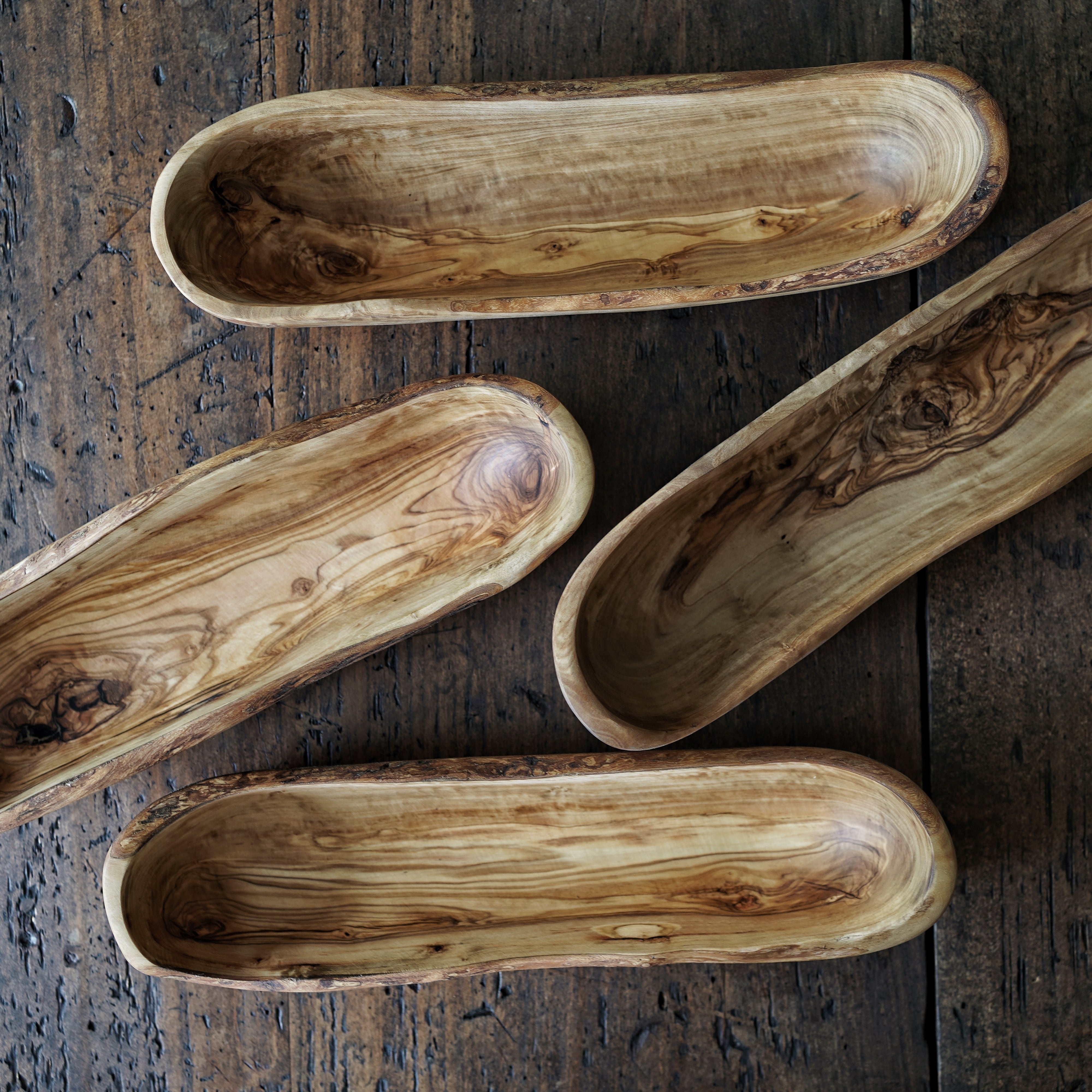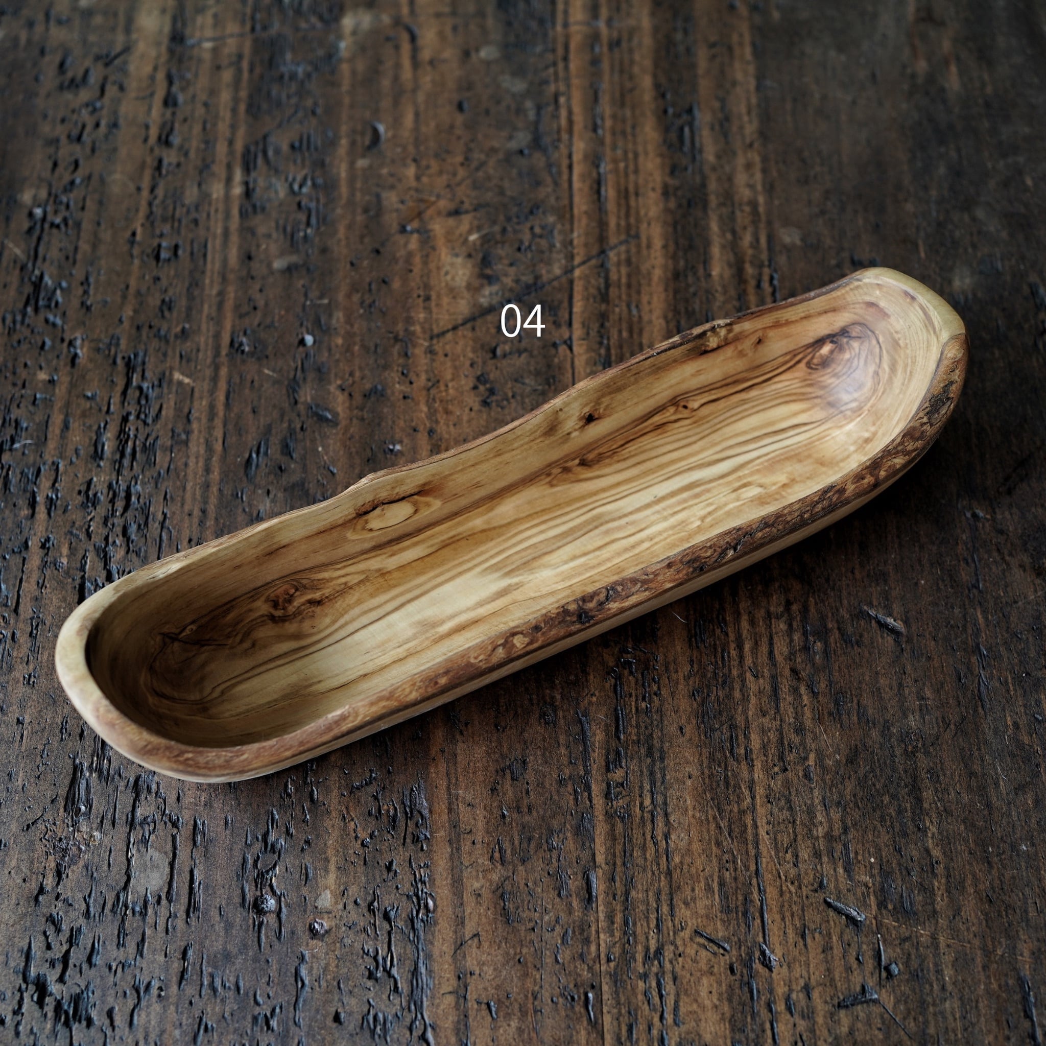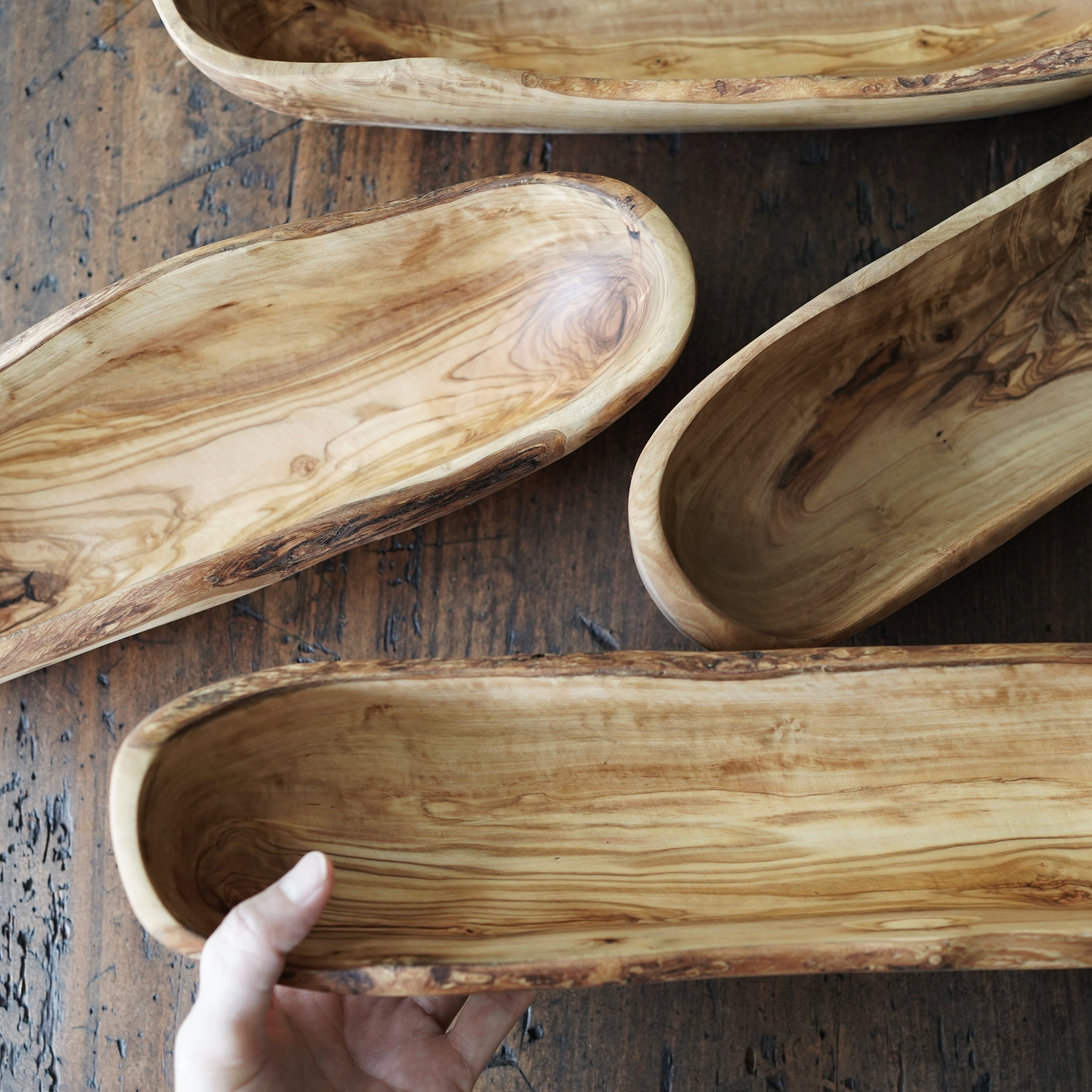オリーブの木を丁寧に削り出して作られた、細長いフォルムのハンドクラフトトレイ。