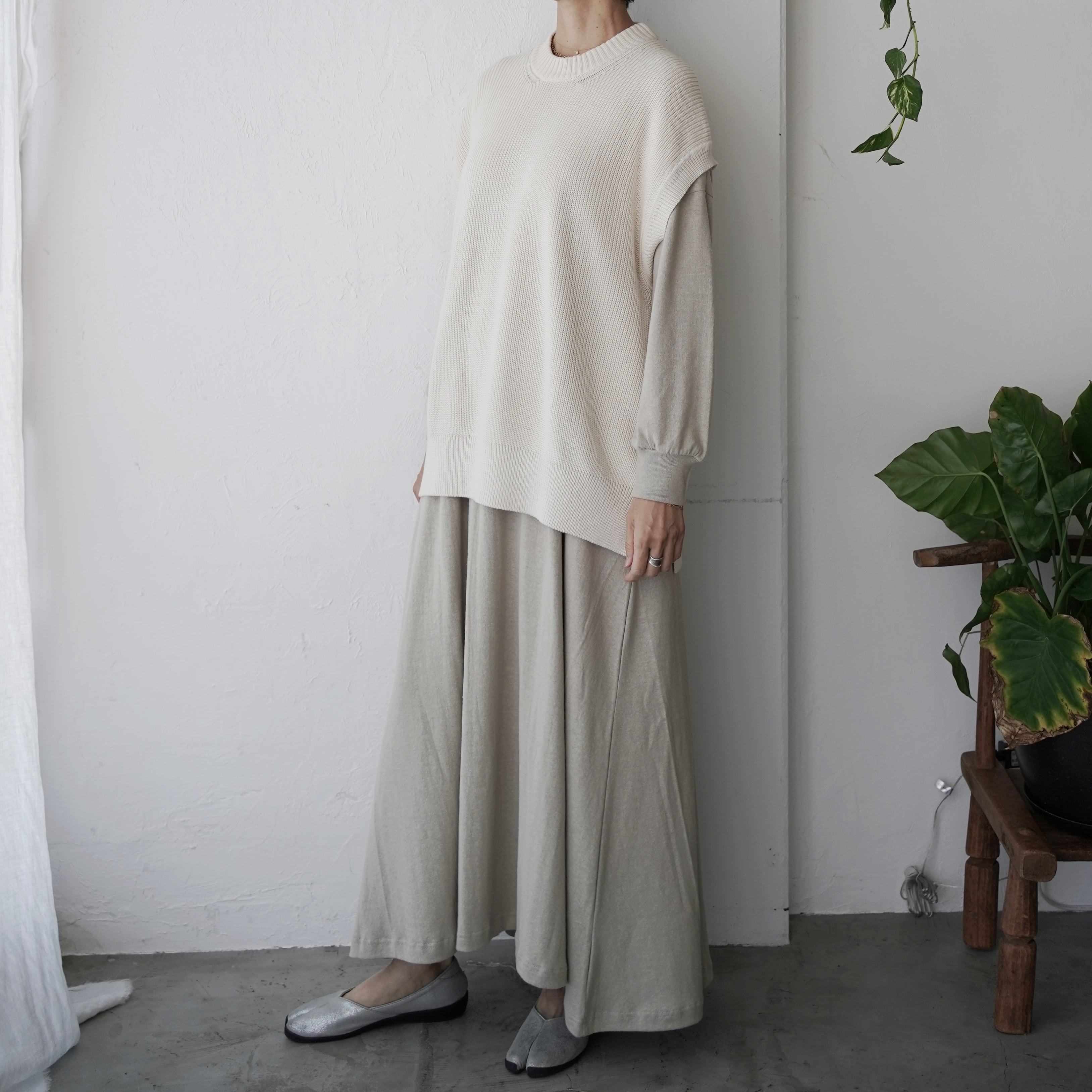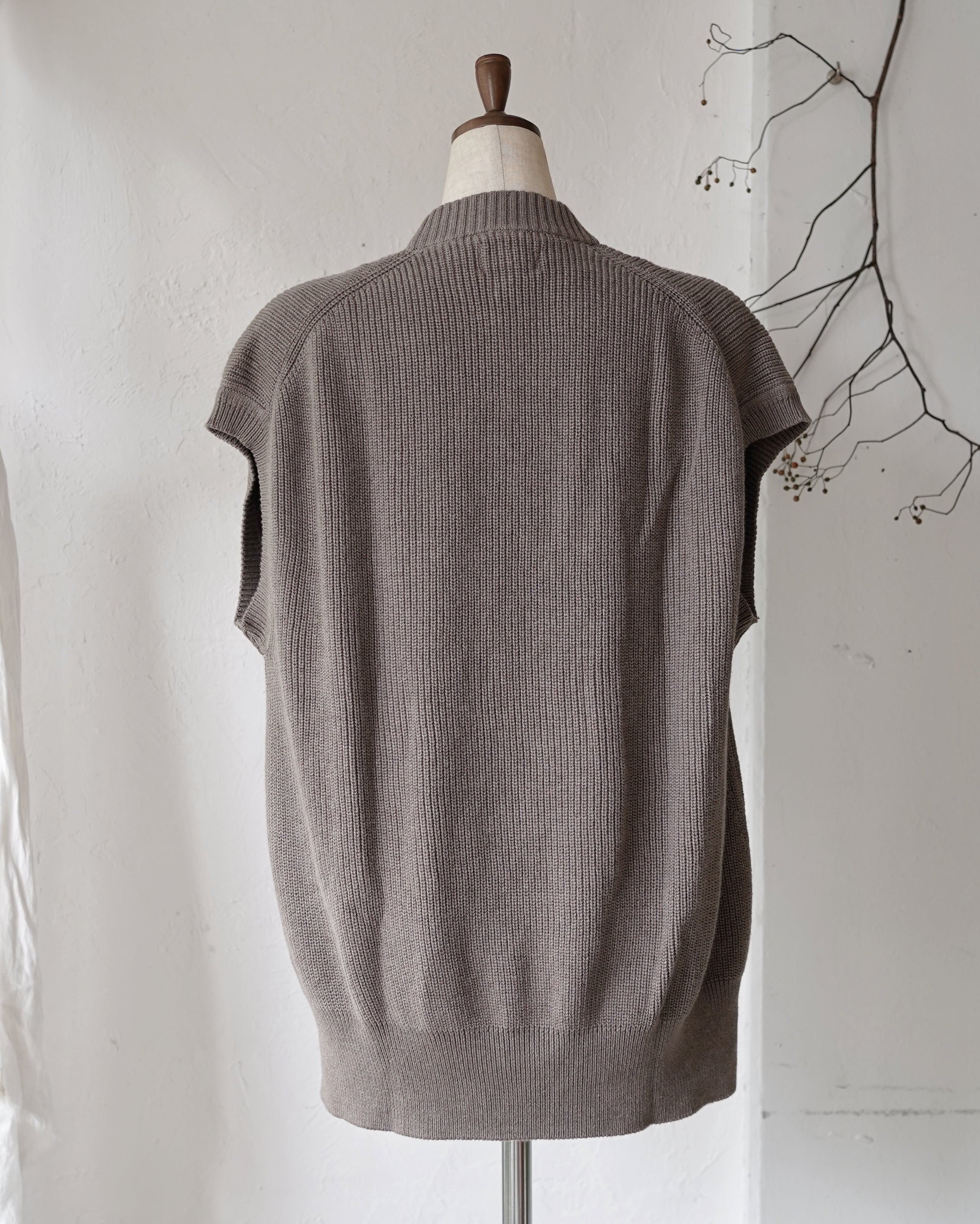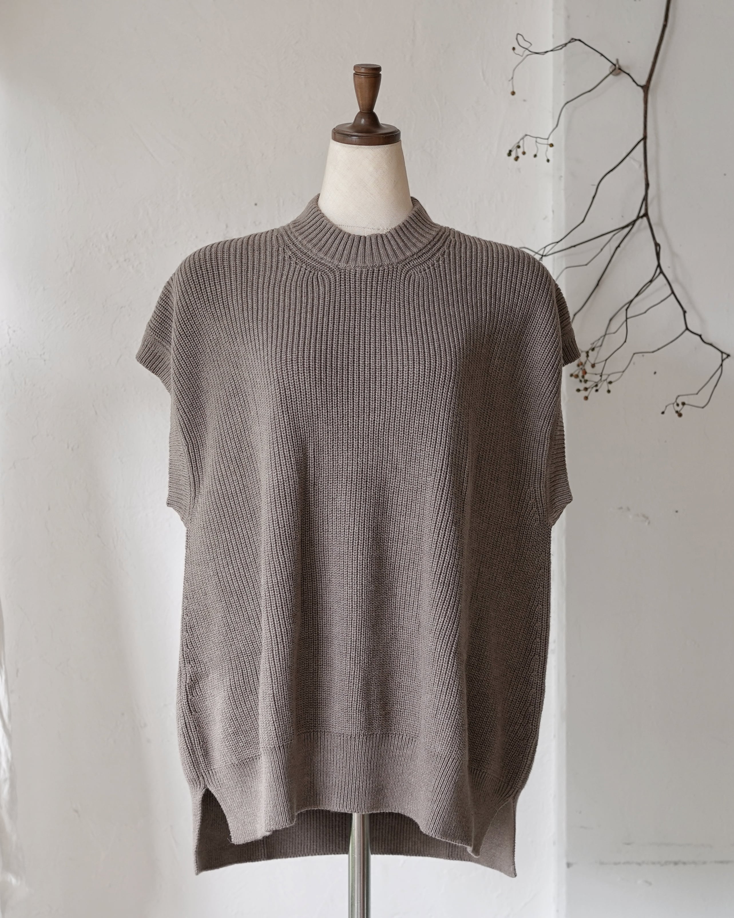 オーガニックコットンをたっぷりと編み立てた、片あぜ編みのクルーネックベスト。