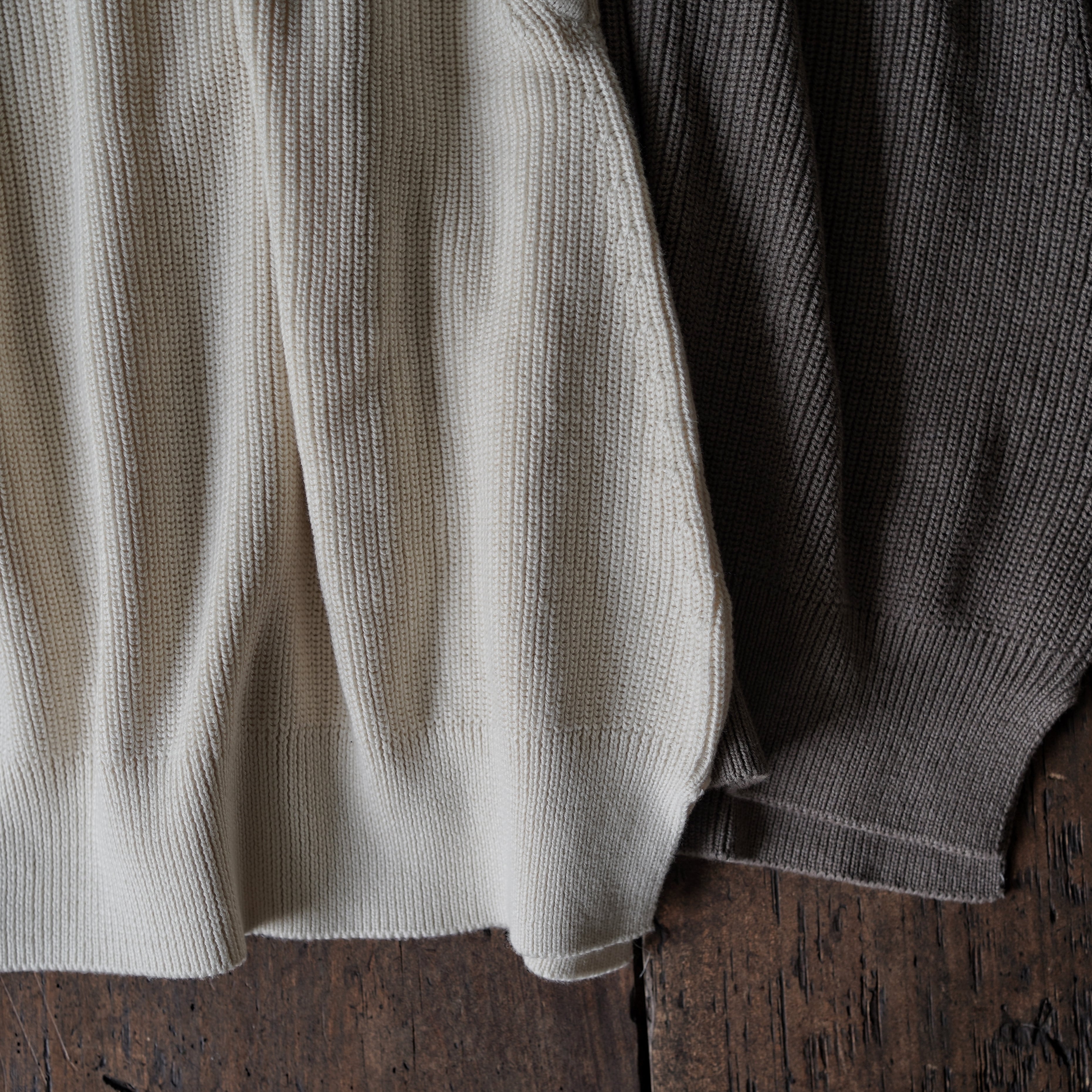 ミドルゲージの編地に、ゴム編みとタック編みを組み合わせることで、ほどよい厚みと立体感のある仕上がりになっています。ややワイドなボクシーシルエットで、サイドにはスリット入り。後ろ丈を少し長めにとっているので、腰まわりをさり気なくカバーしてくれます。