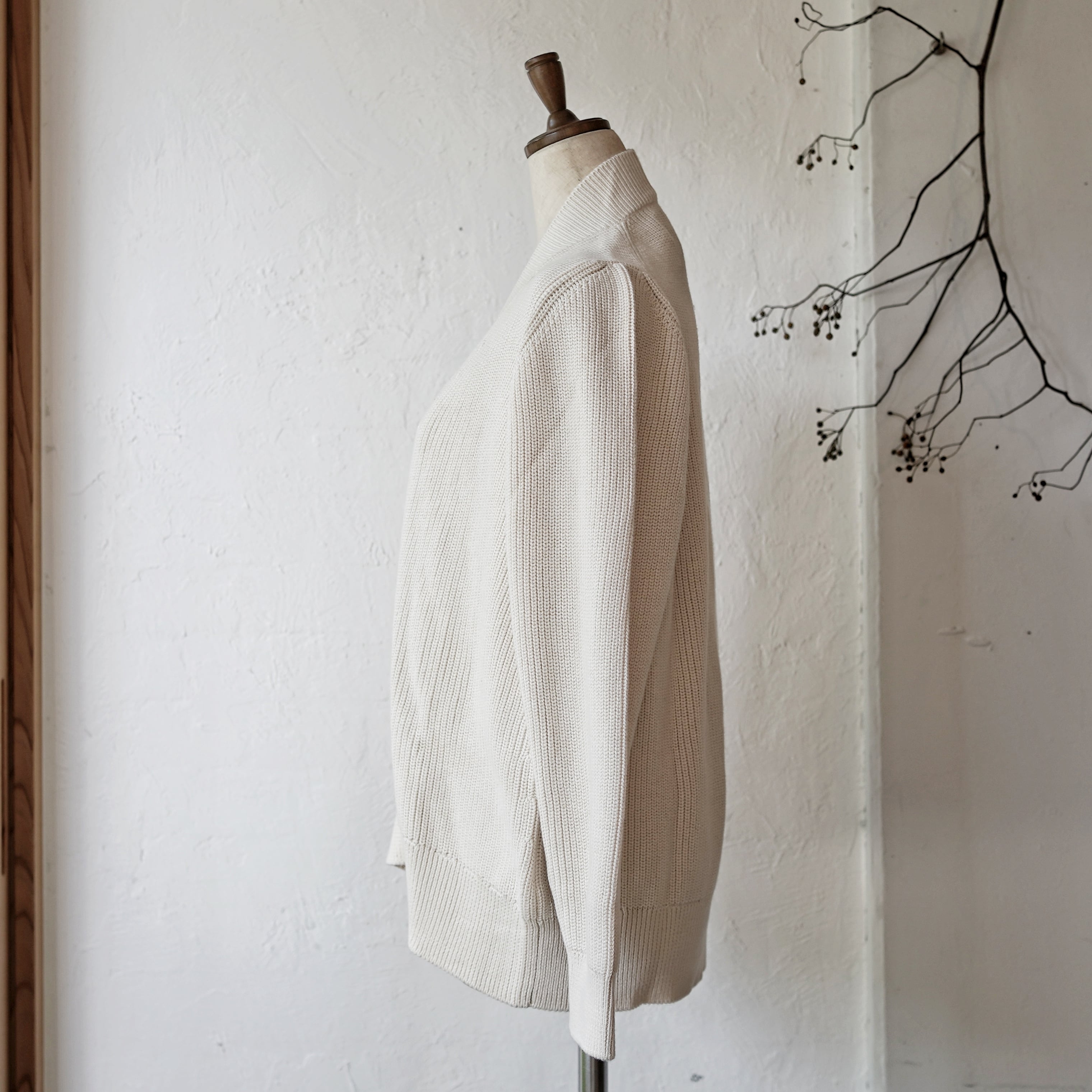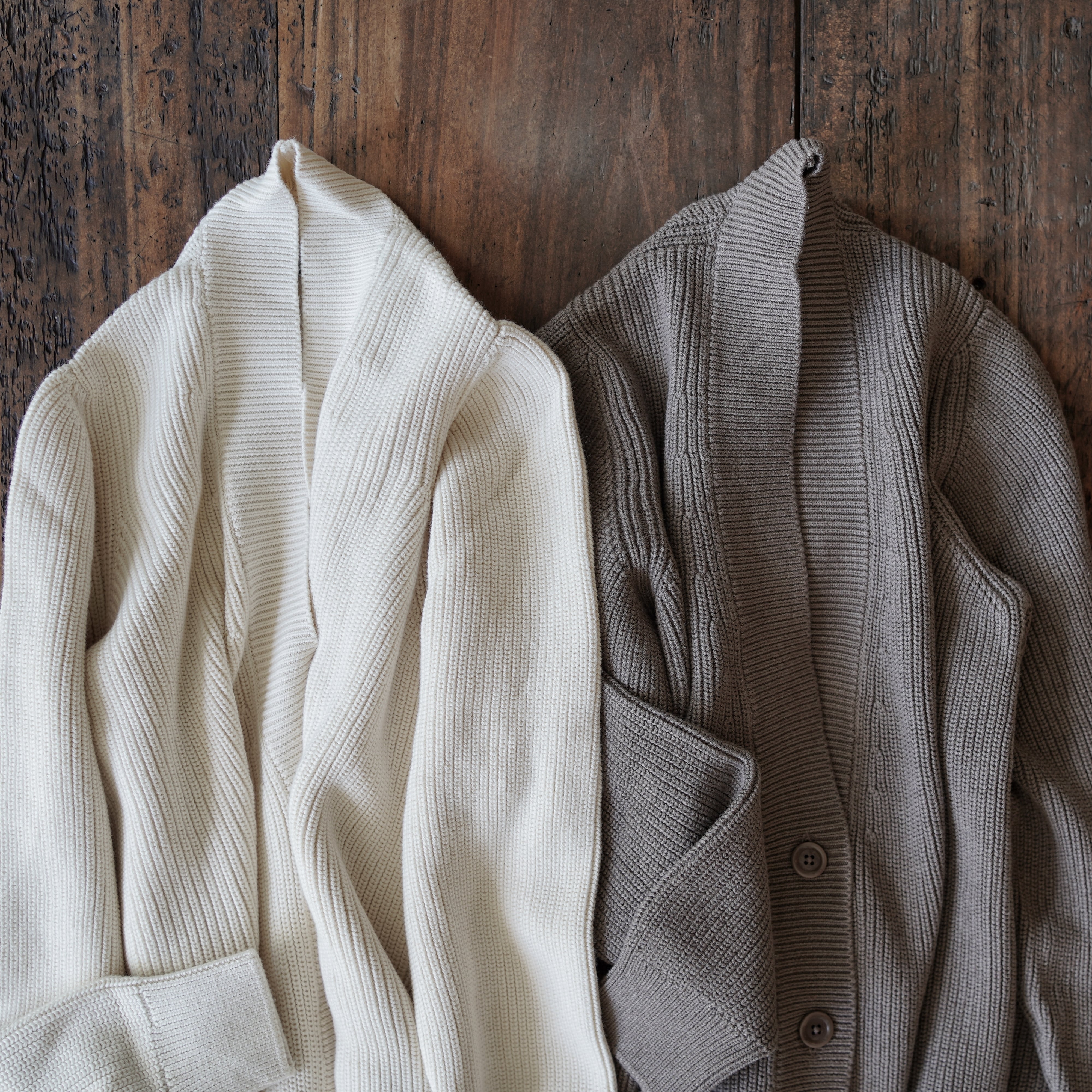 やわらかなオーガニックコットンを片あぜ編みに仕立てた、コクーンシルエットのカーディガン。