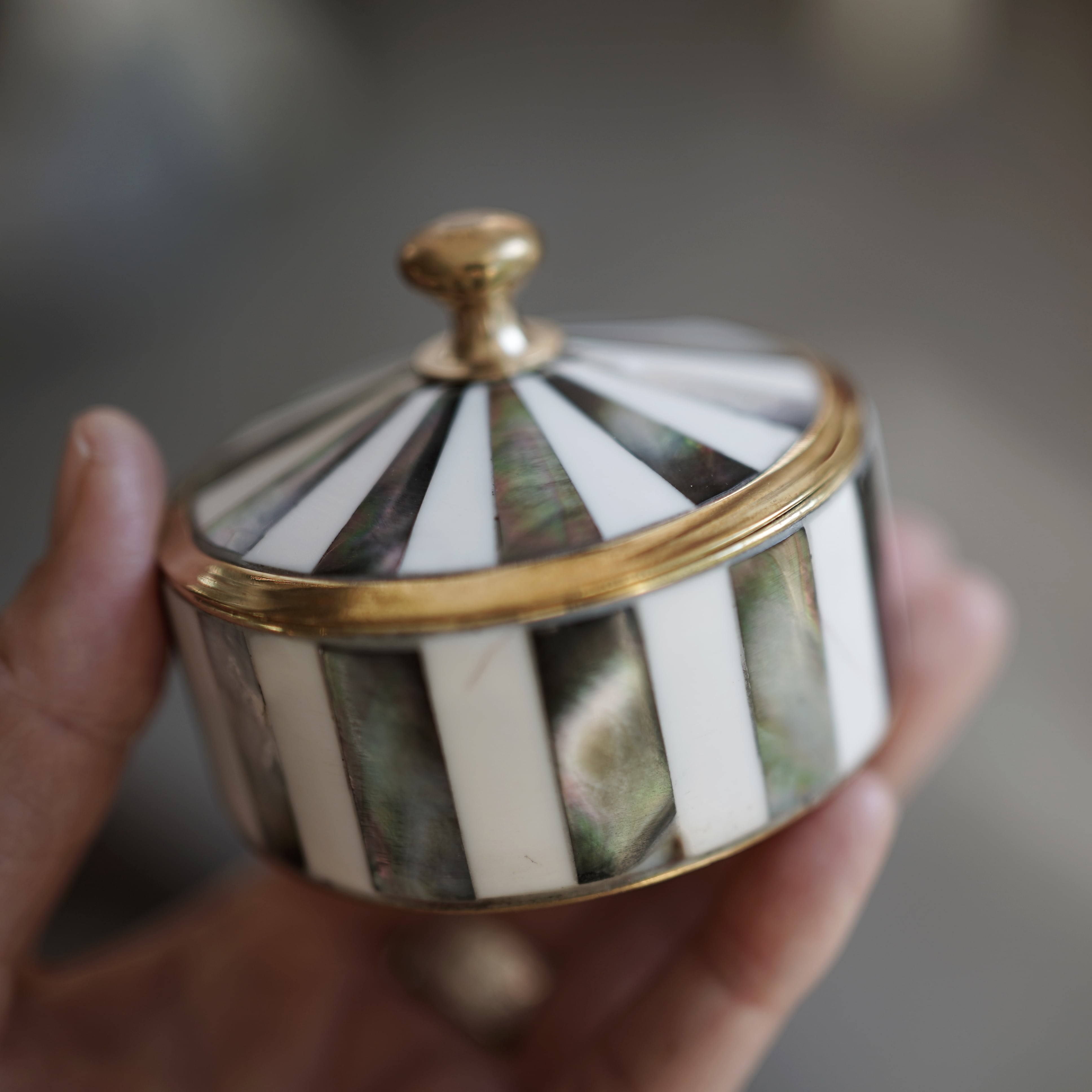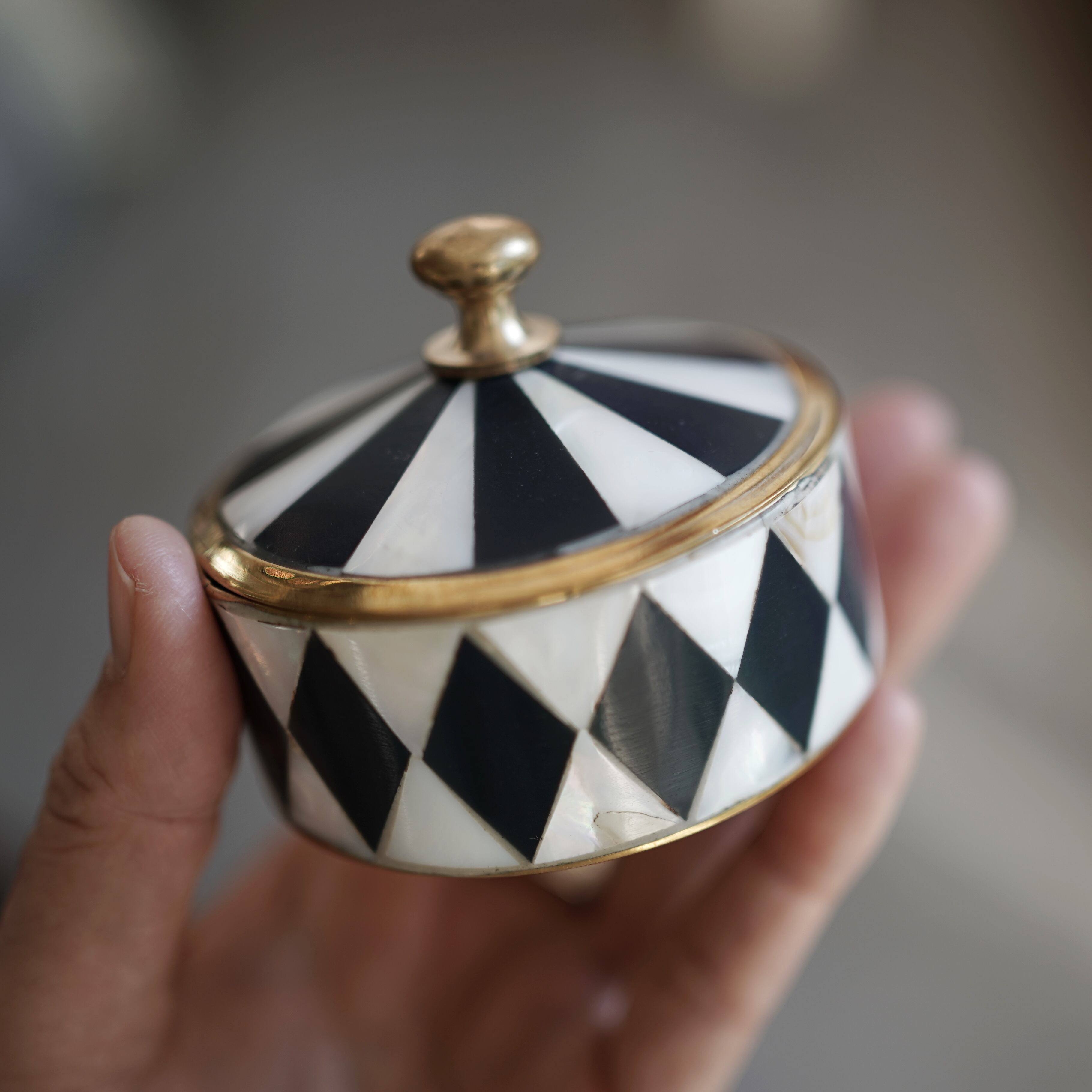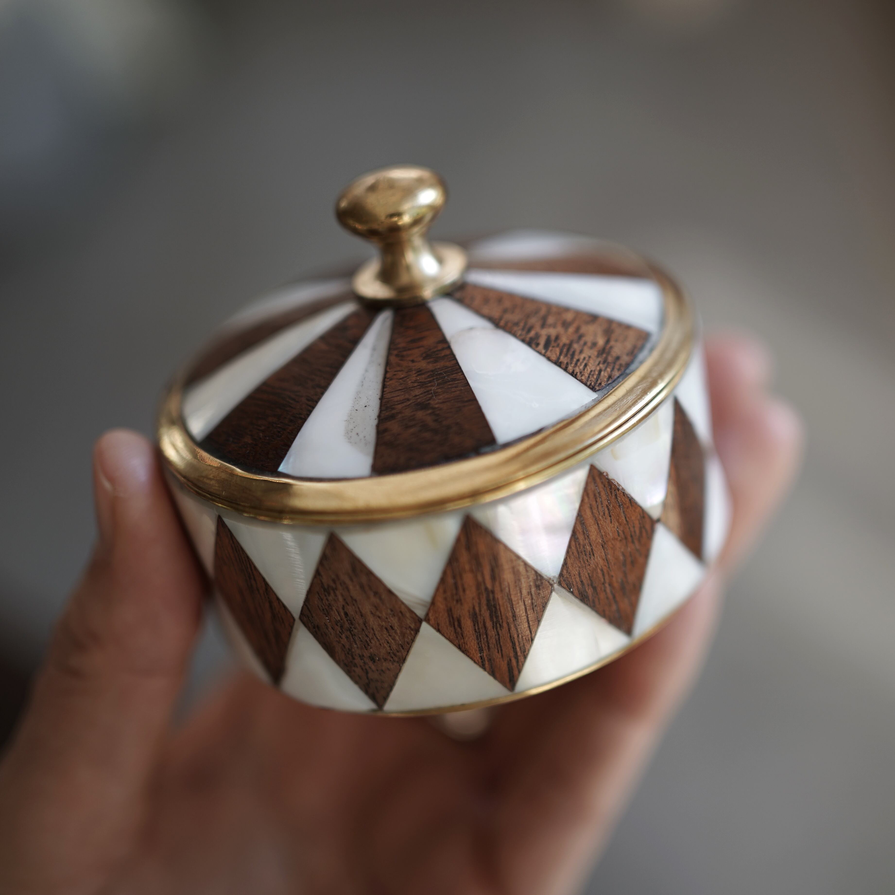 真鍮特有の落ち着いた光沢と、蓋に施されたマザーオブパールの細やかな装飾が時を重ねるように馴染み、静かな存在感を放ちます。