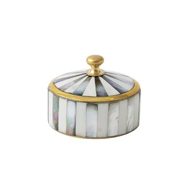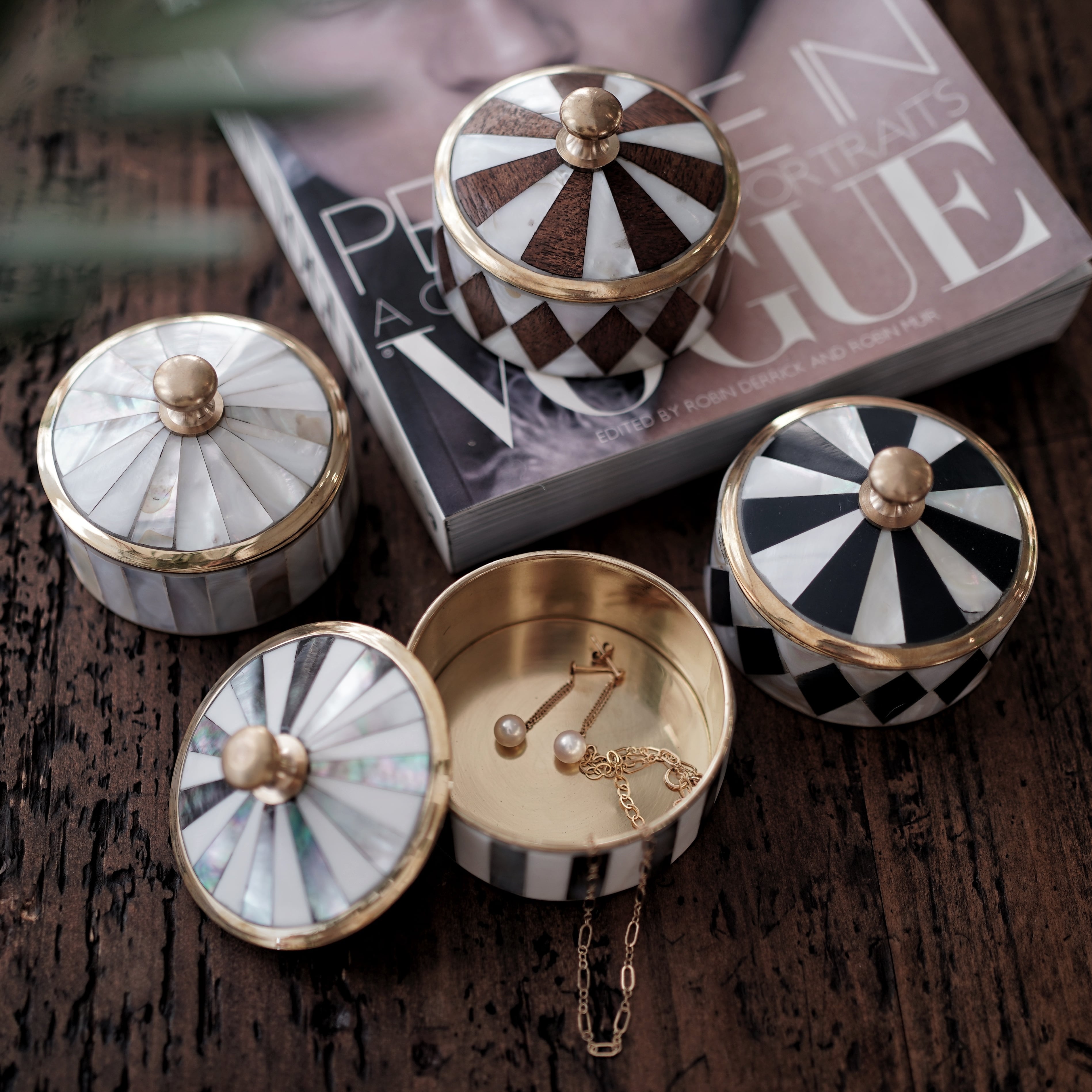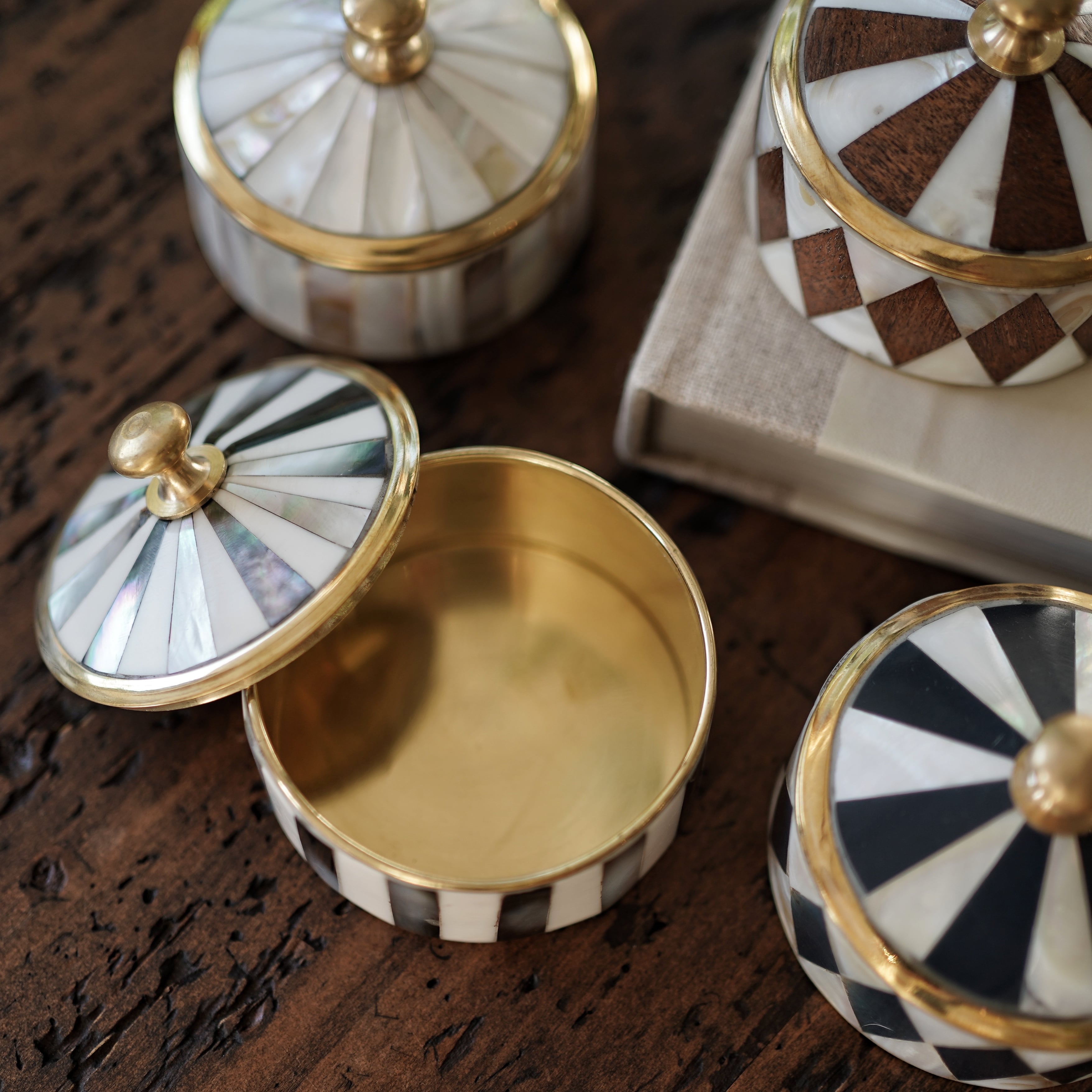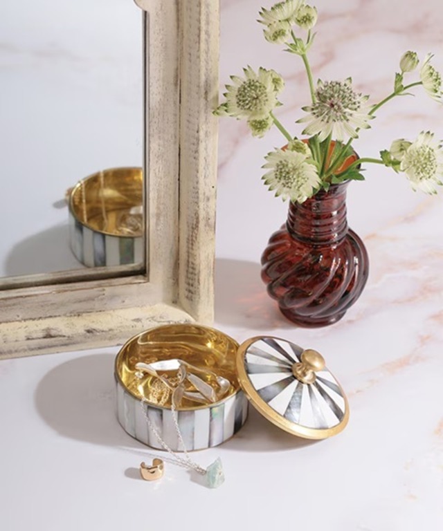 真鍮特有の落ち着いた光沢と、蓋に施されたマザーオブパールの細やかな装飾が時を重ねるように馴染み、静かな存在感を放ちます。
