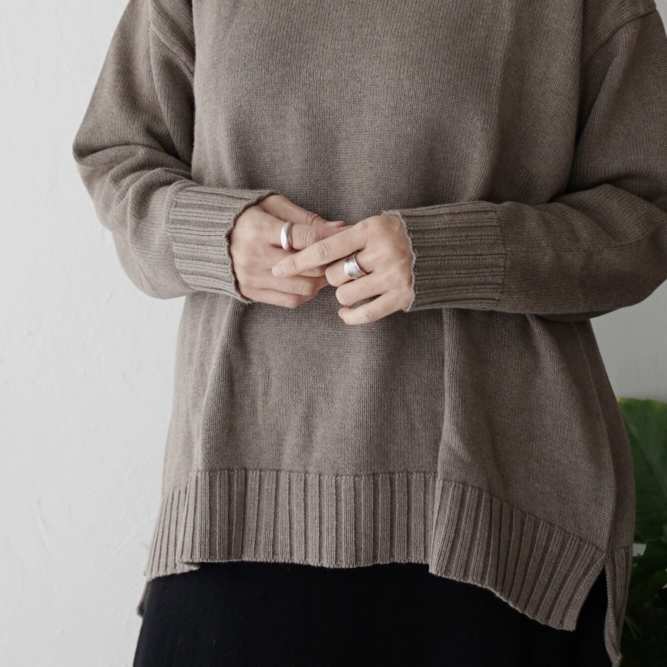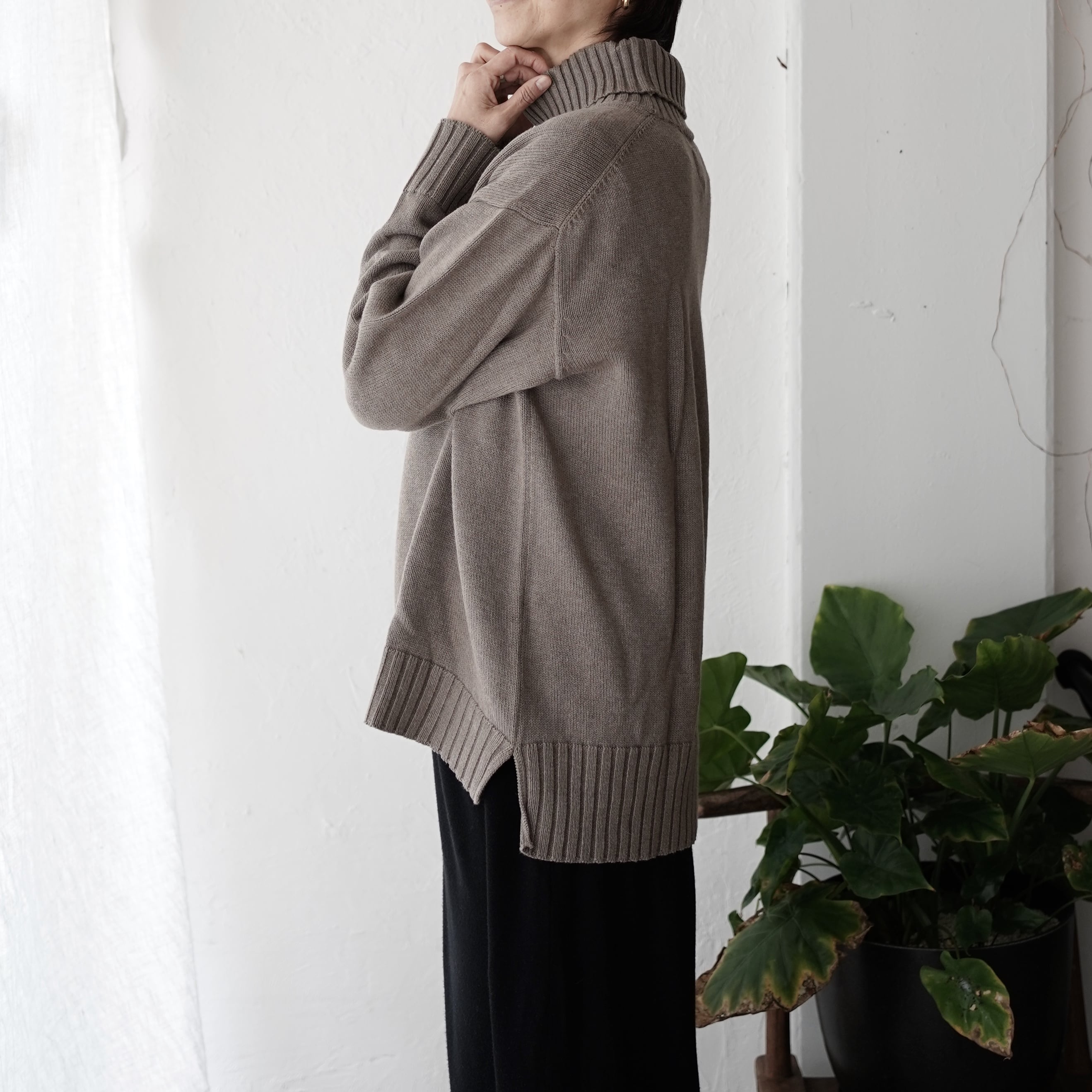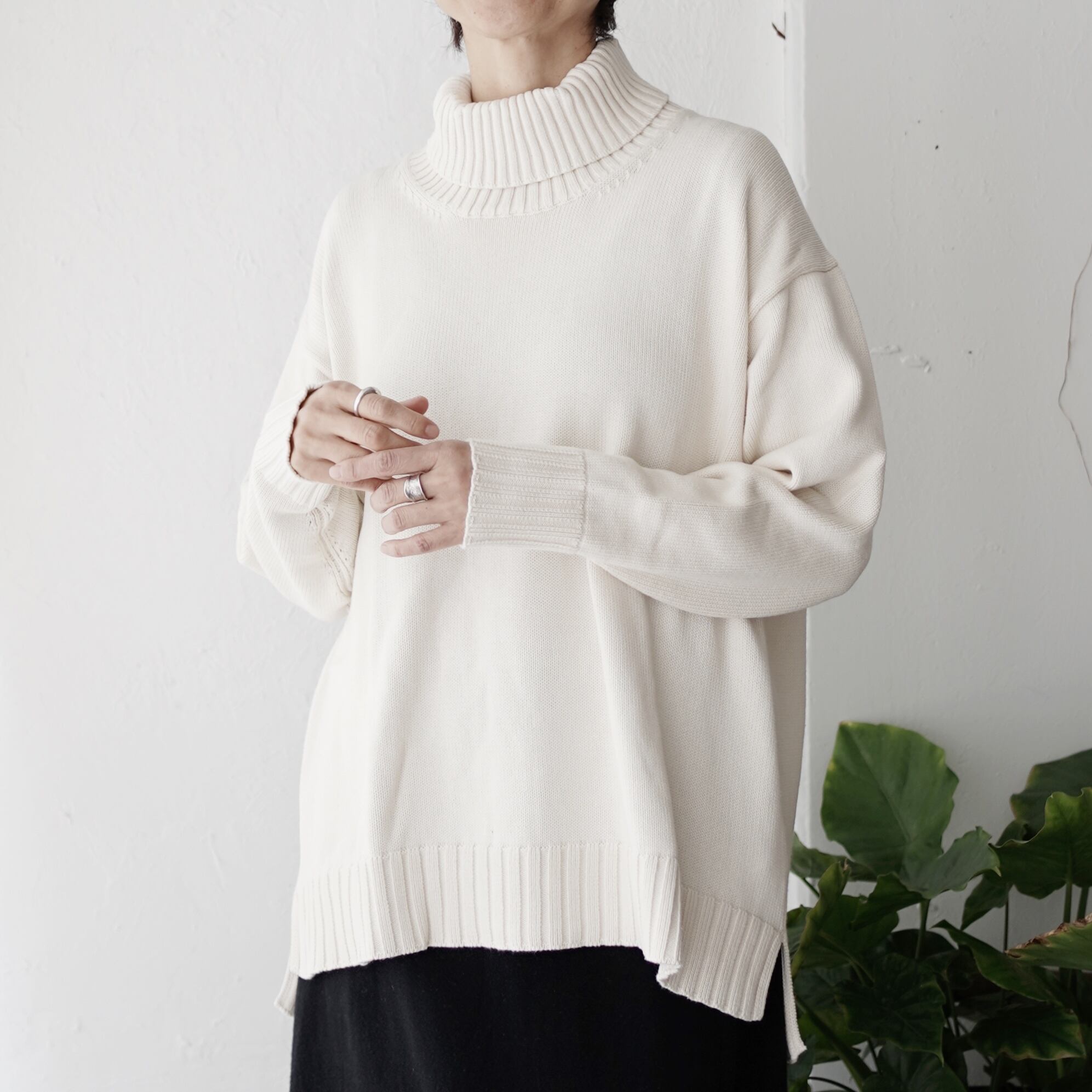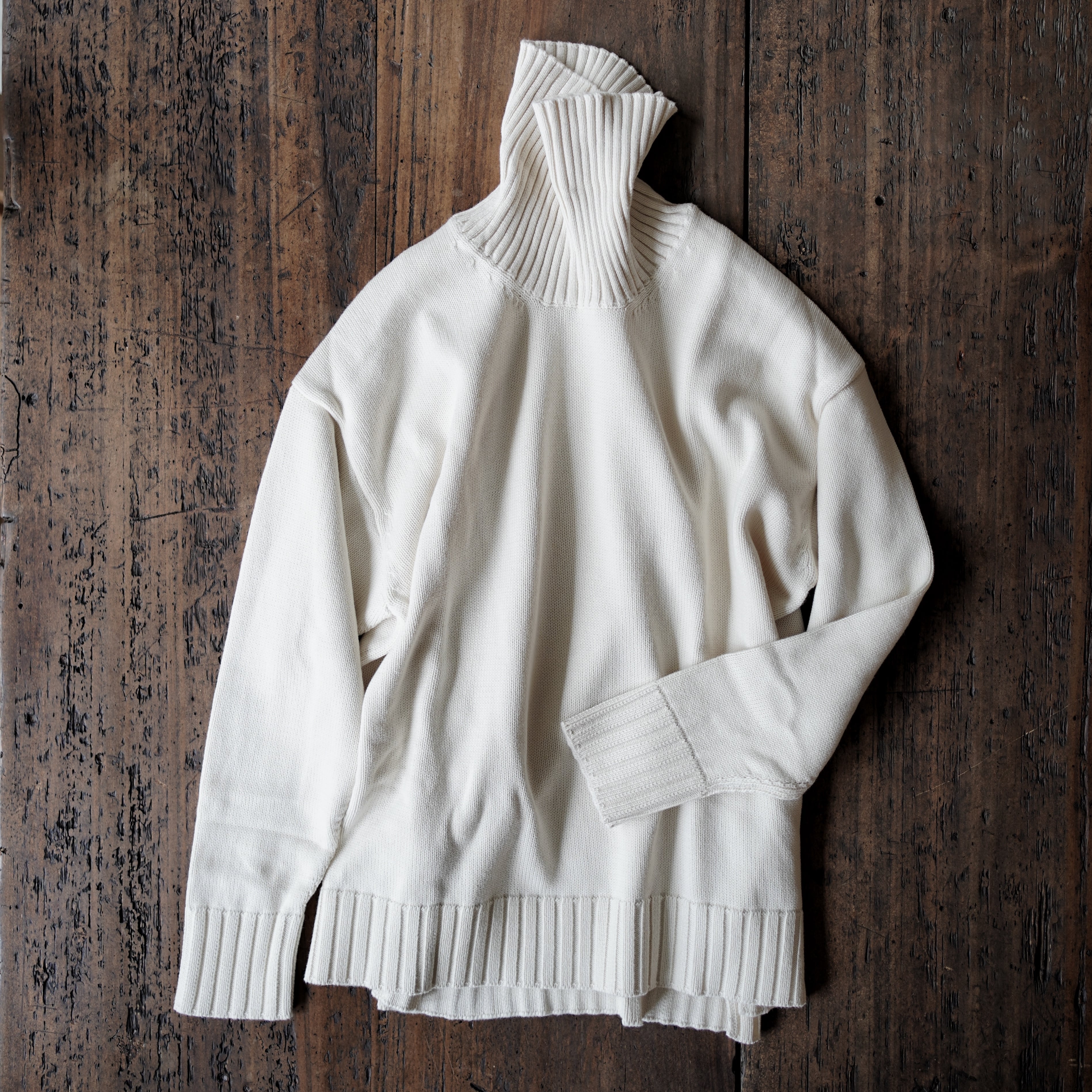 ベーシックながら存在感のあるシルエットは、前後で丈感に差をつけ、サイドにスリットを配したボクシーなデザイン。襟・袖口・裾にあしらったボリュームのあるワイドリブがアクセントになっており、タートルを折らずにくしゅっとさせるのも、折り返して二重にするのも自由自在。