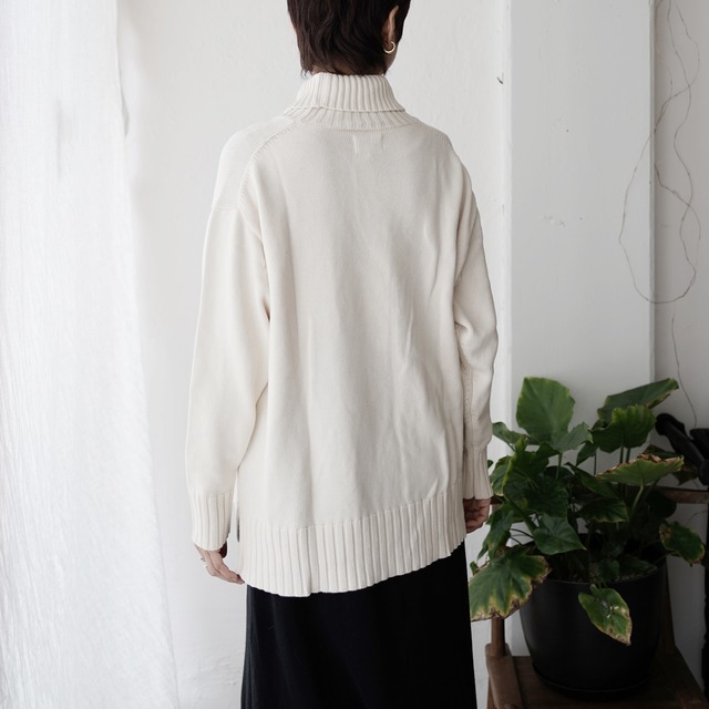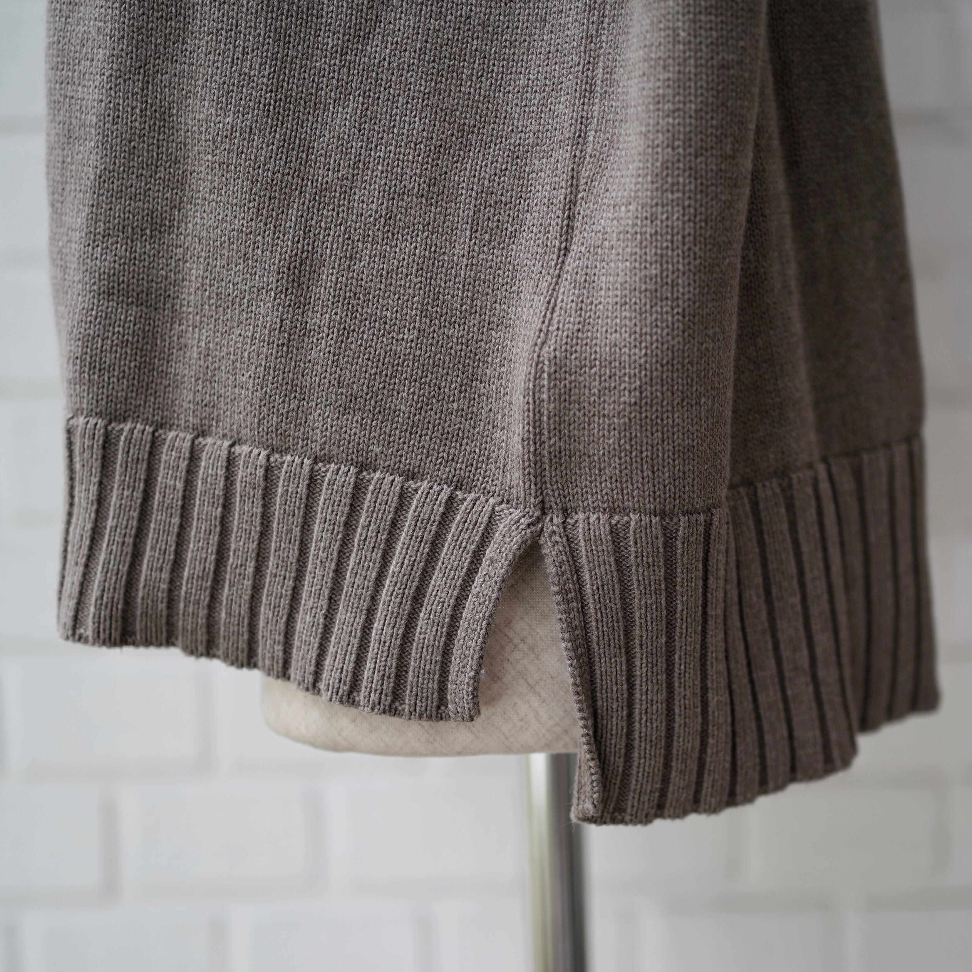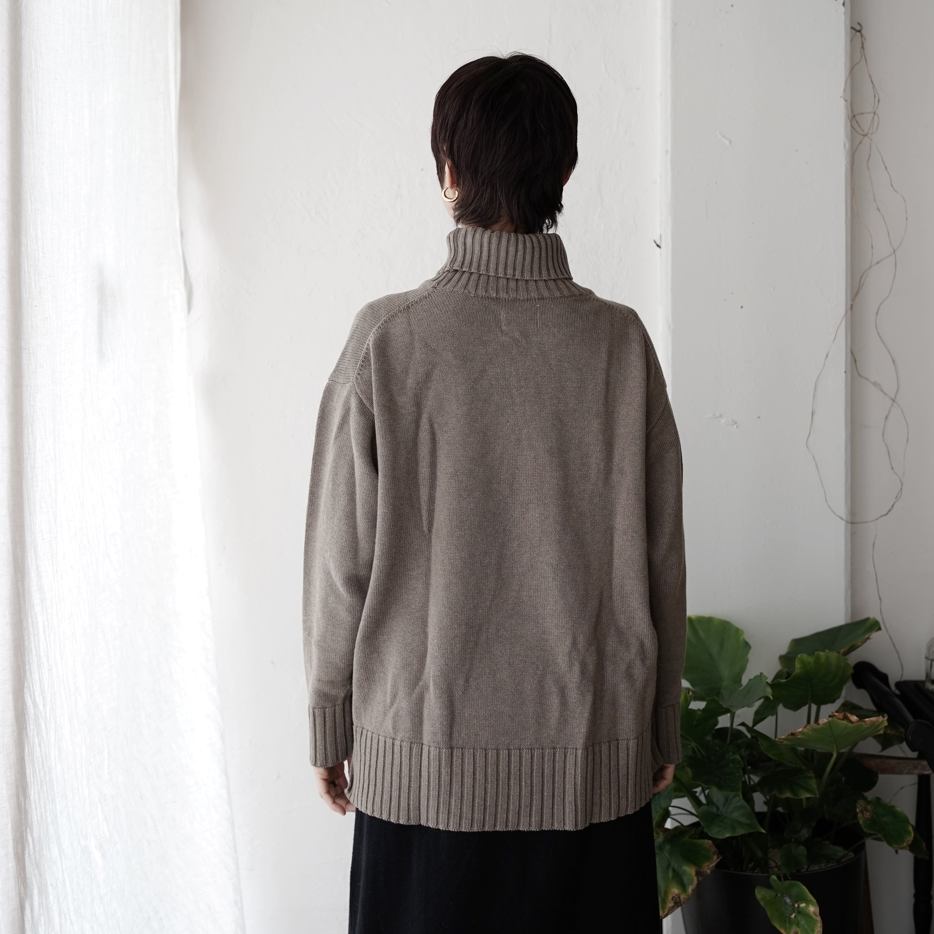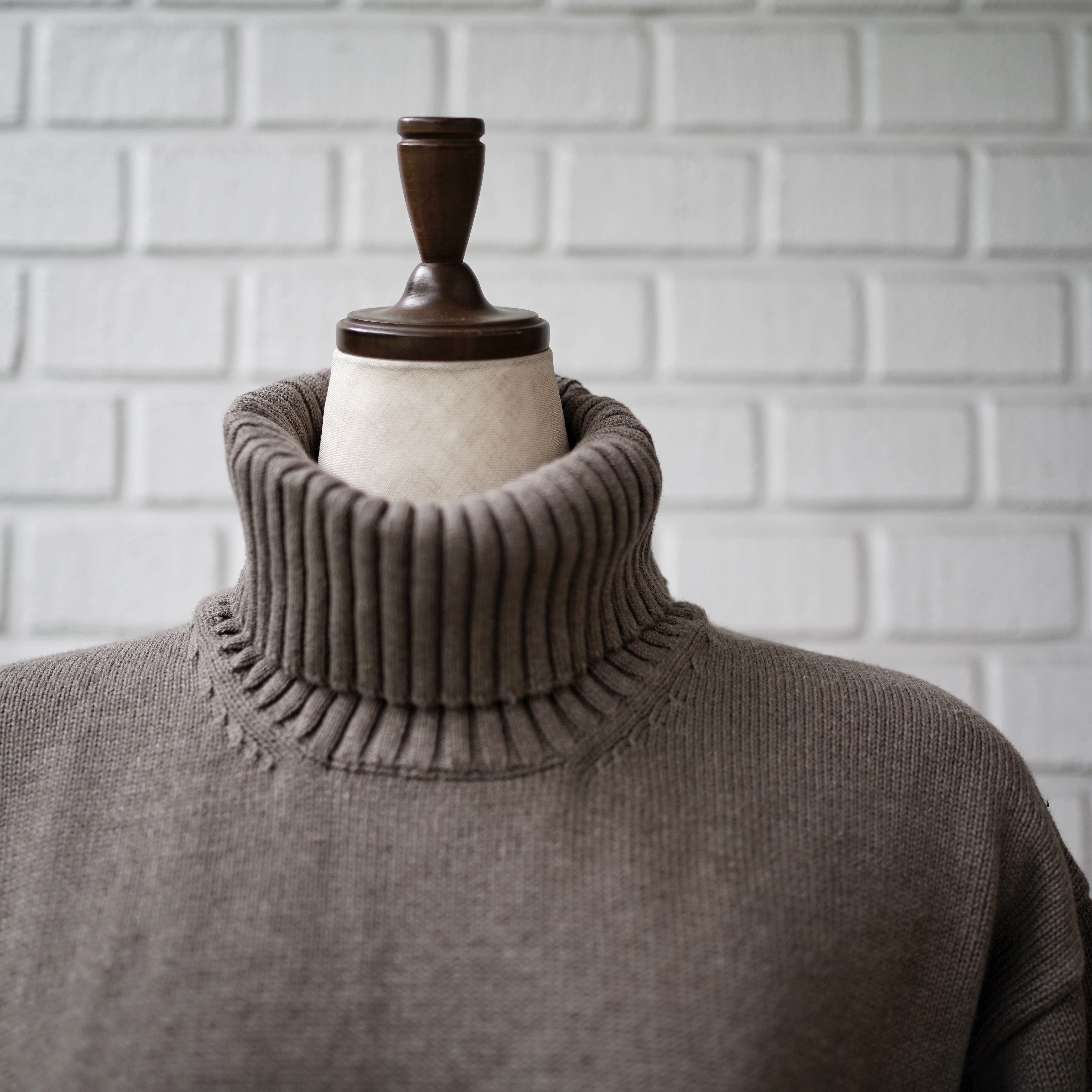 ベーシックながら存在感のあるシルエットは、前後で丈感に差をつけ、サイドにスリットを配したボクシーなデザイン。襟・袖口・裾にあしらったボリュームのあるワイドリブがアクセントになっており、タートルを折らずにくしゅっとさせるのも、折り返して二重にするのも自由自在。