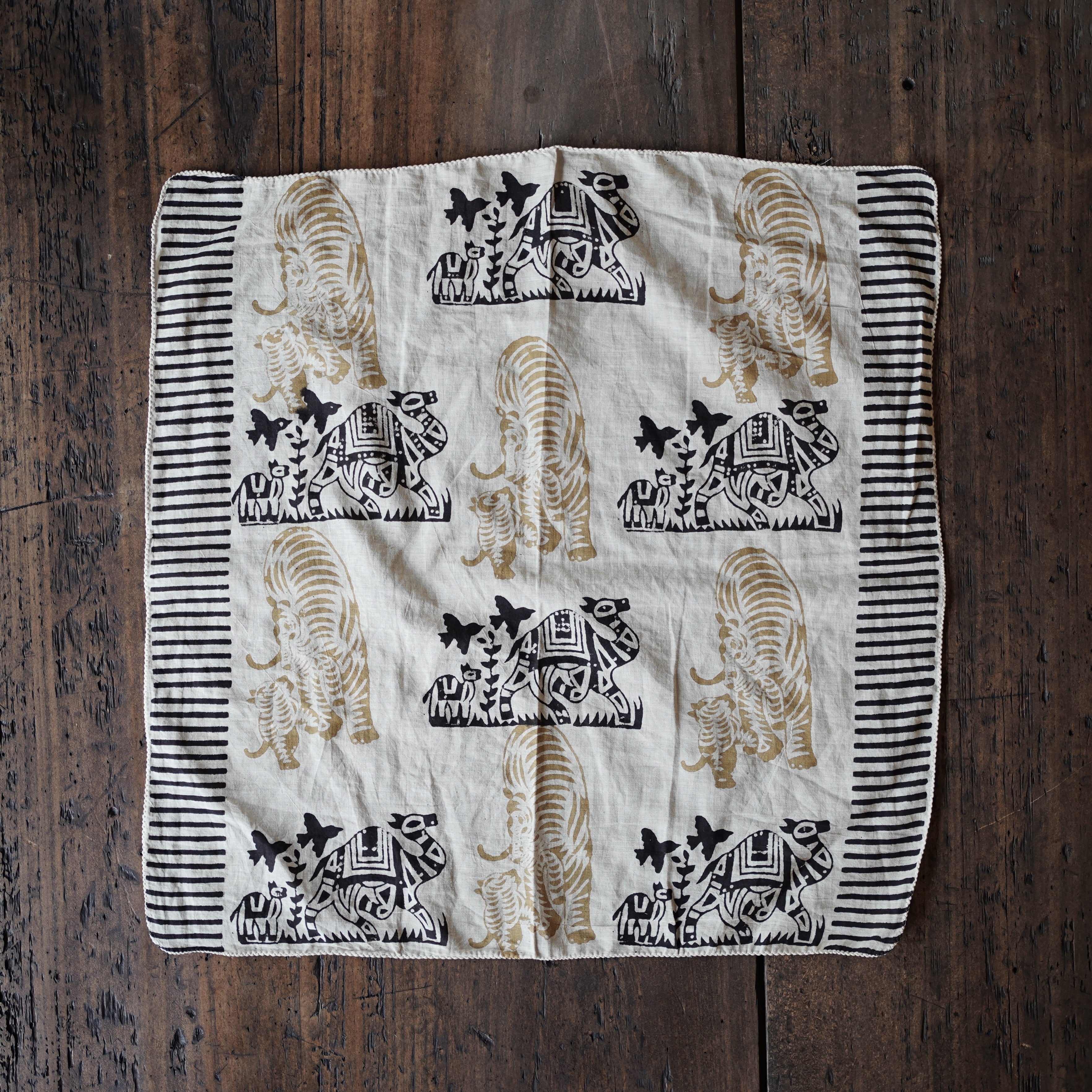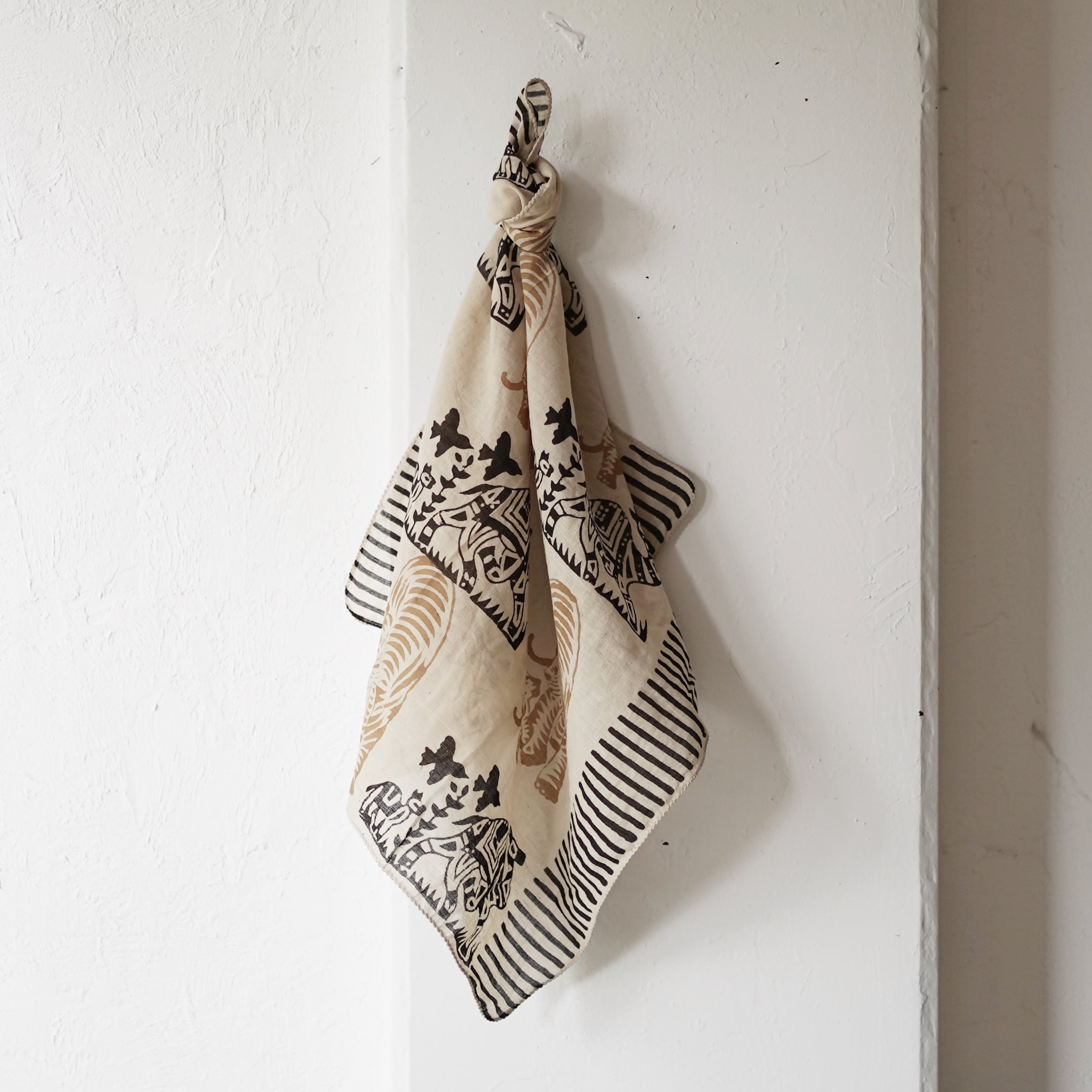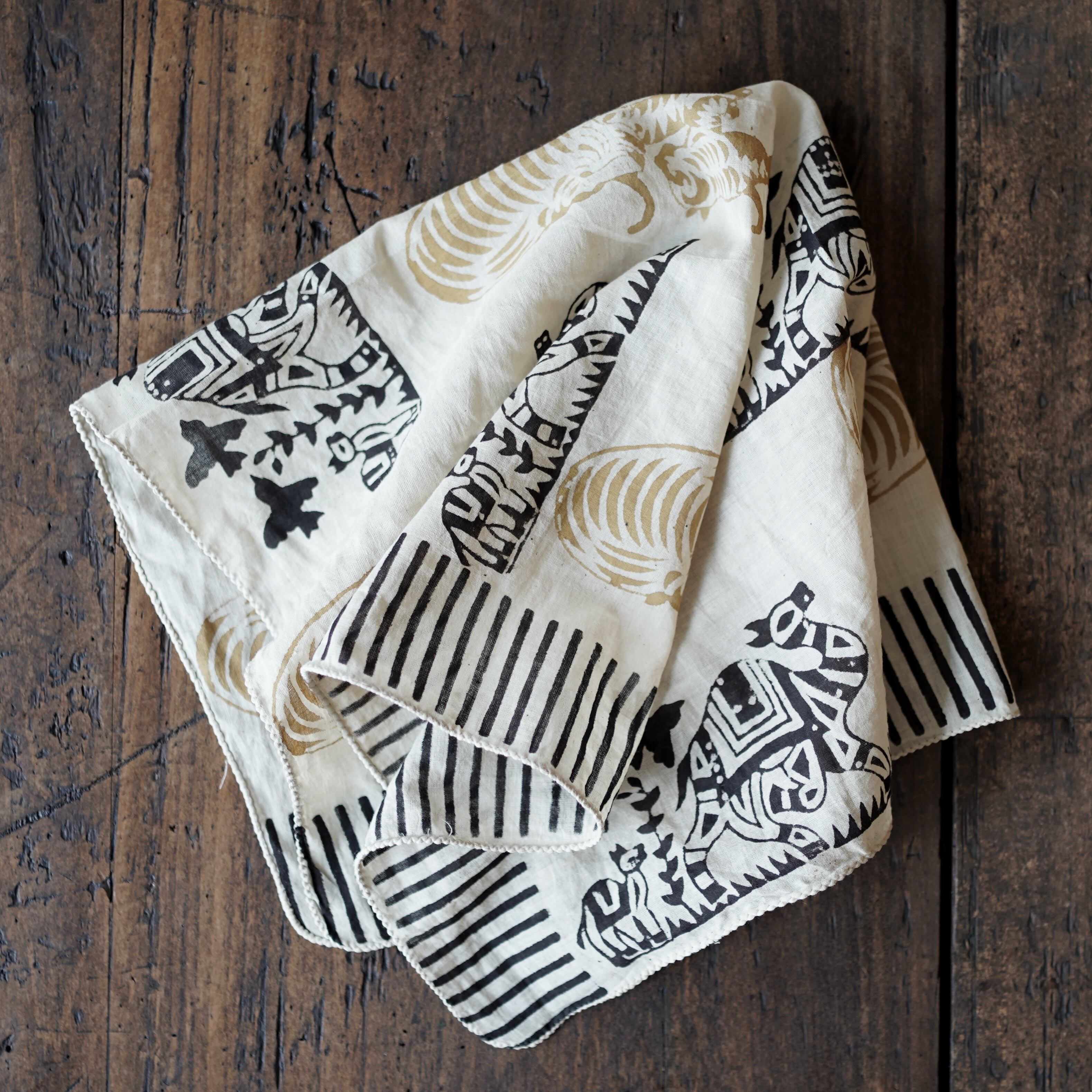インドの職人によって、一枚一枚ていねいに木版で染め上げられたコットンバンダナ。