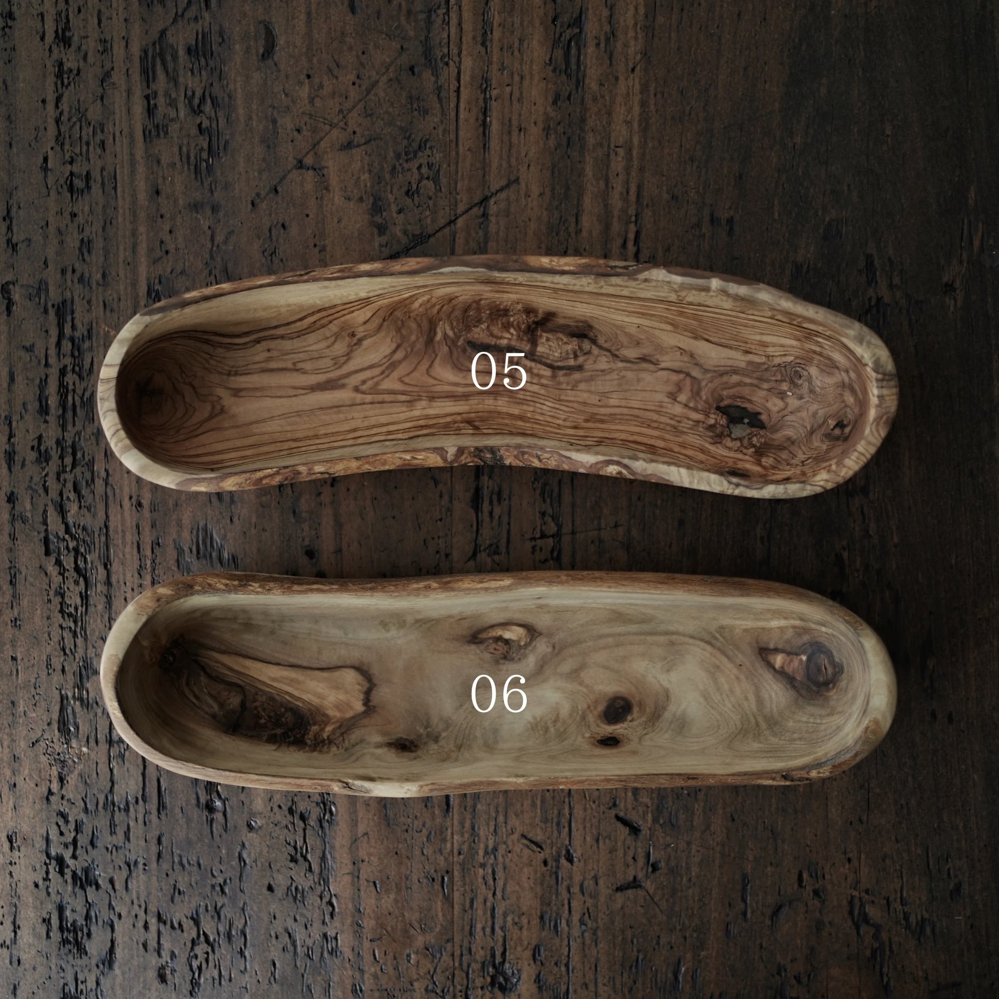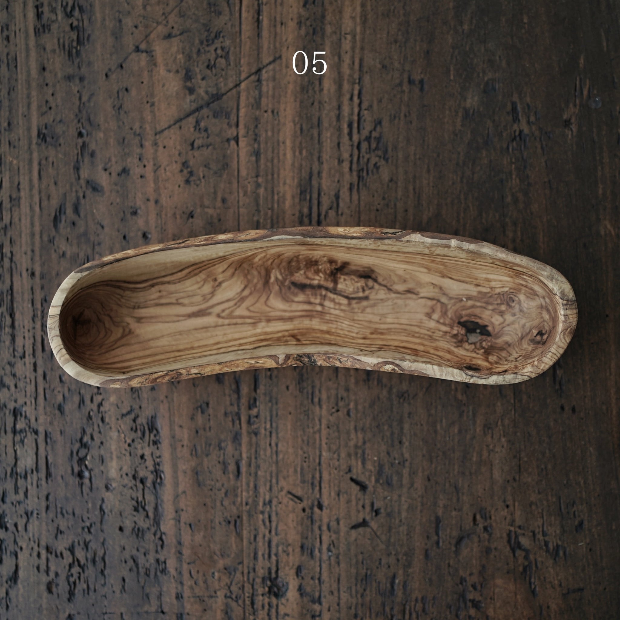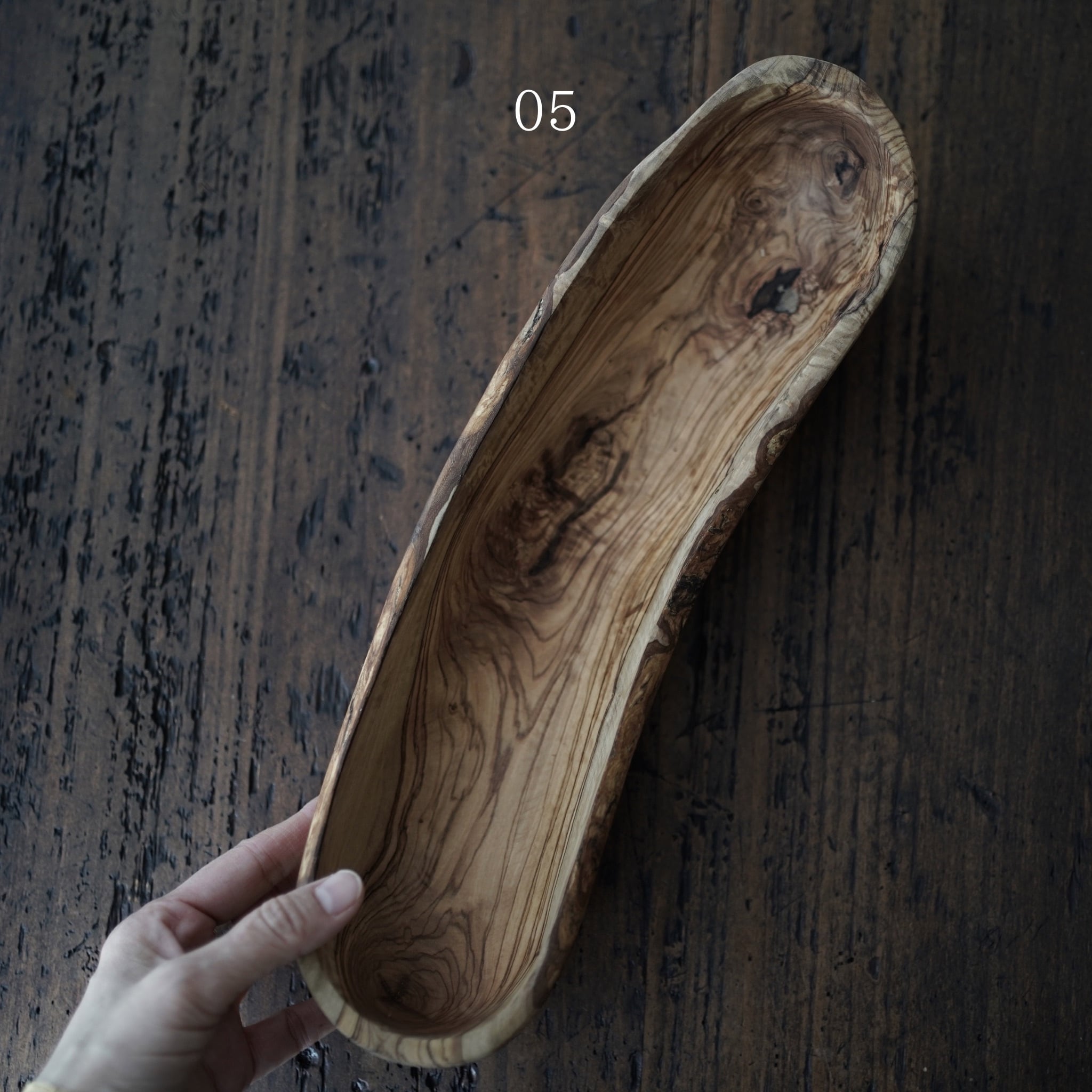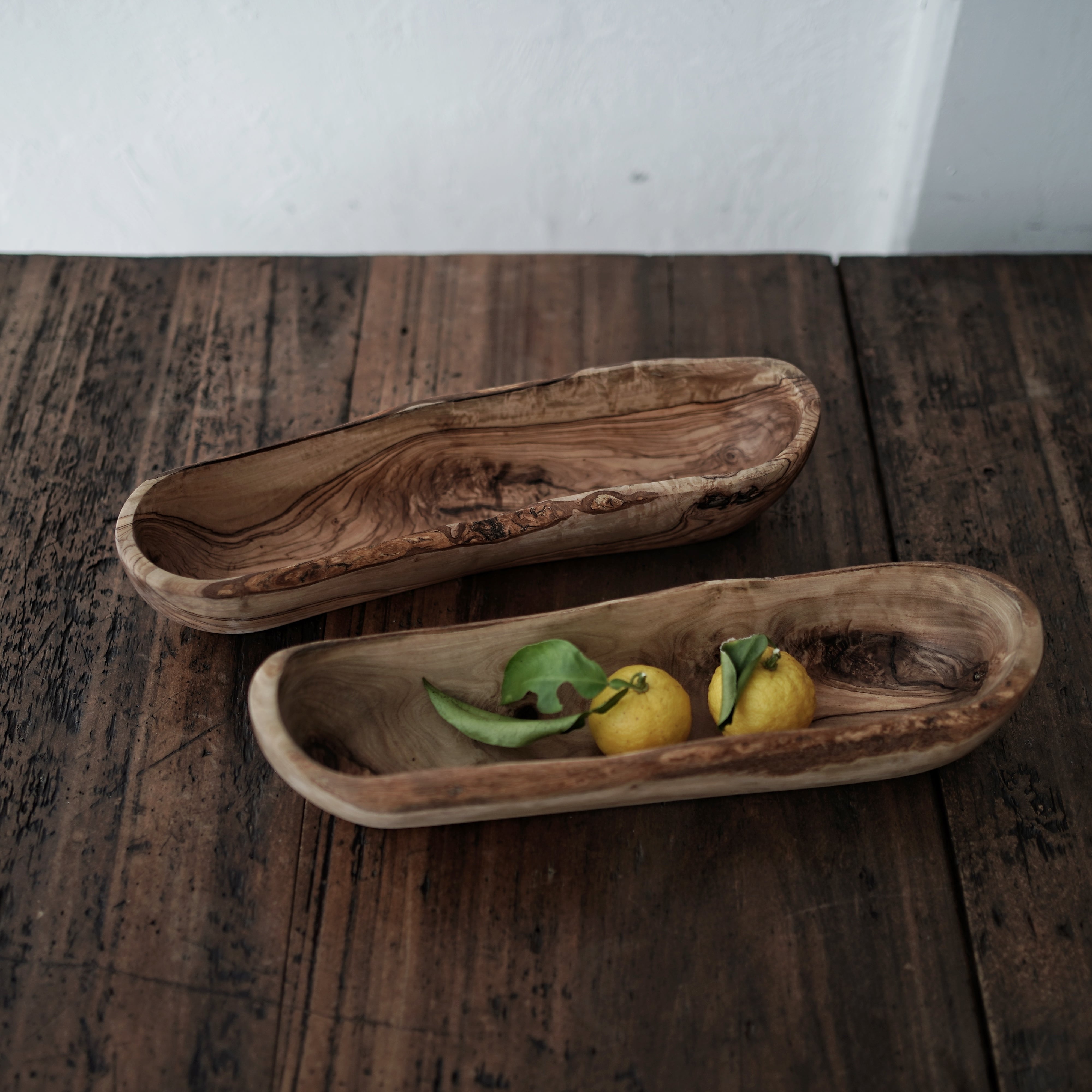 オリーブの木を丁寧に削り出して作られた、細長いフォルムのハンドクラフトトレイ。