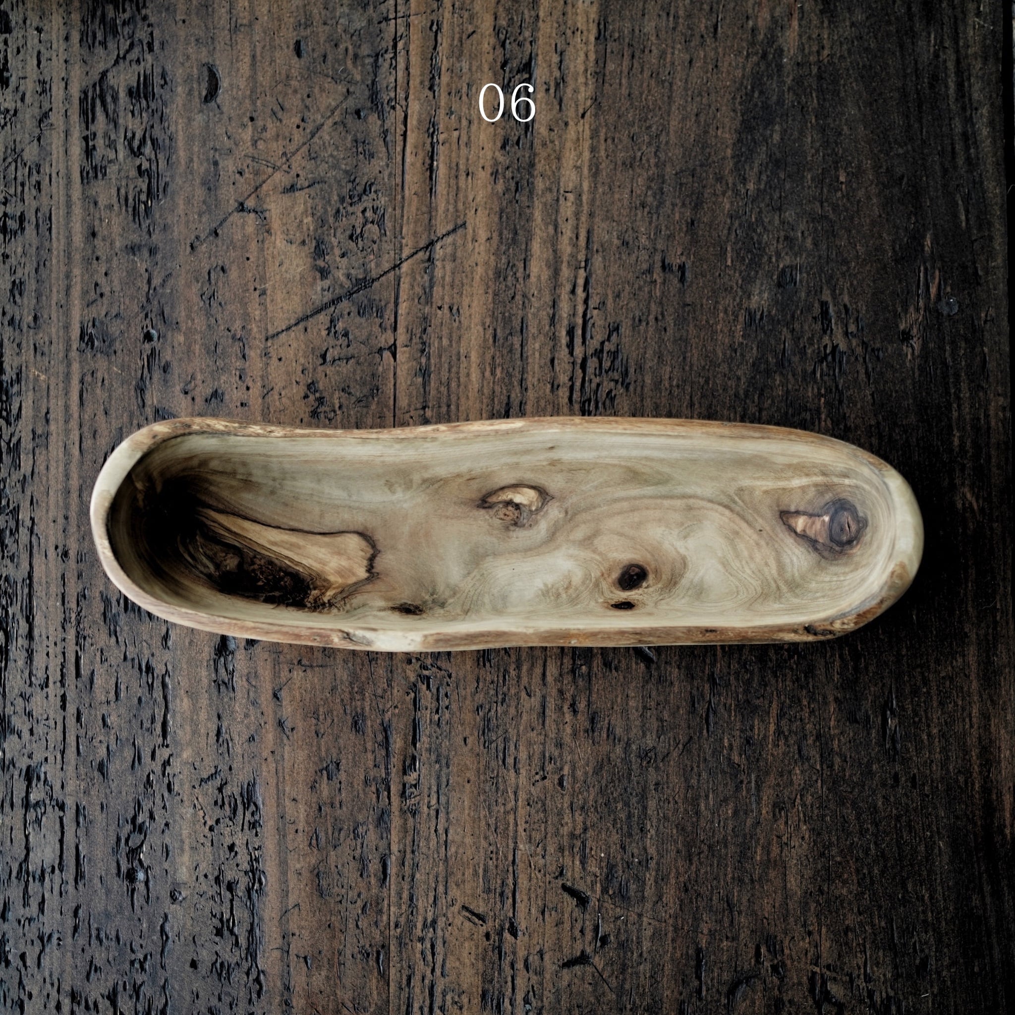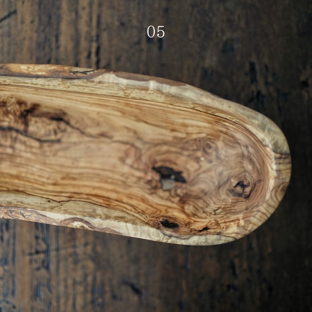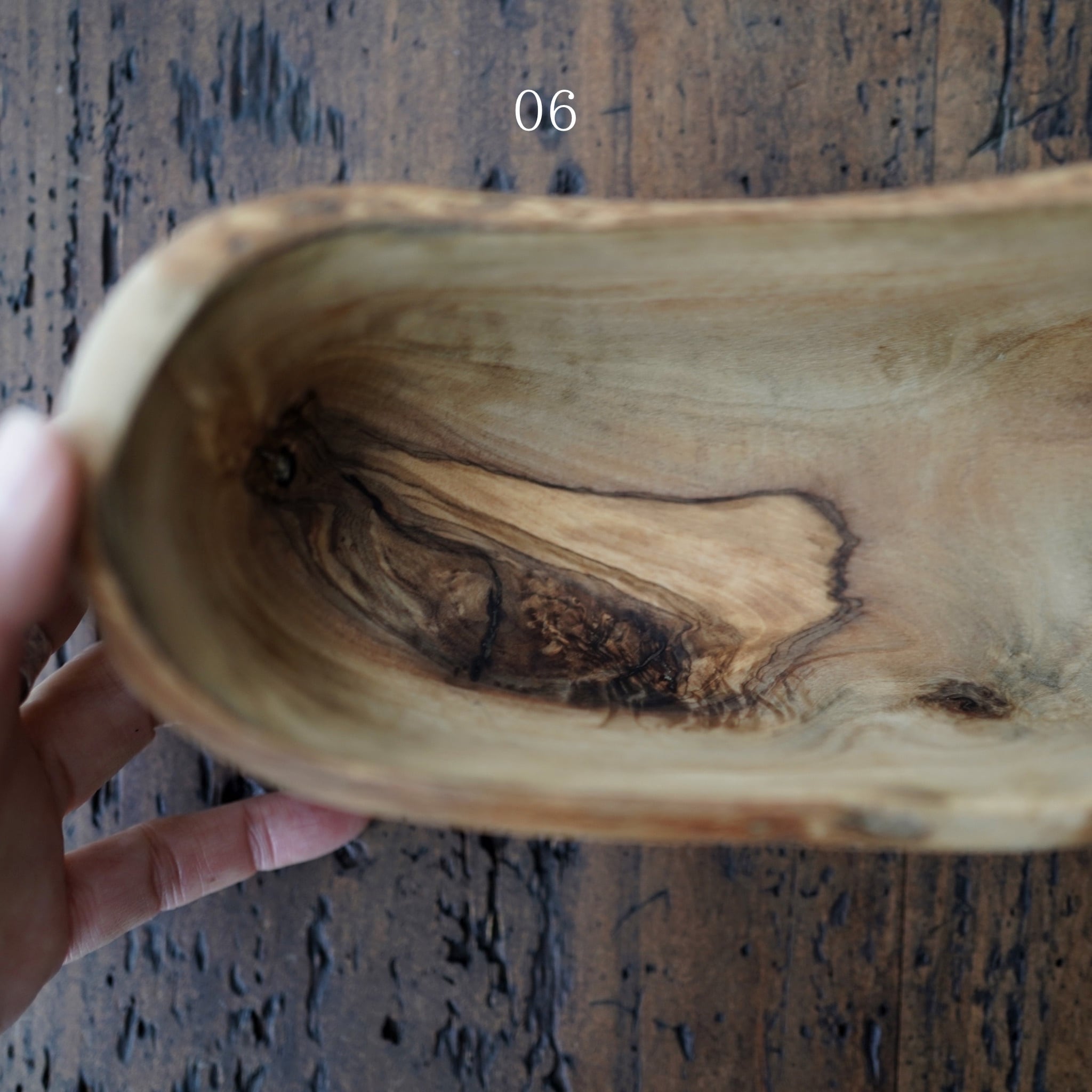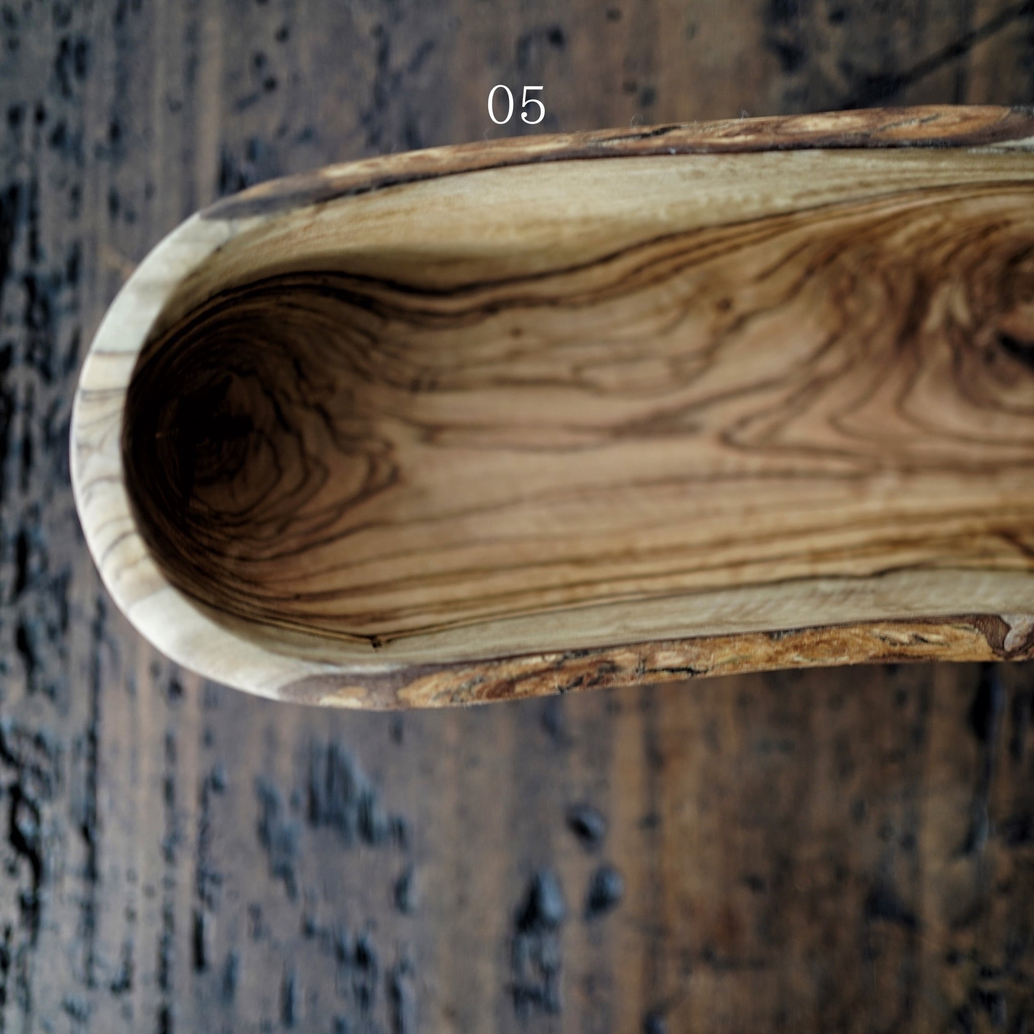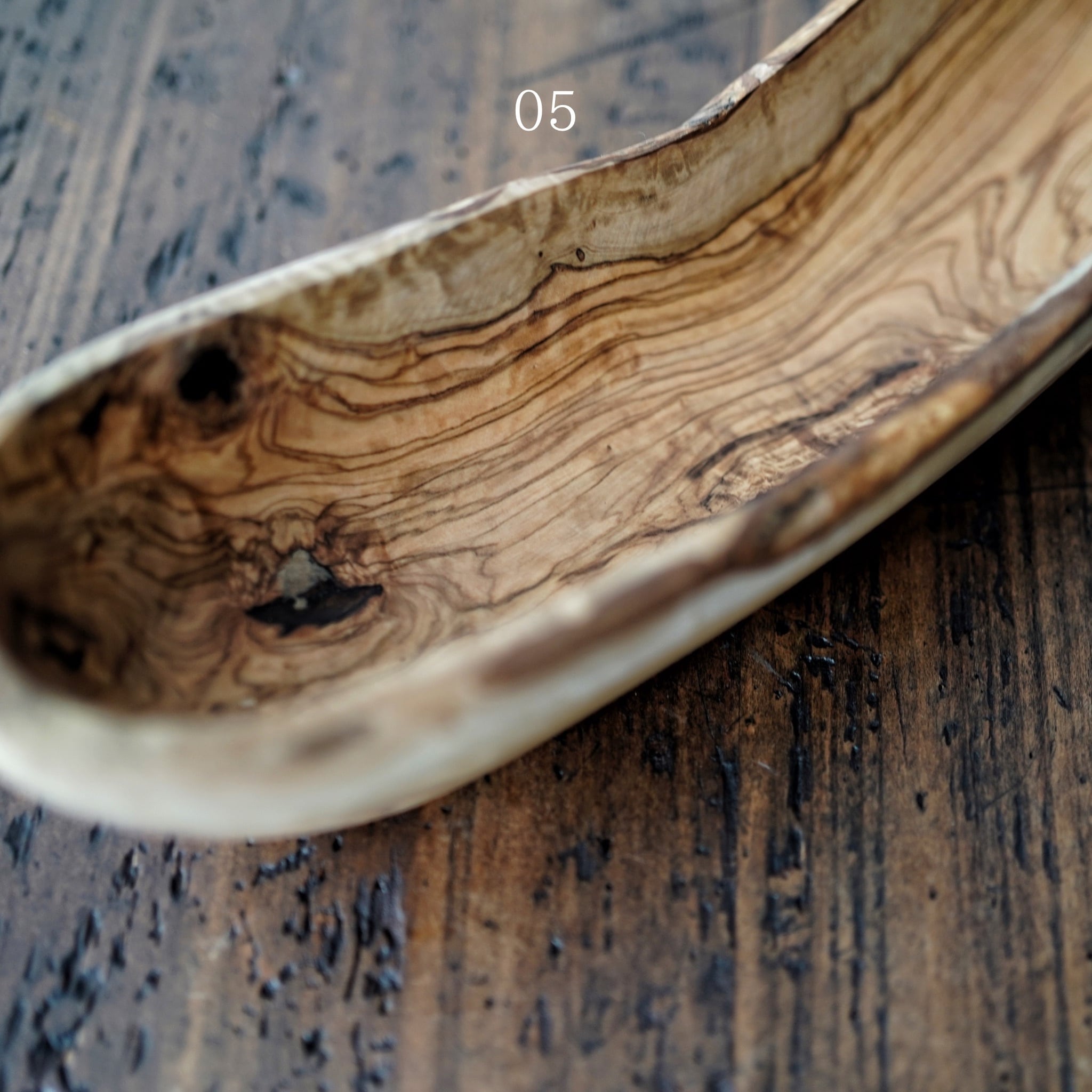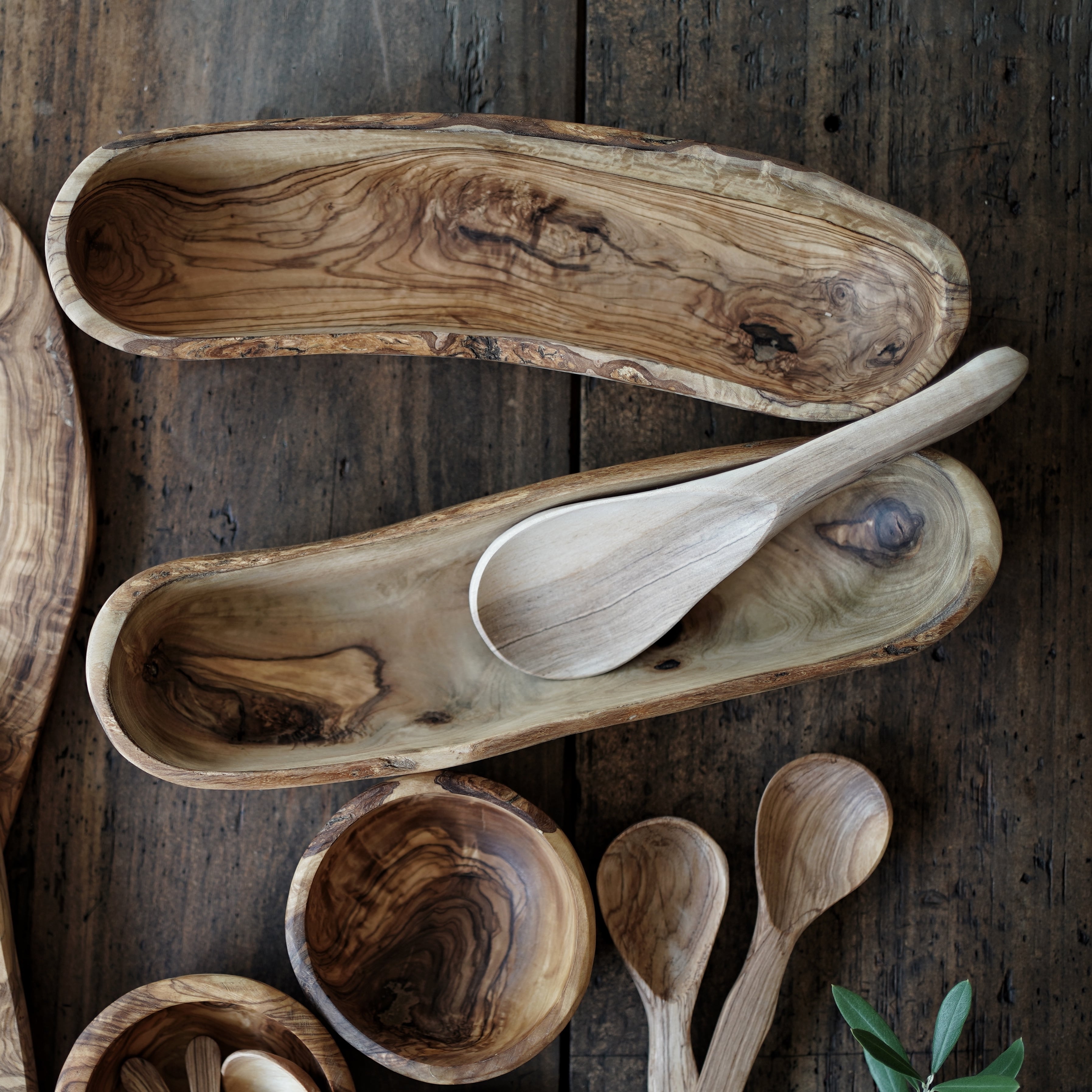 オリーブの木を丁寧に削り出して作られた、細長いフォルムのハンドクラフトトレイ。