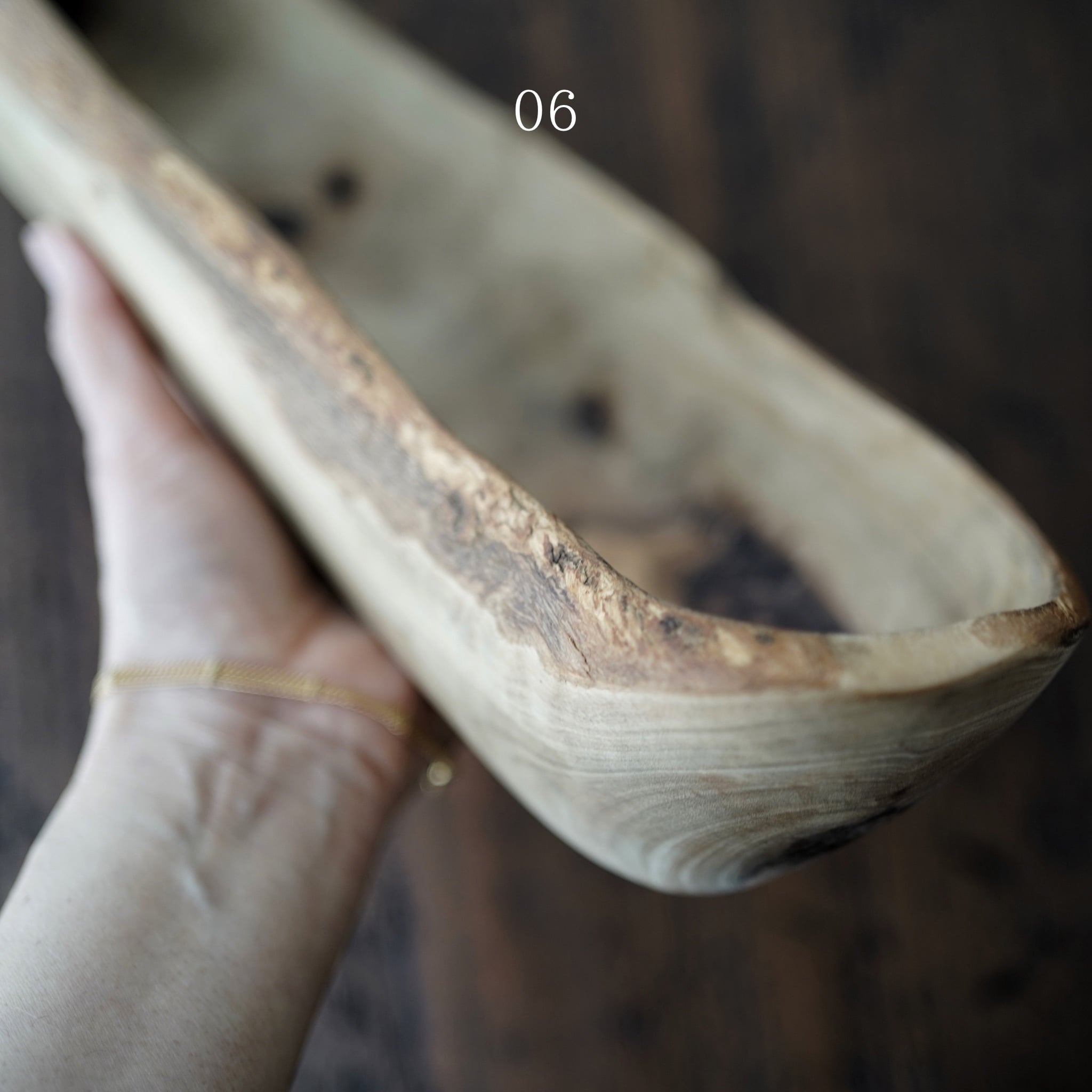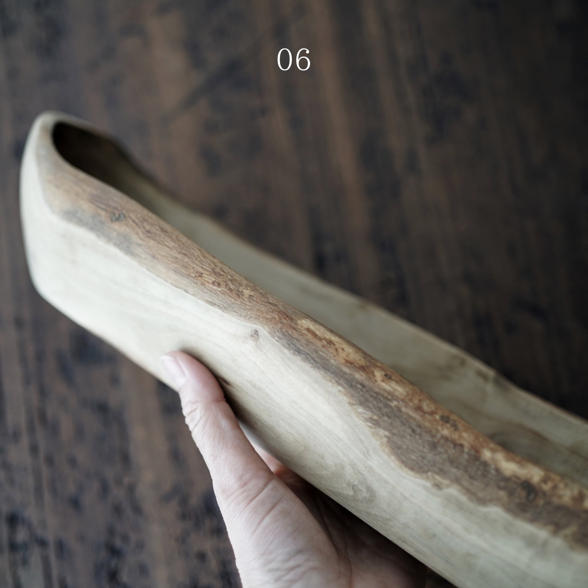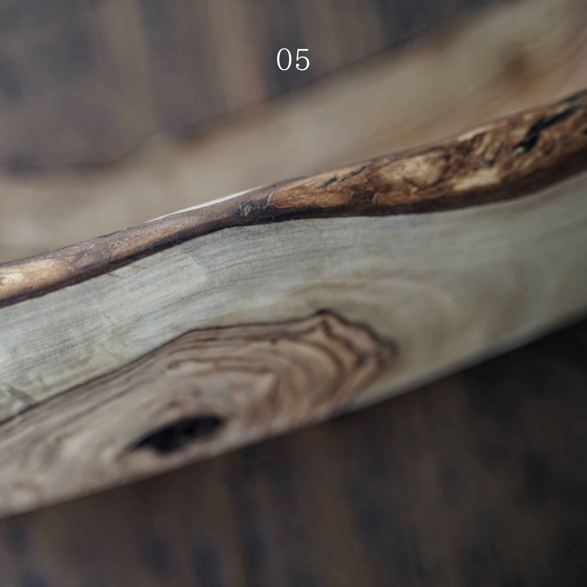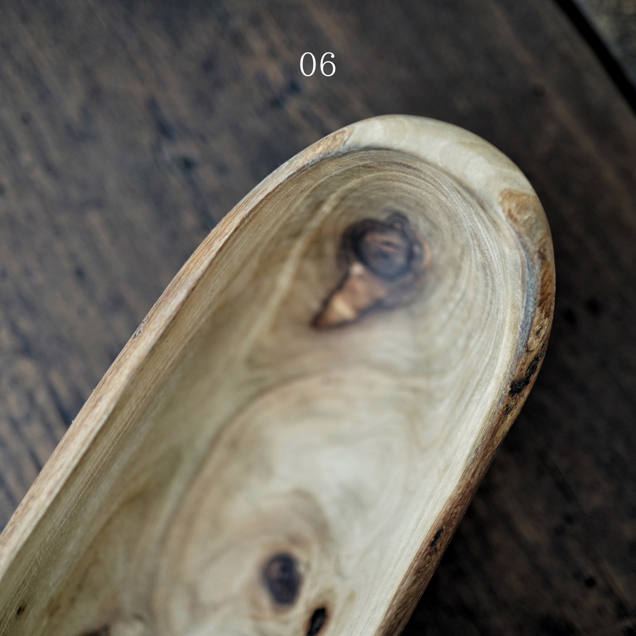 オリーブの木を丁寧に削り出して作られた、細長いフォルムのハンドクラフトトレイ。