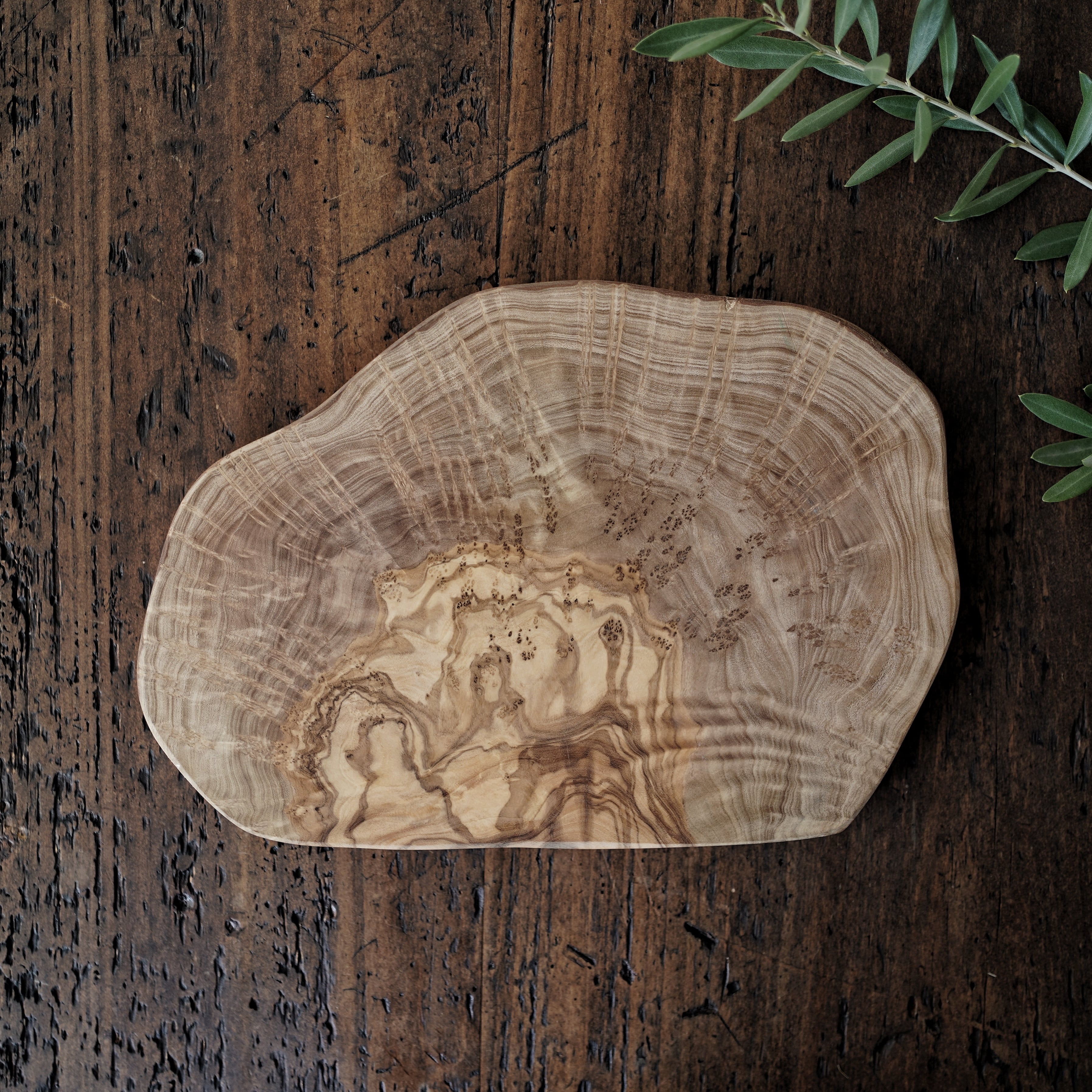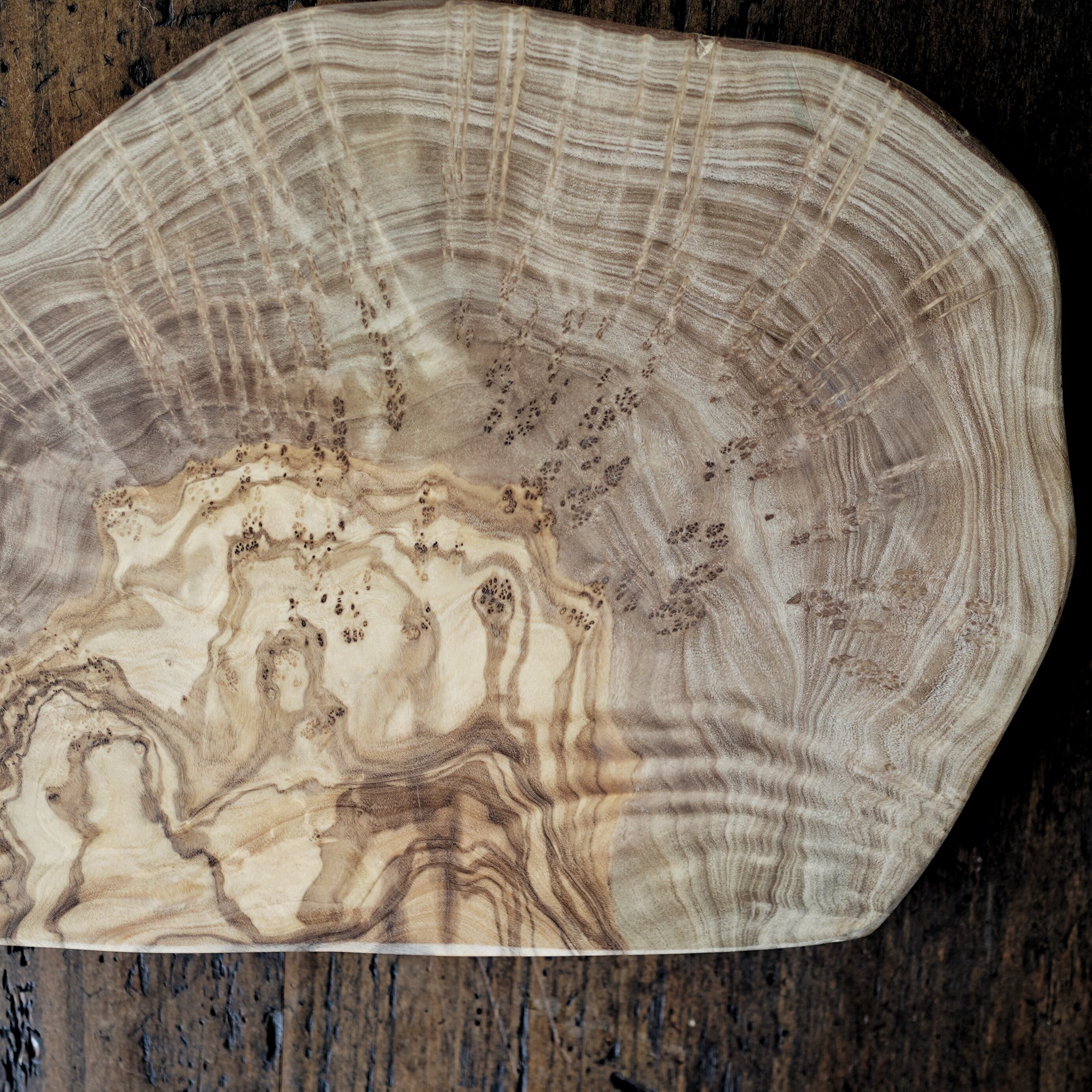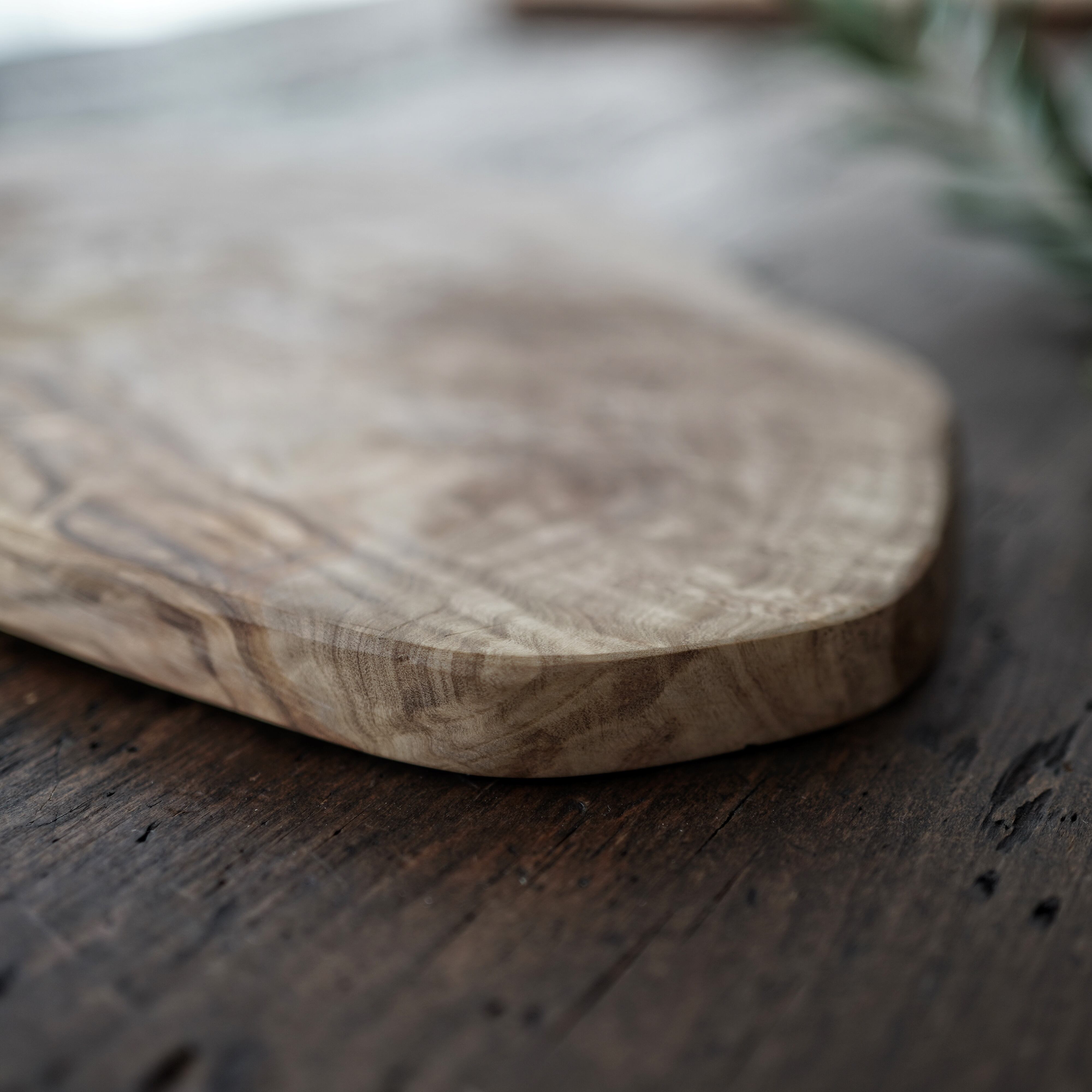 硬くて丈夫、美しい木目が特徴のオリーブでハンドメイドされたカッティングボード。