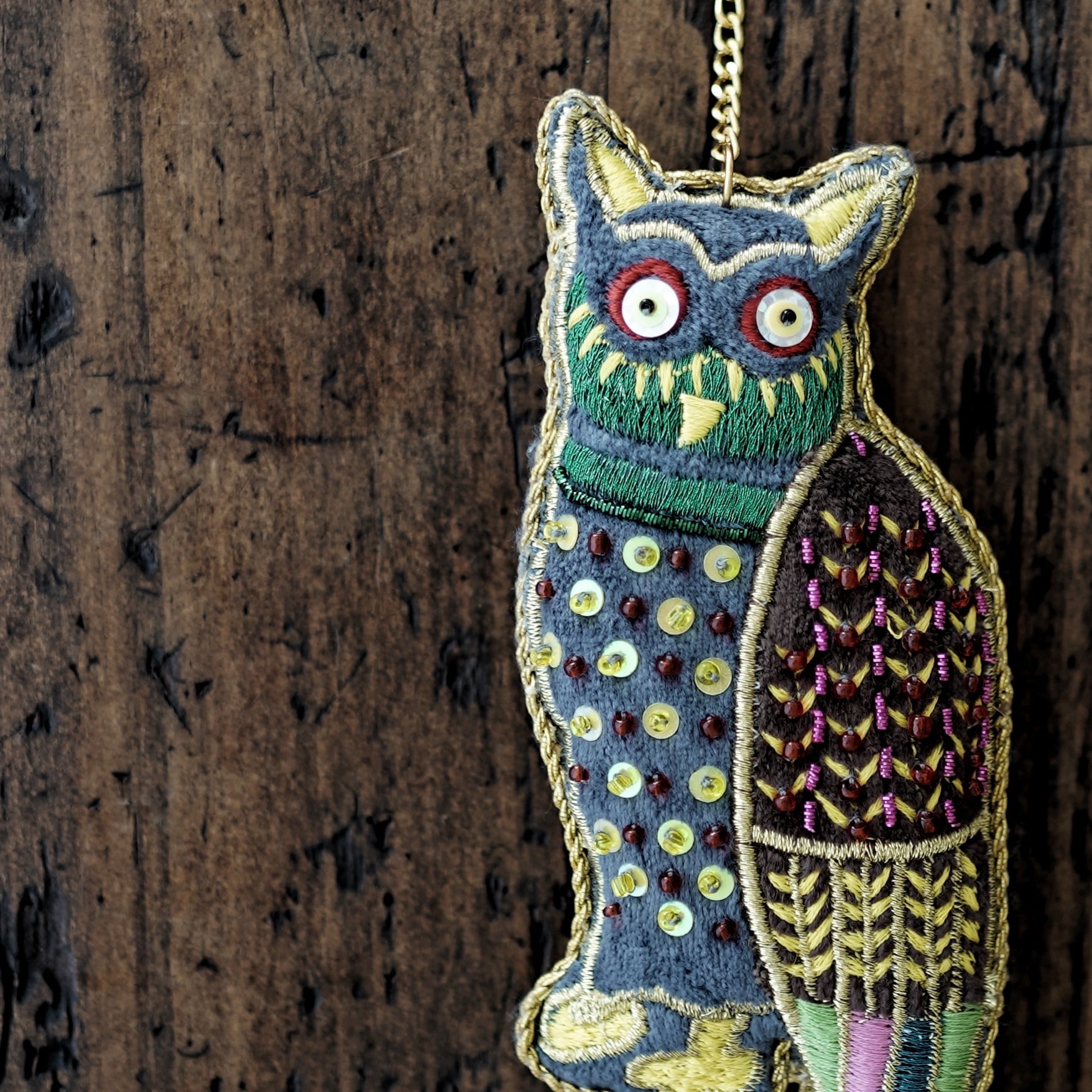 金や銀のコイル状のモール糸を釣り針のような針で一針一針手作業で縫い付けられています。