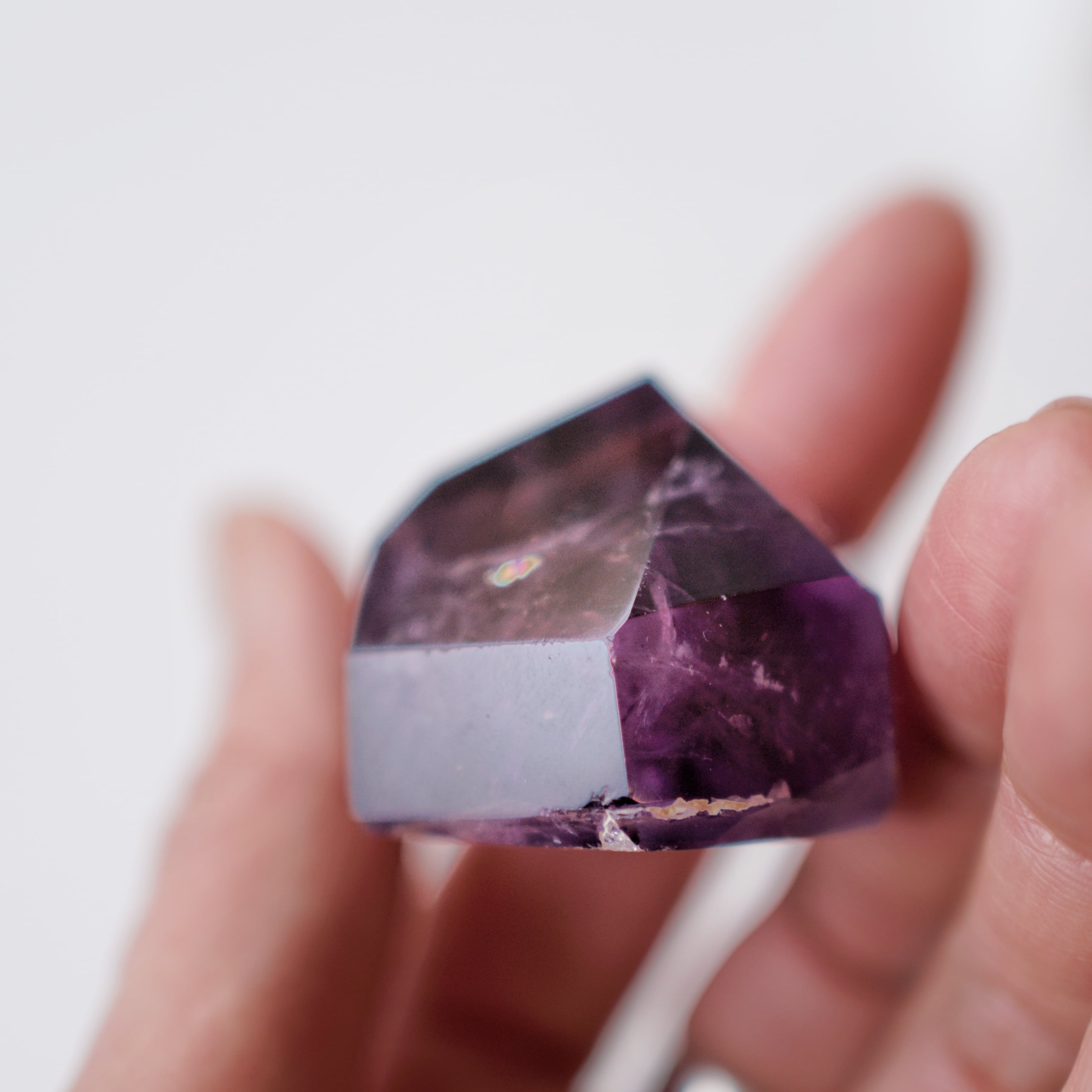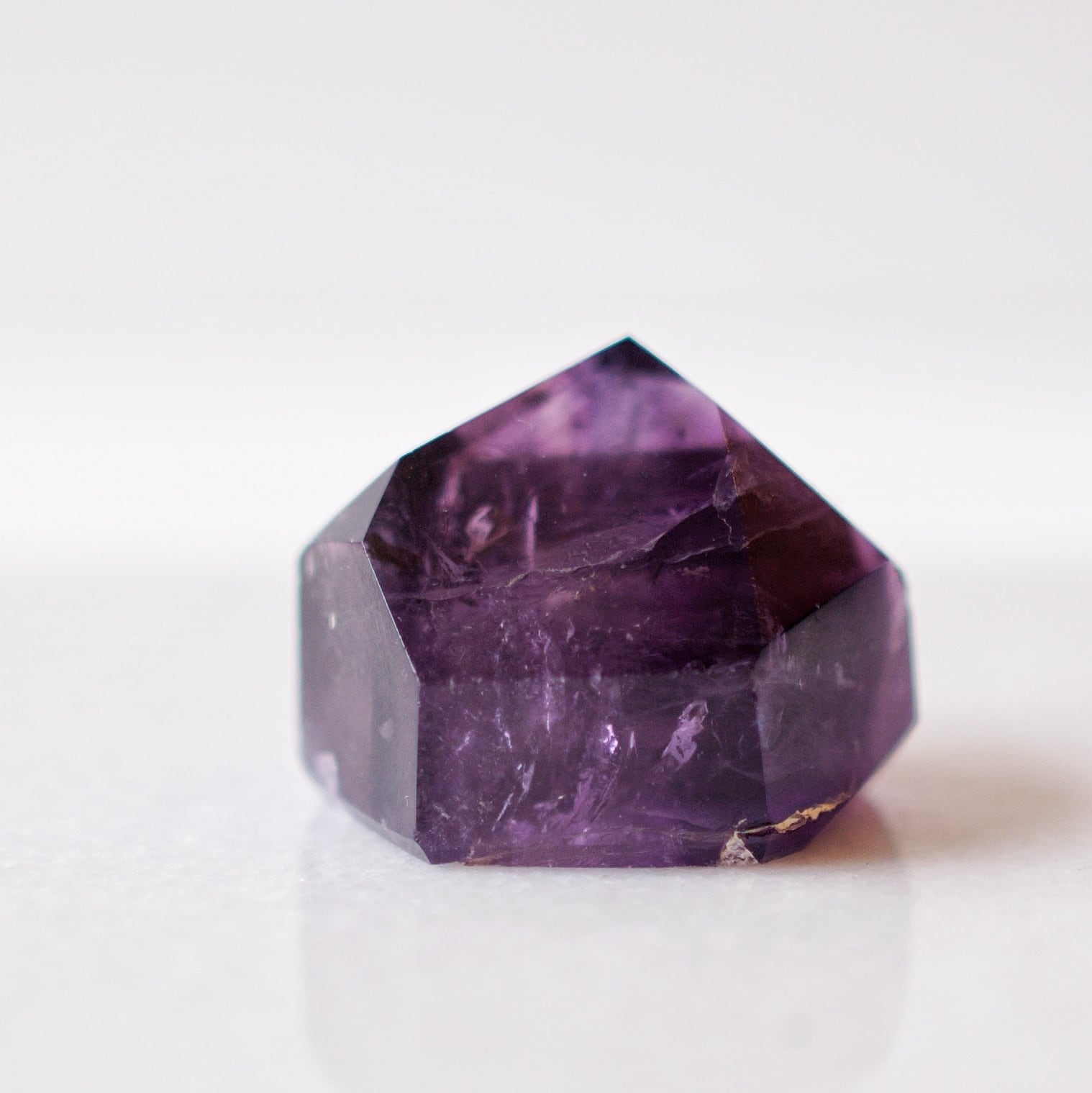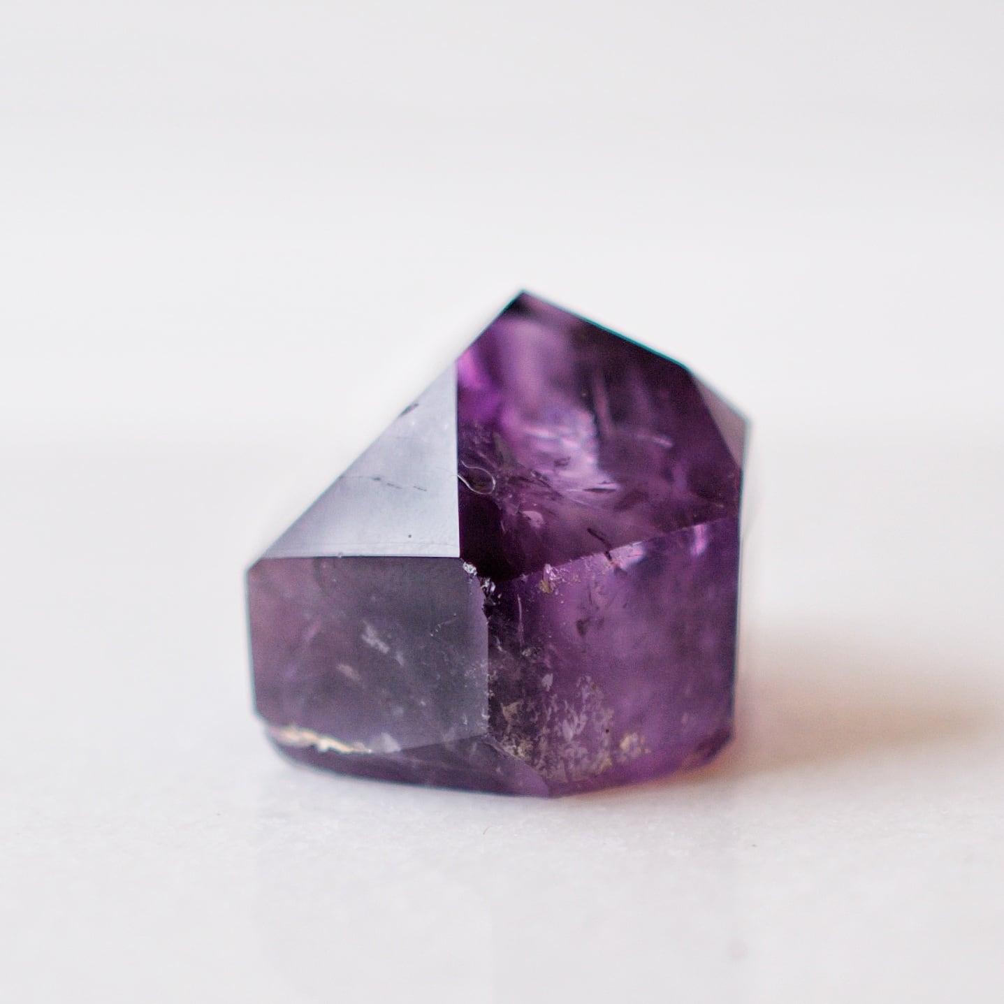 紫の濃淡や内包物が結晶の奥に重なり、