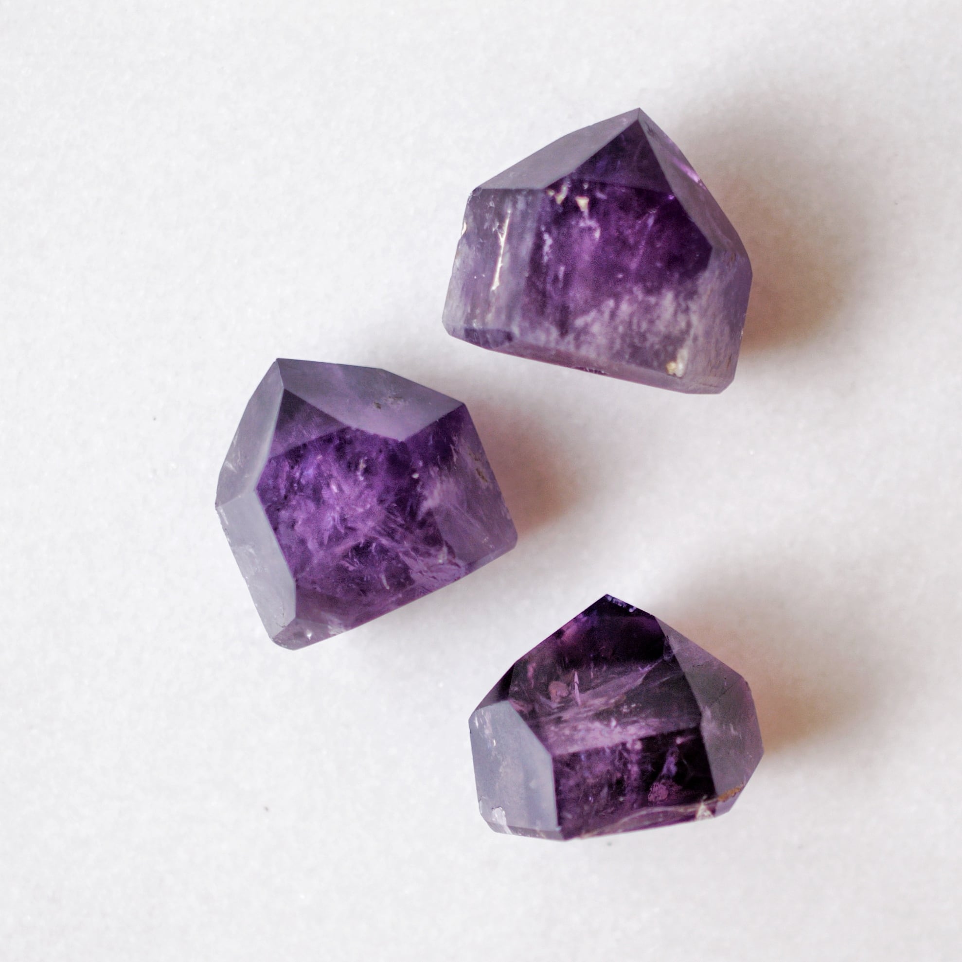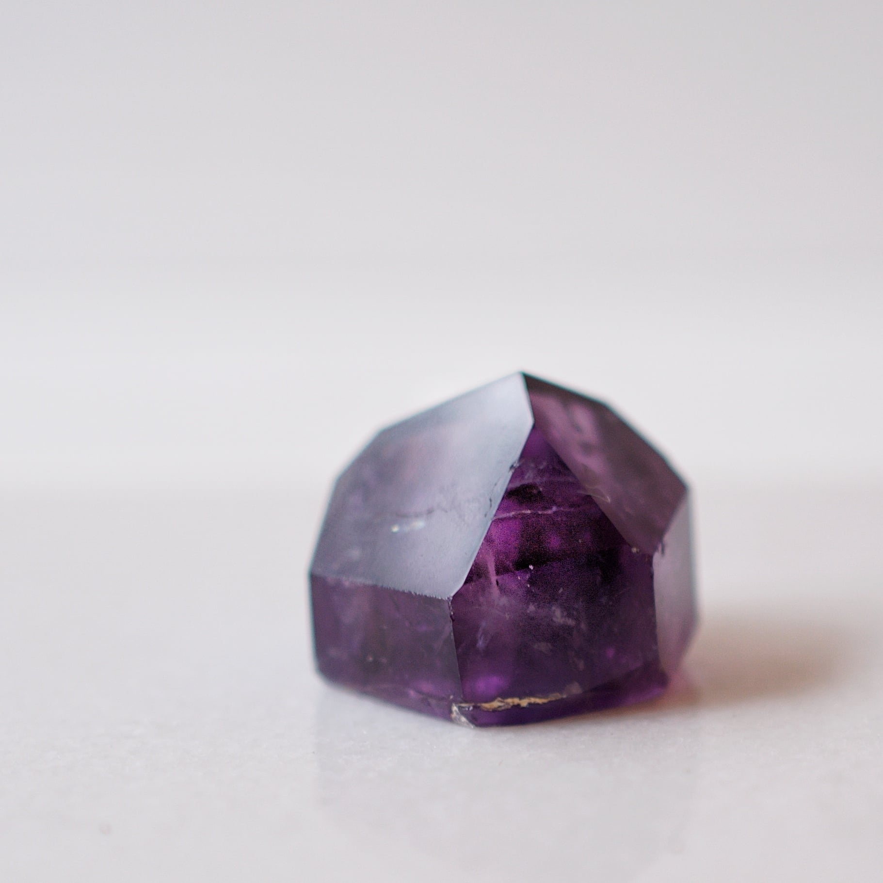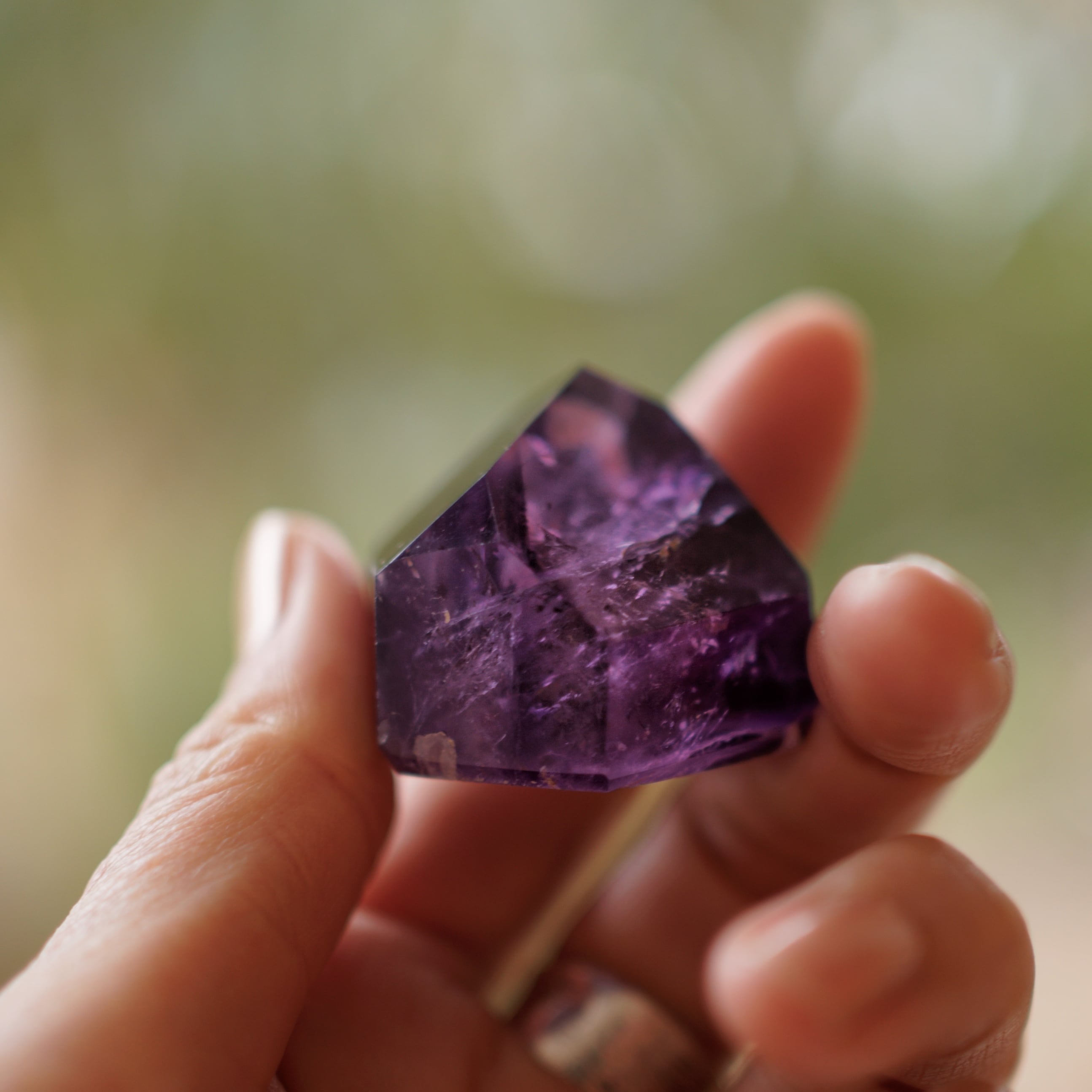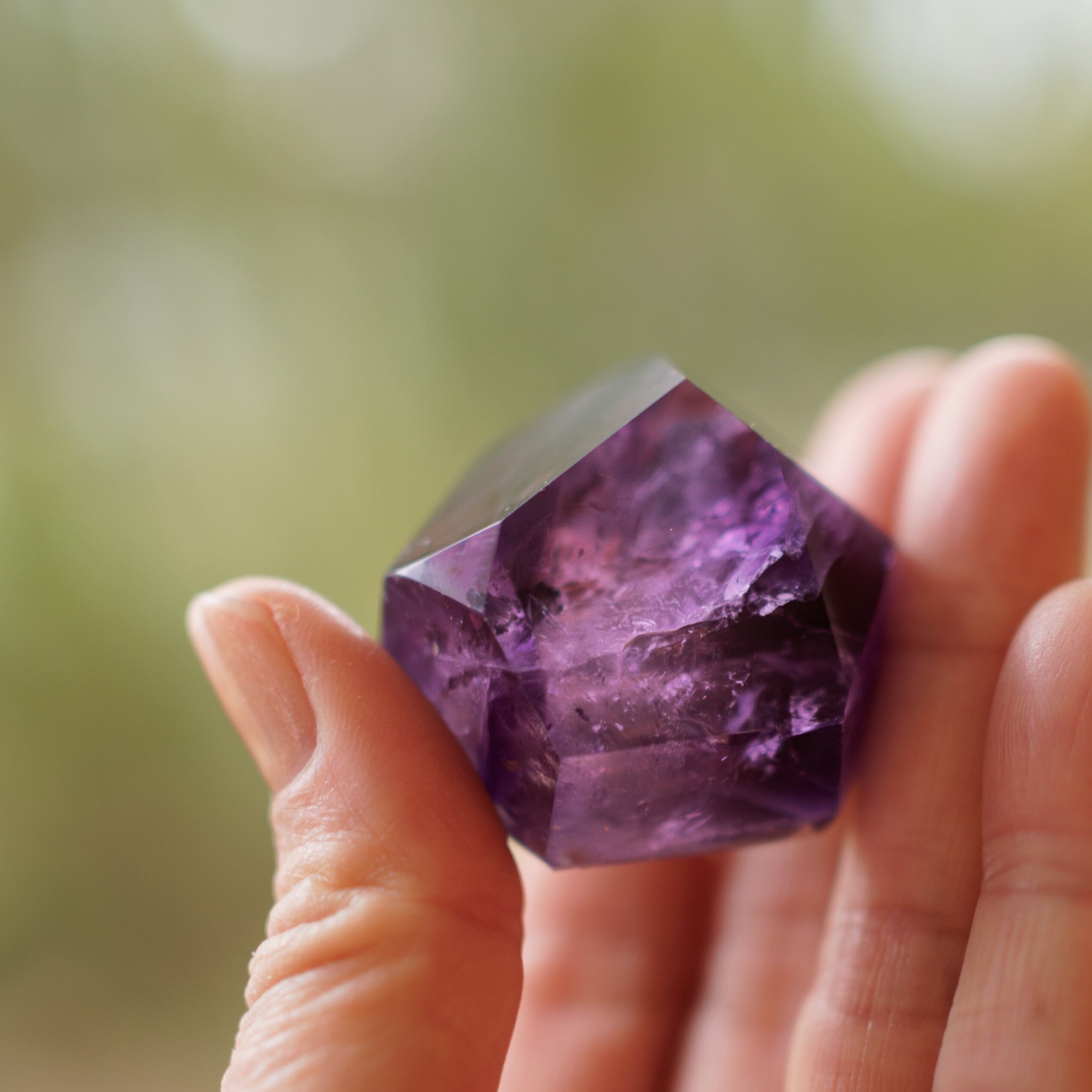 紫の濃淡や内包物が結晶の奥に重なり、