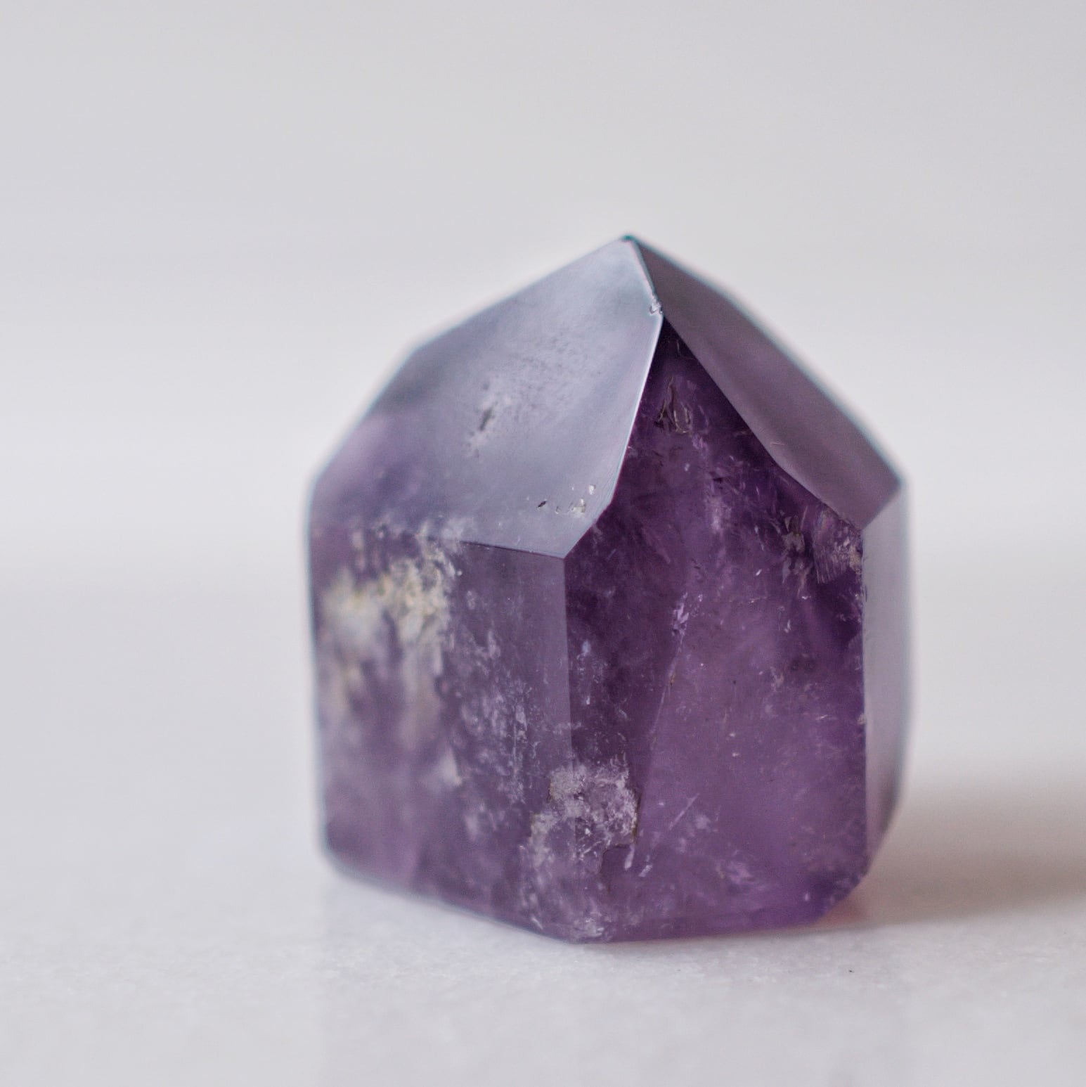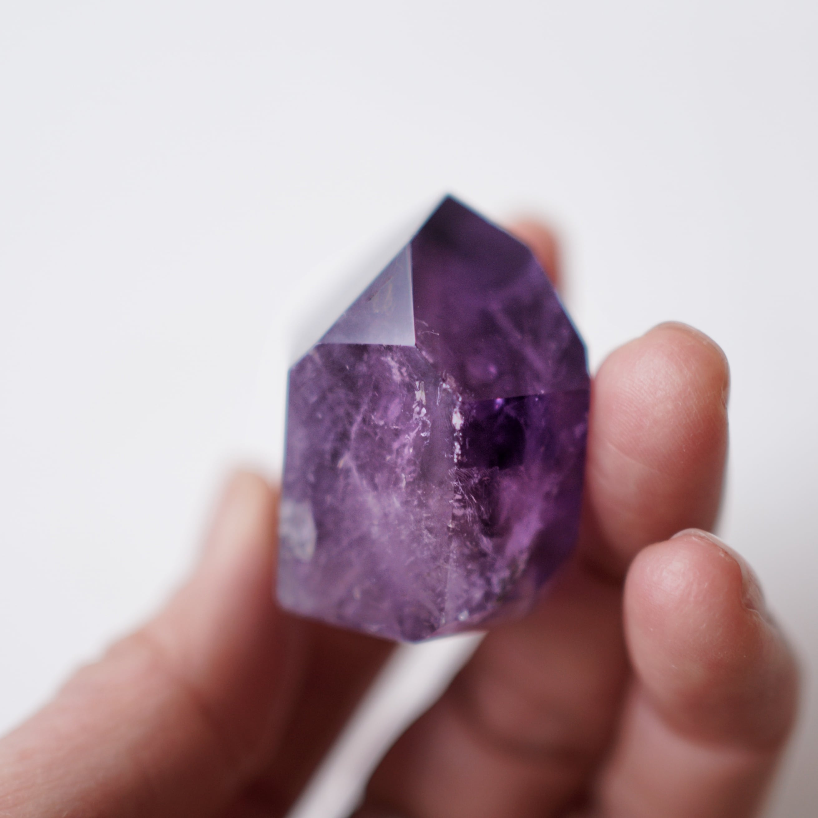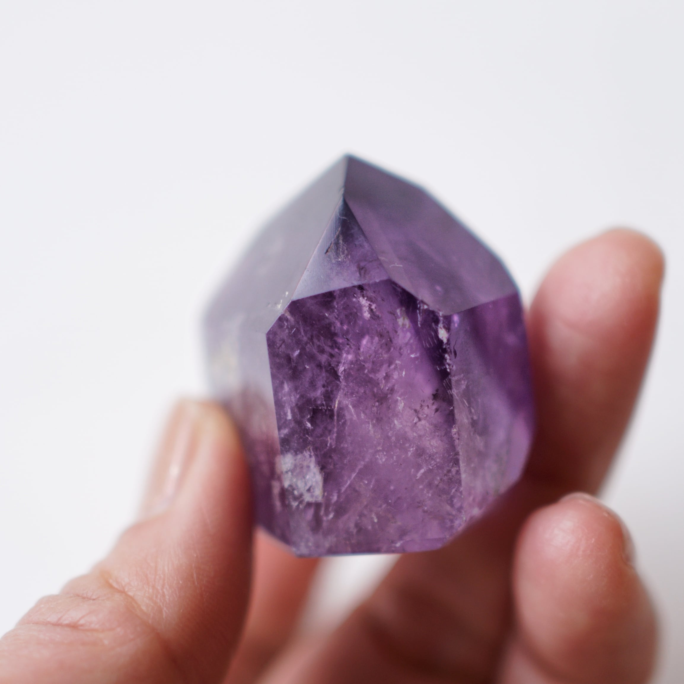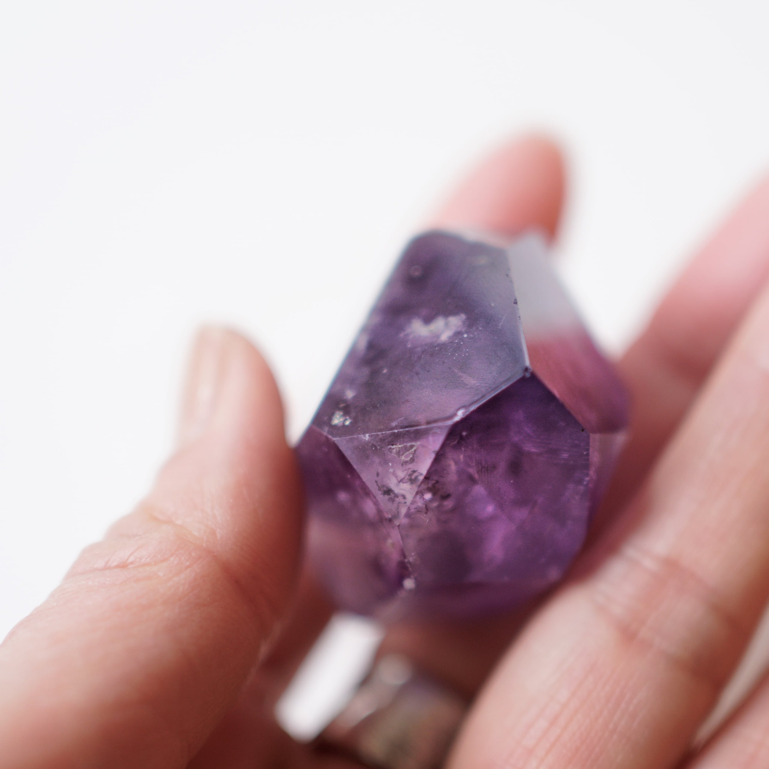 紫の濃淡や内包物が結晶の奥に重なり、