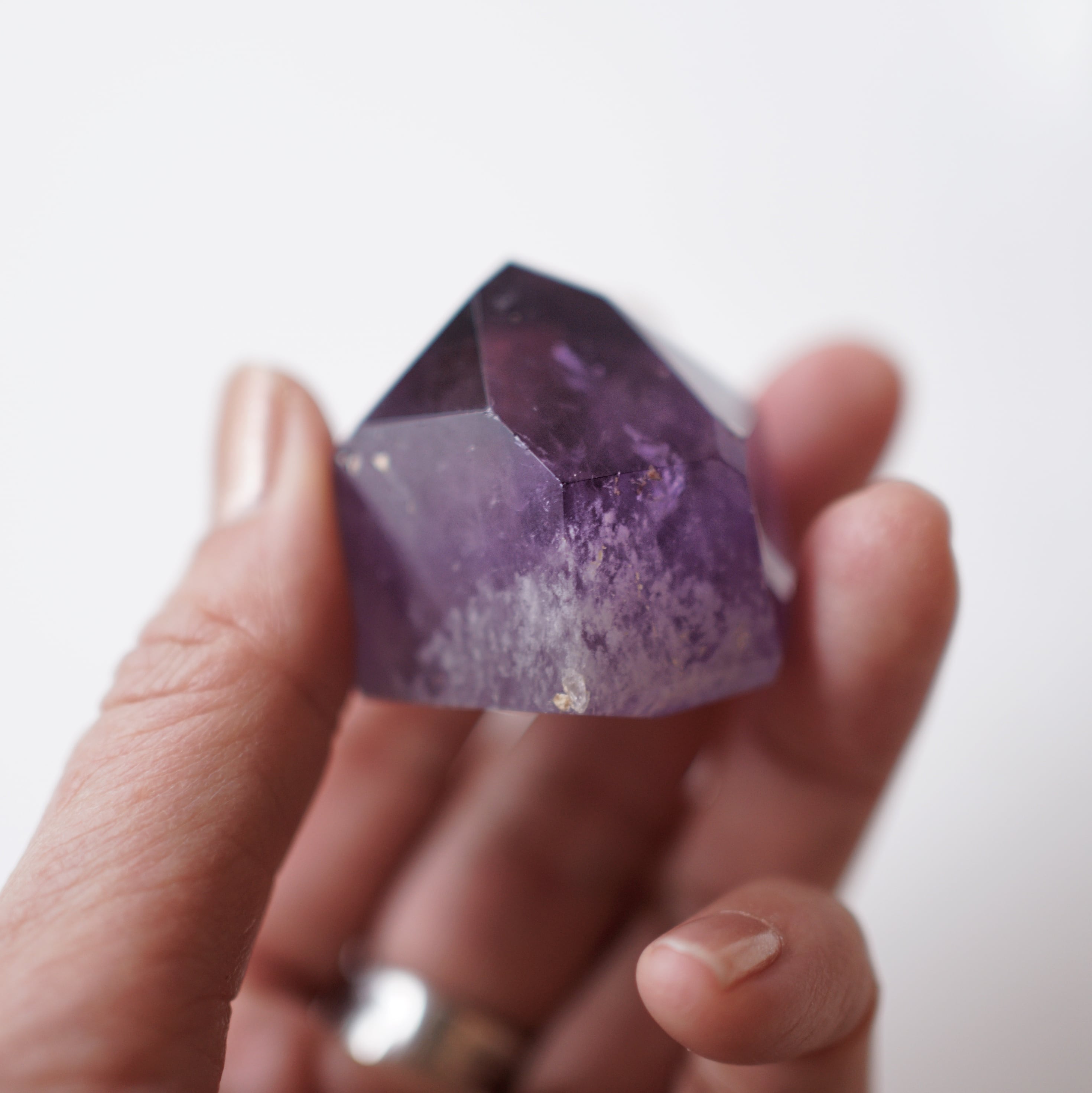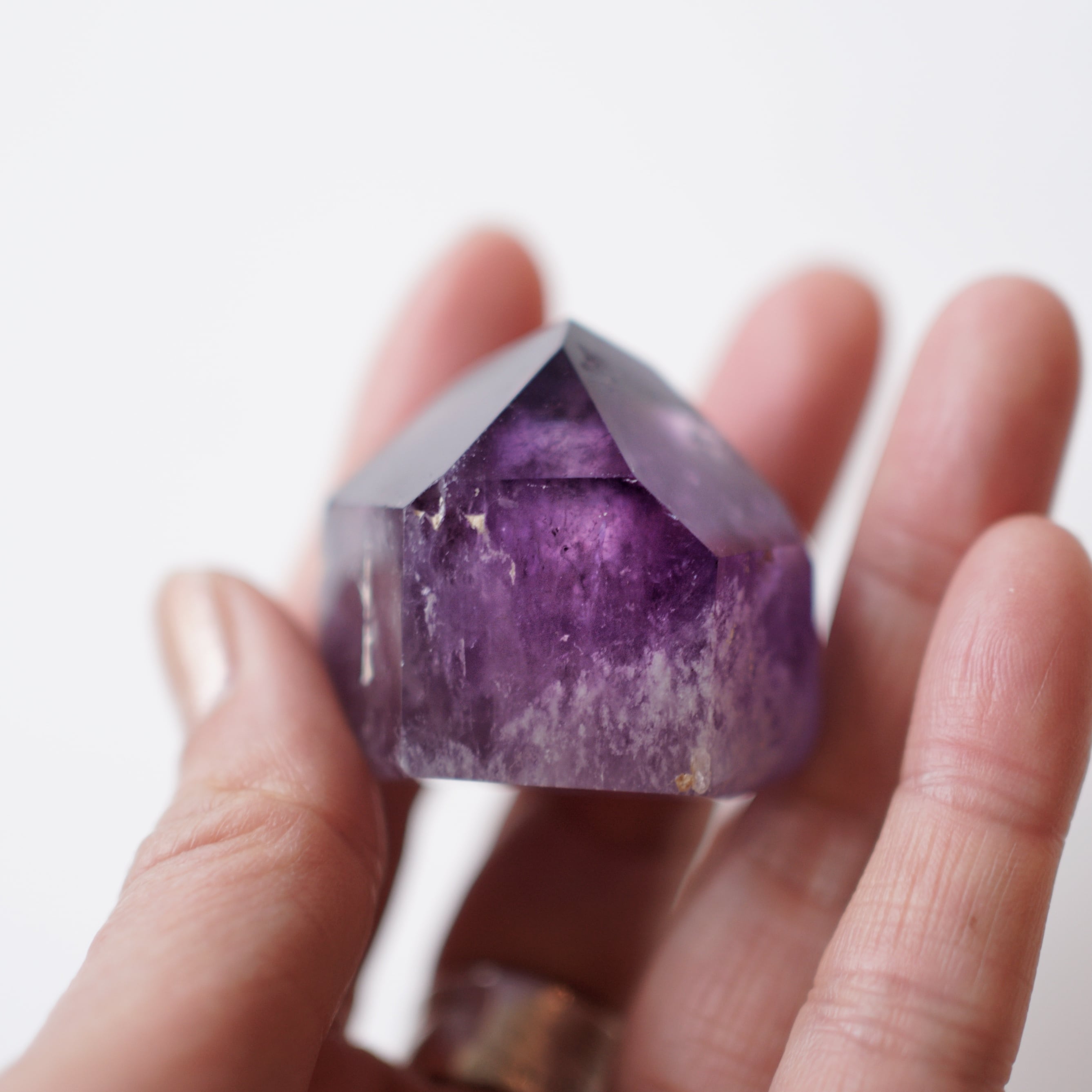 紫の濃淡や内包物が結晶の奥に重なり、