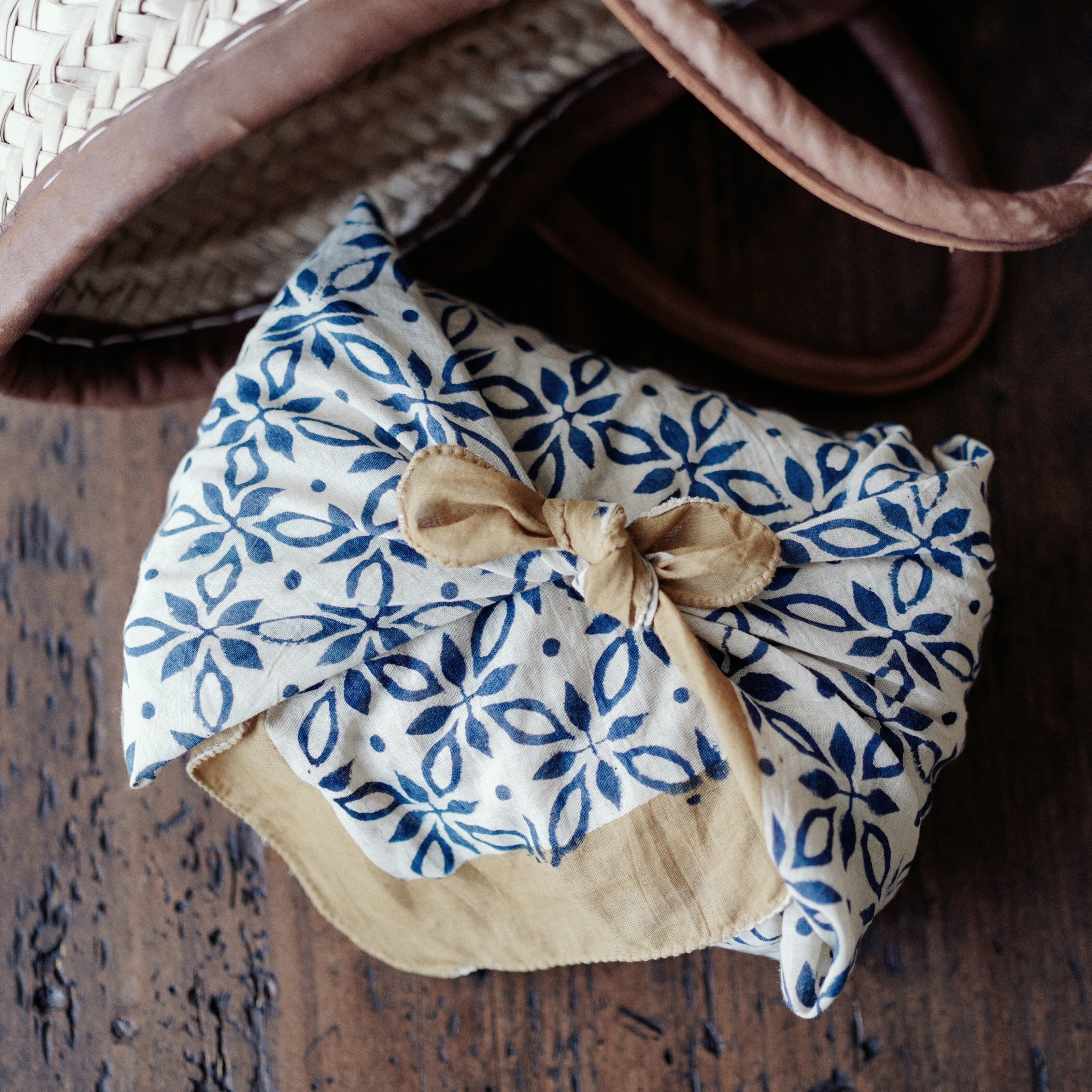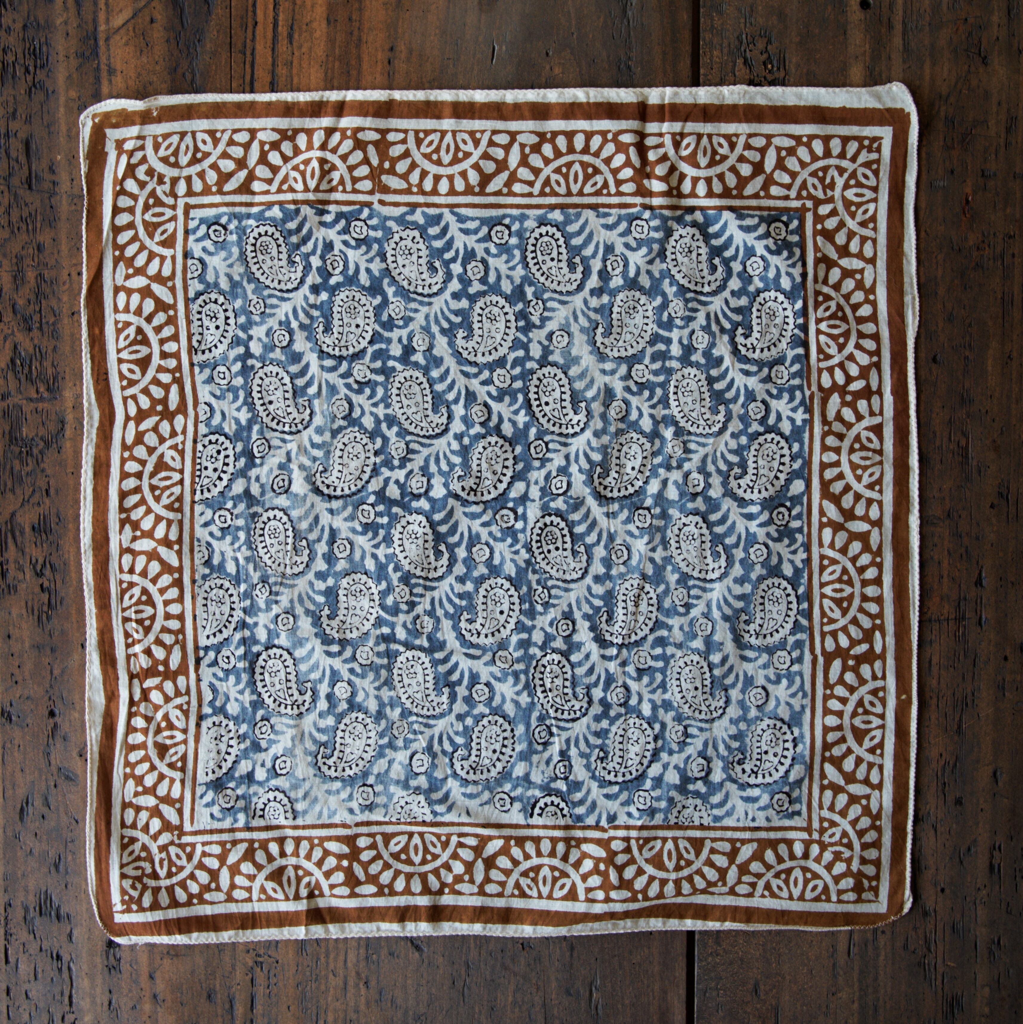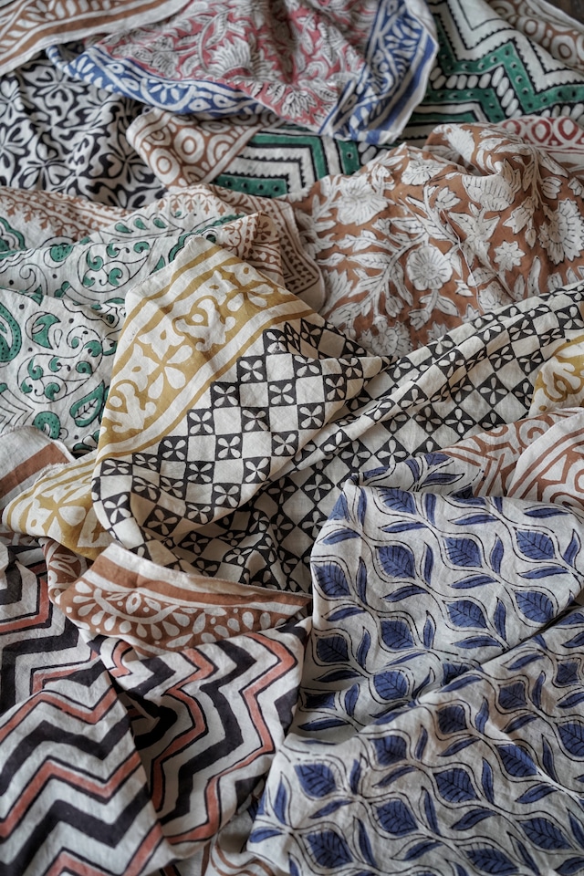 インドの職人によって、一枚一枚ていねいに木版で染め上げられたコットンバンダナ。