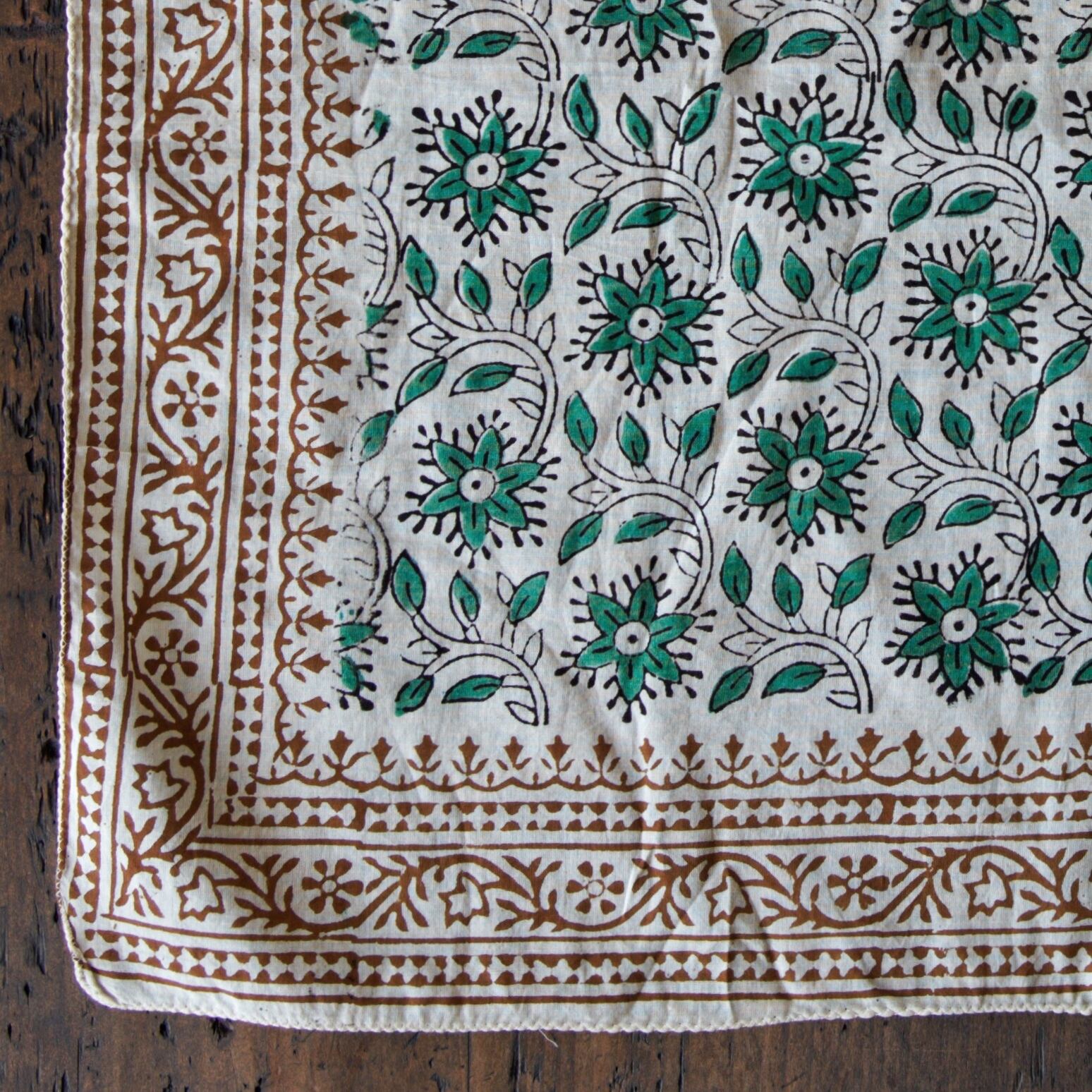 インドの職人によって、一枚一枚ていねいに木版で染め上げられたコットンバンダナ。