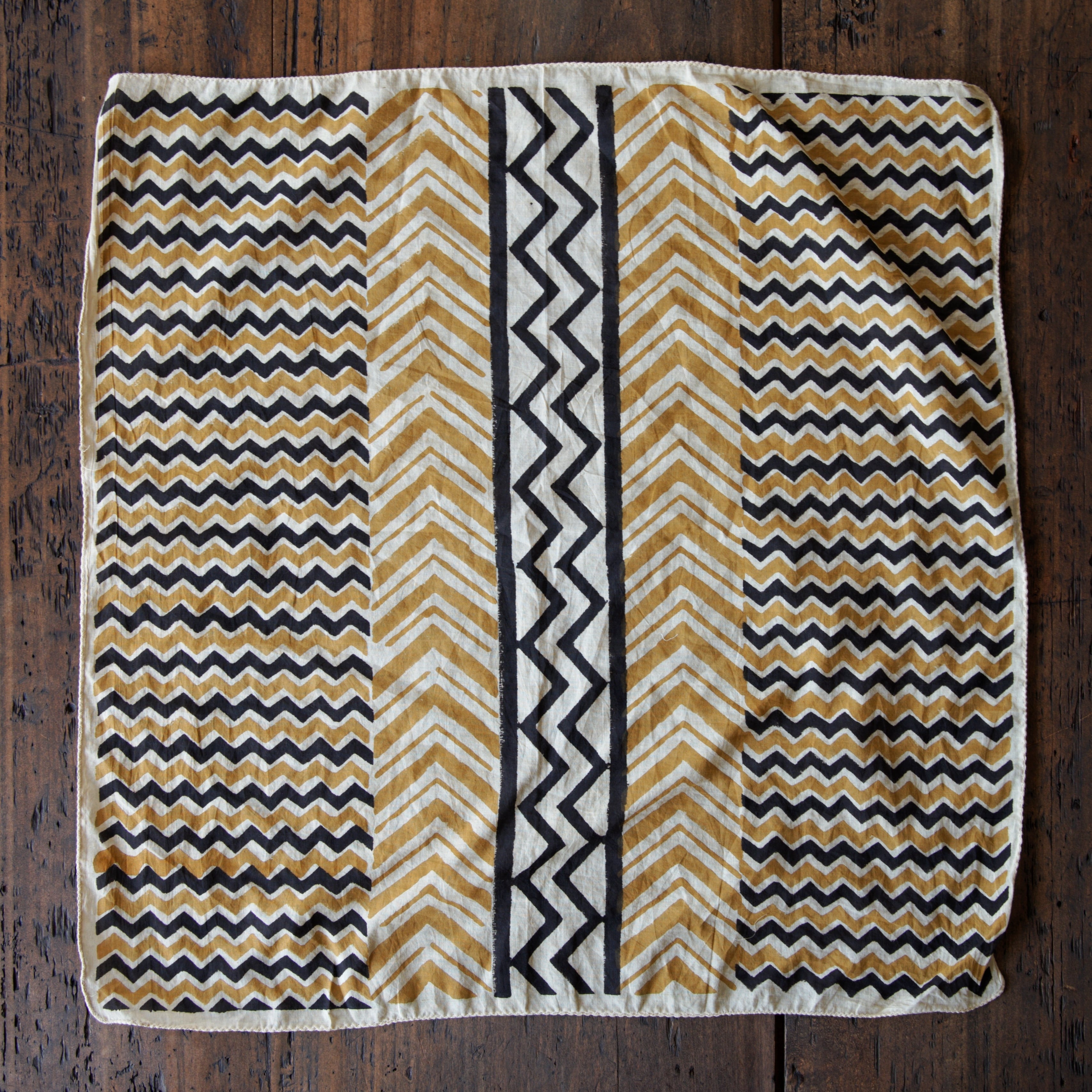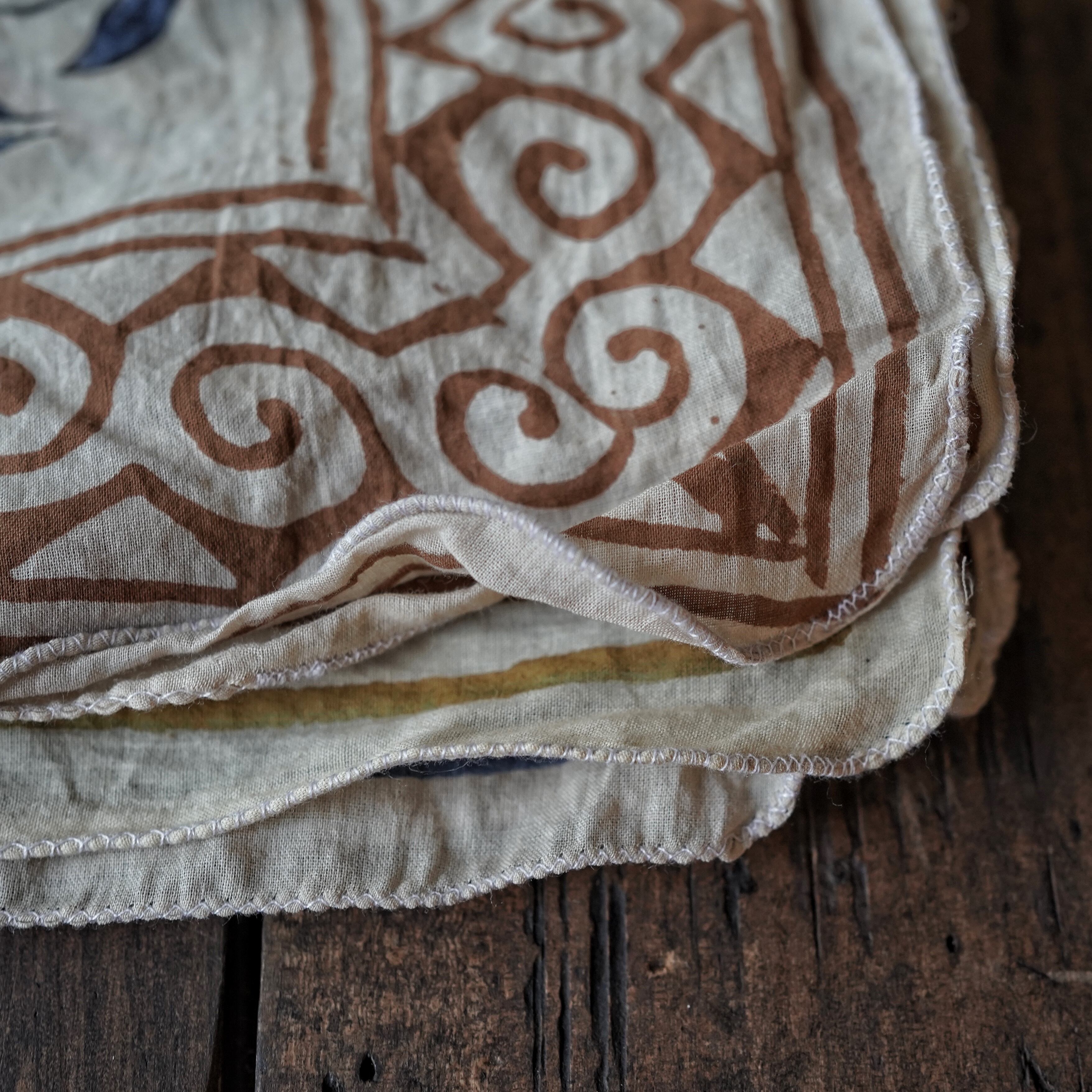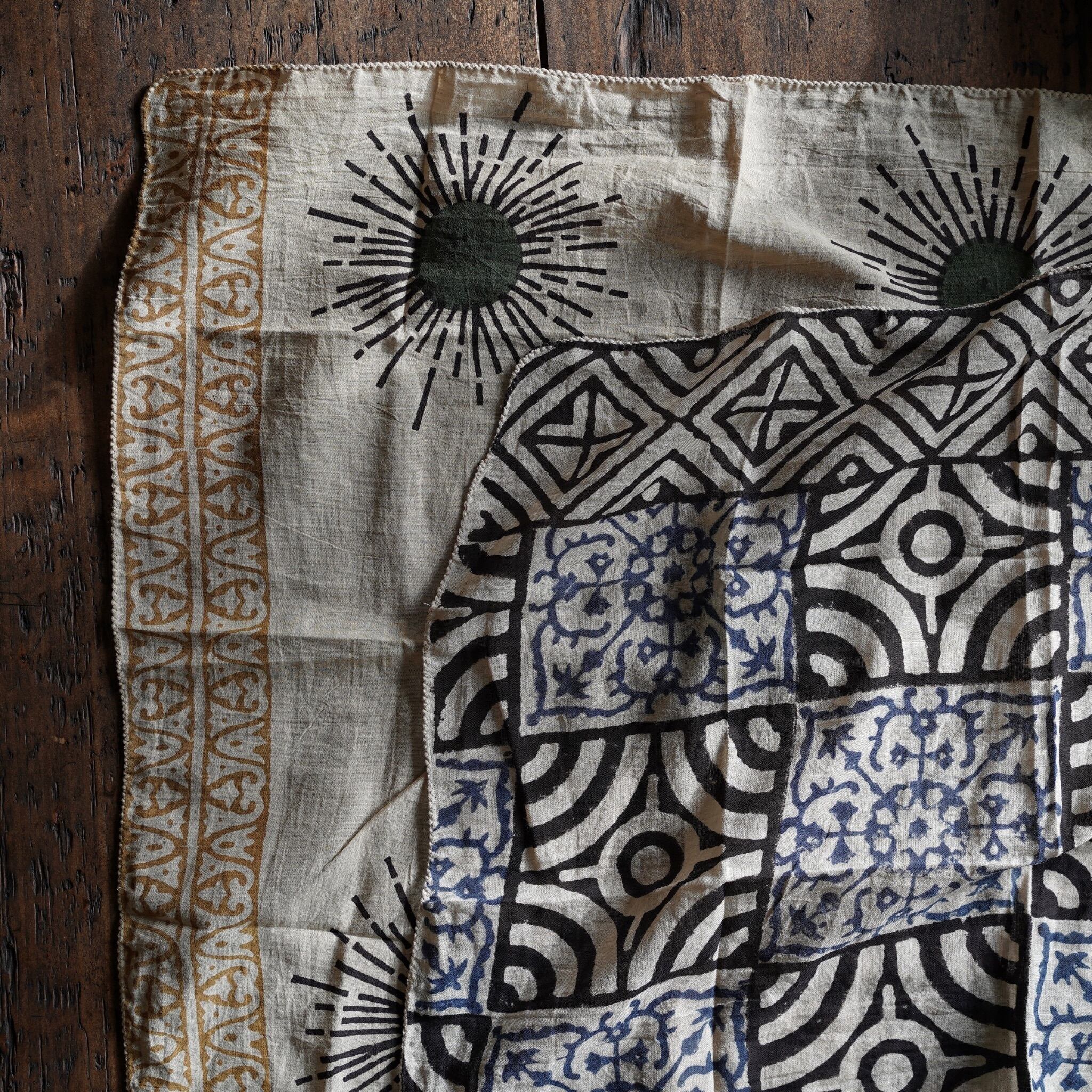 インドの職人によって、一枚一枚ていねいに木版で染め上げられたコットンバンダナ。