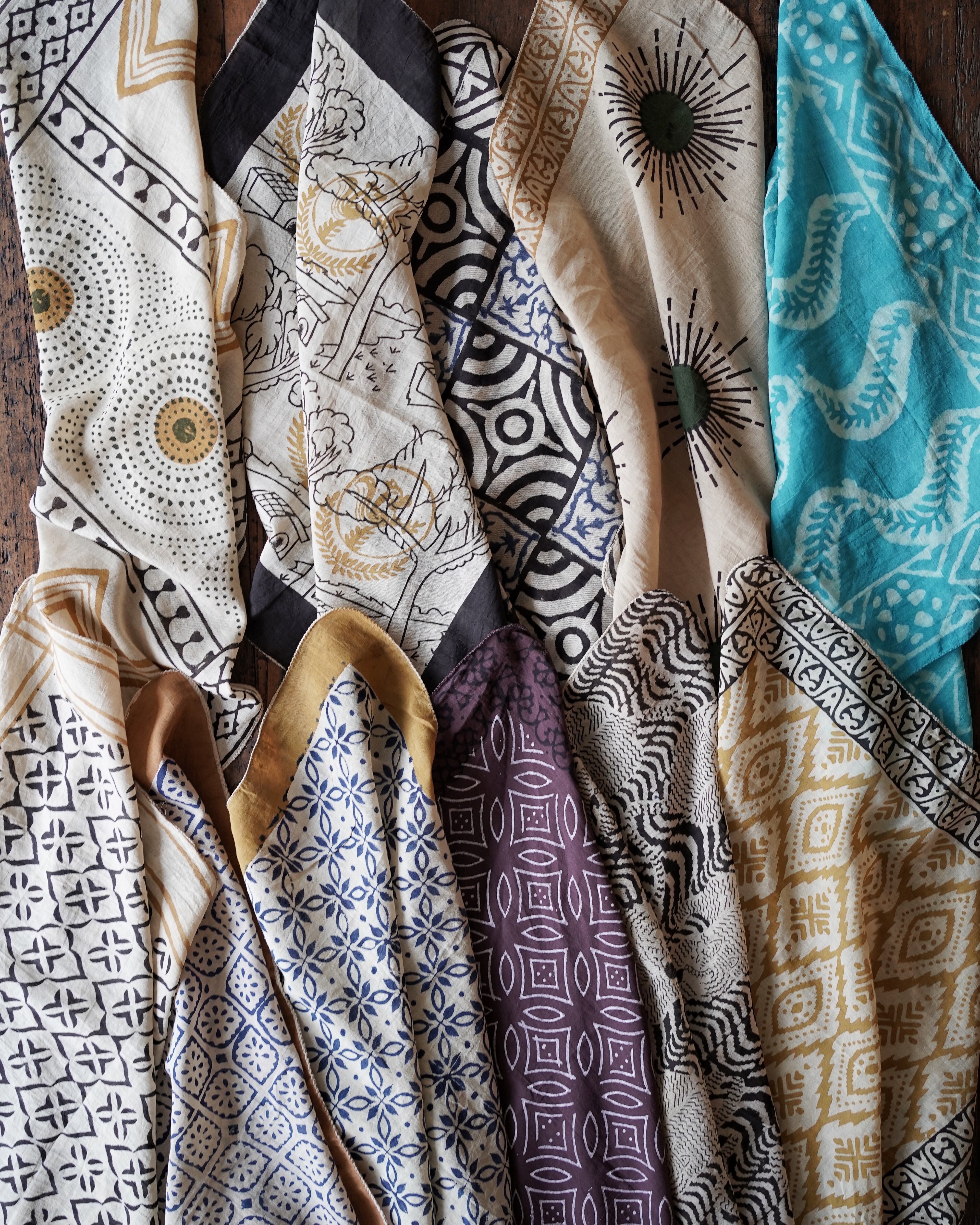 インドの職人によって、一枚一枚ていねいに木版で染め上げられたコットンバンダナ。