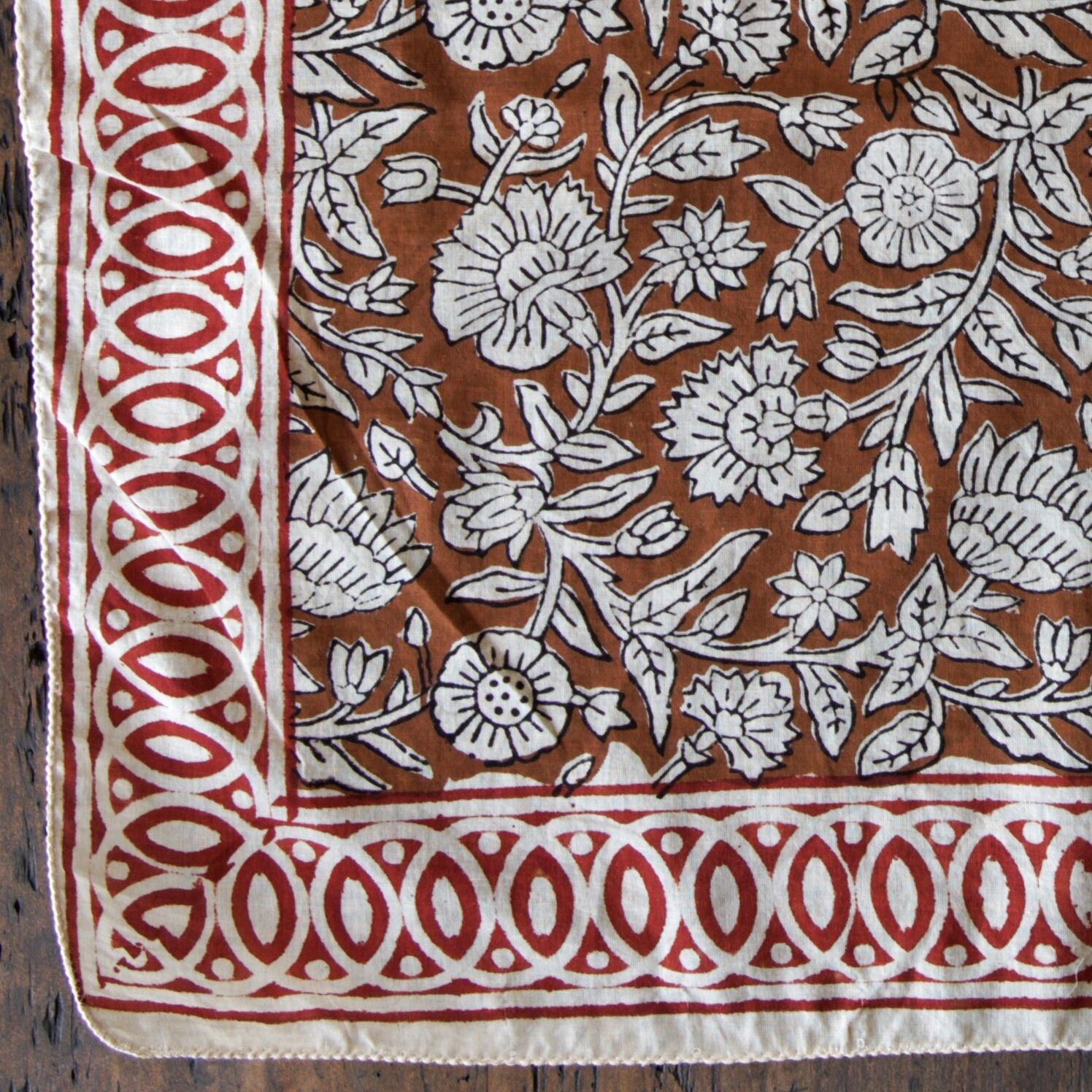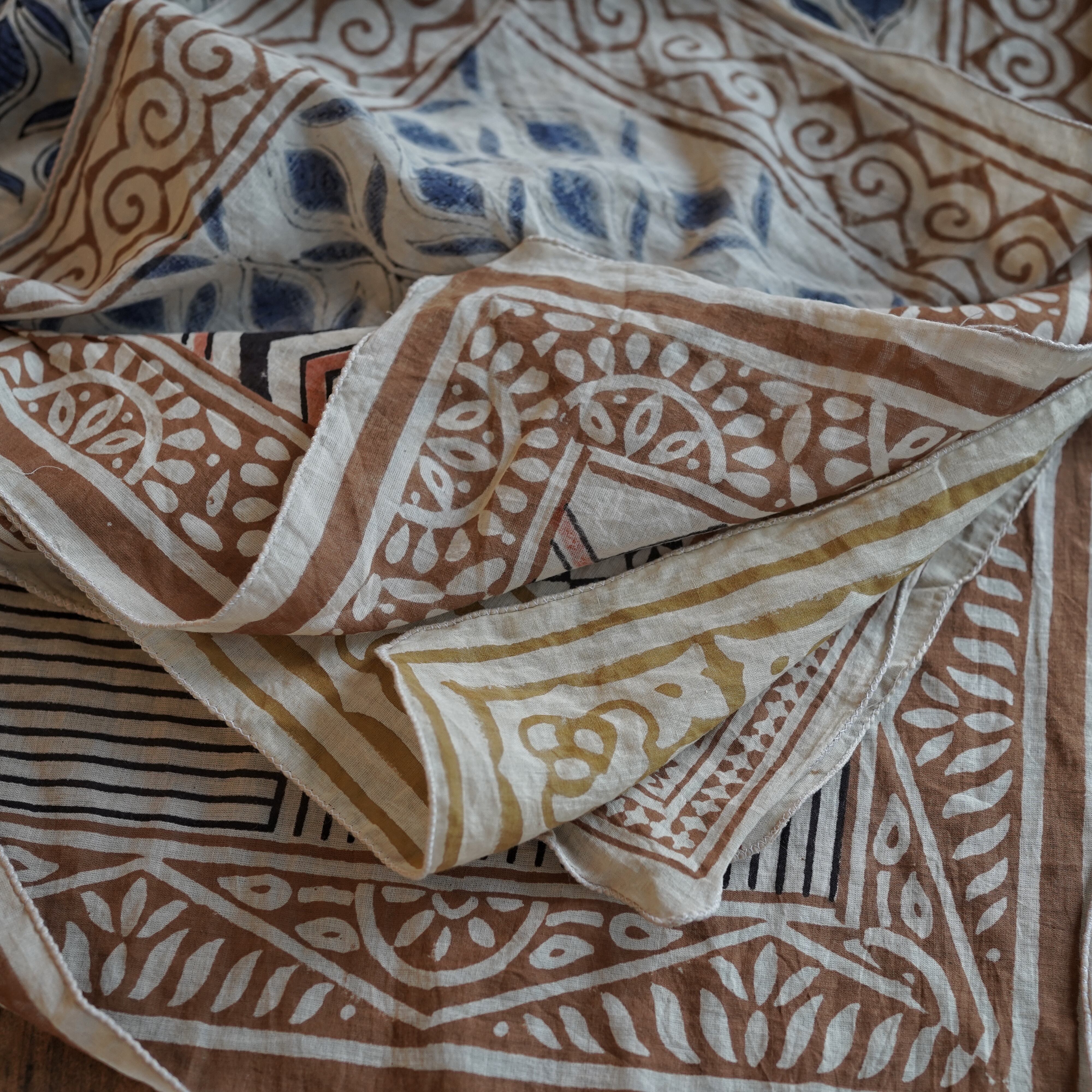 インドの職人によって、一枚一枚ていねいに木版で染め上げられたコットンバンダナ。