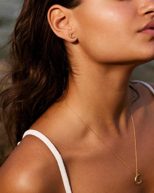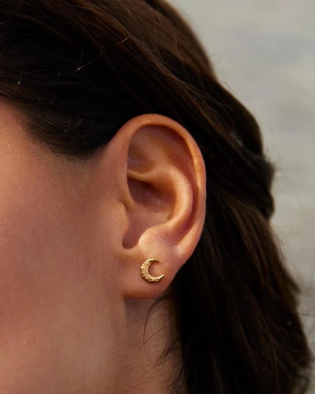 繊細に打ち出された三日月のフォルムは、ほんのりと陰影を宿しながら耳元で凛と輝きます。日常に溶け込む極小サイズだから、単体でも他のピアスと合わせても抜群に決まる。
