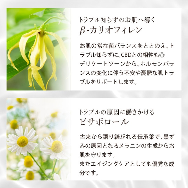 ゴマ油、カンナビジオール、ビサボロール、β-カリオフィレン、月見草油、トコフェロール