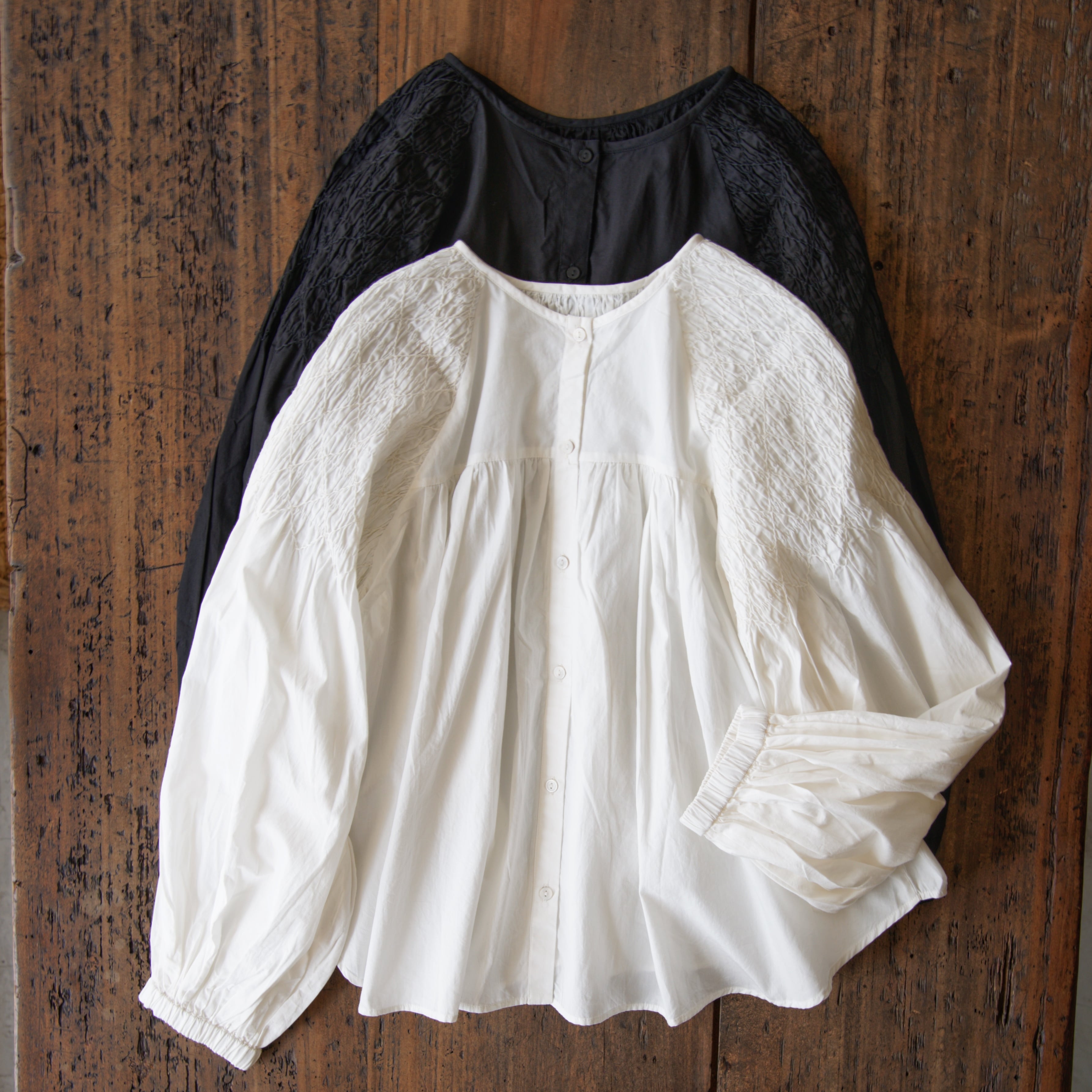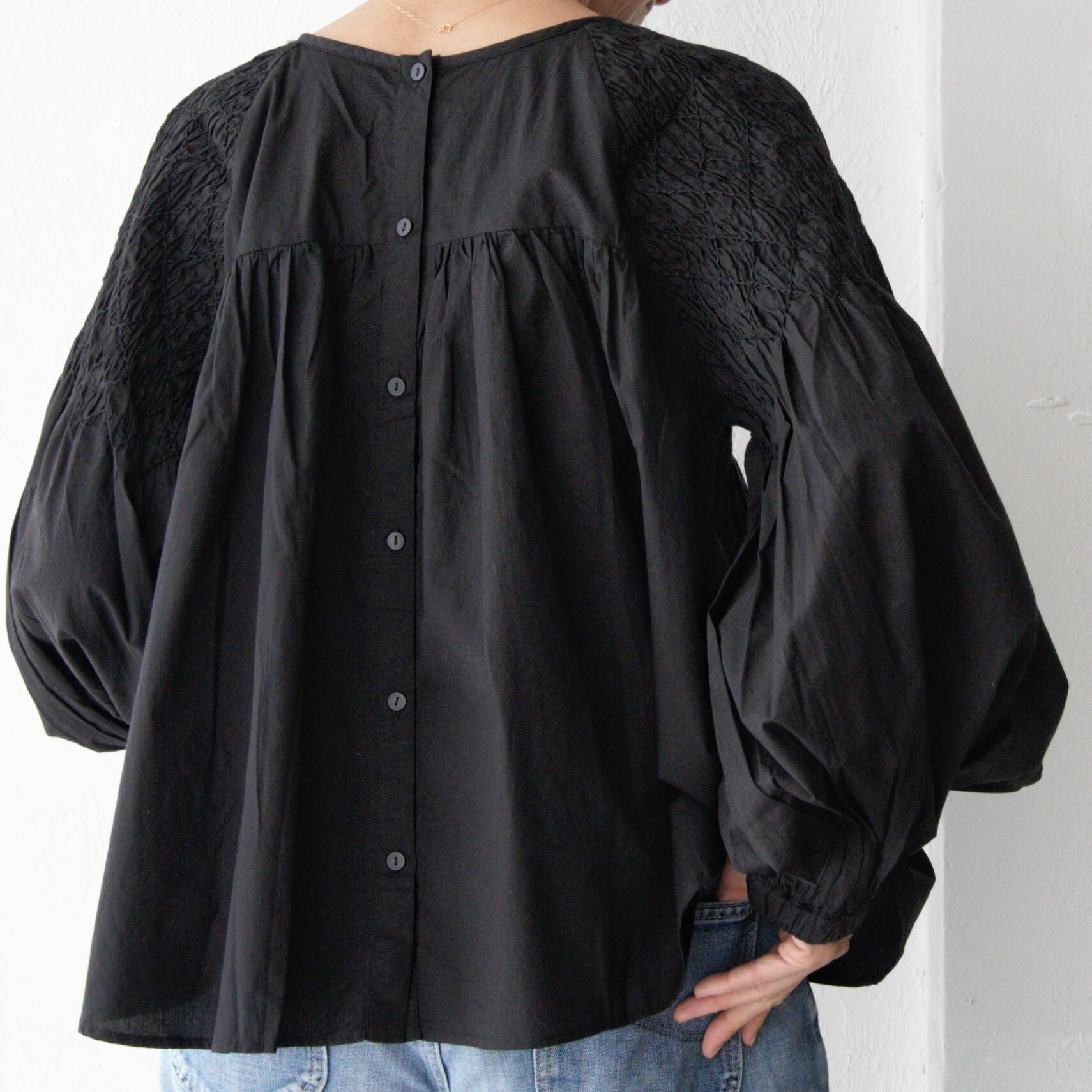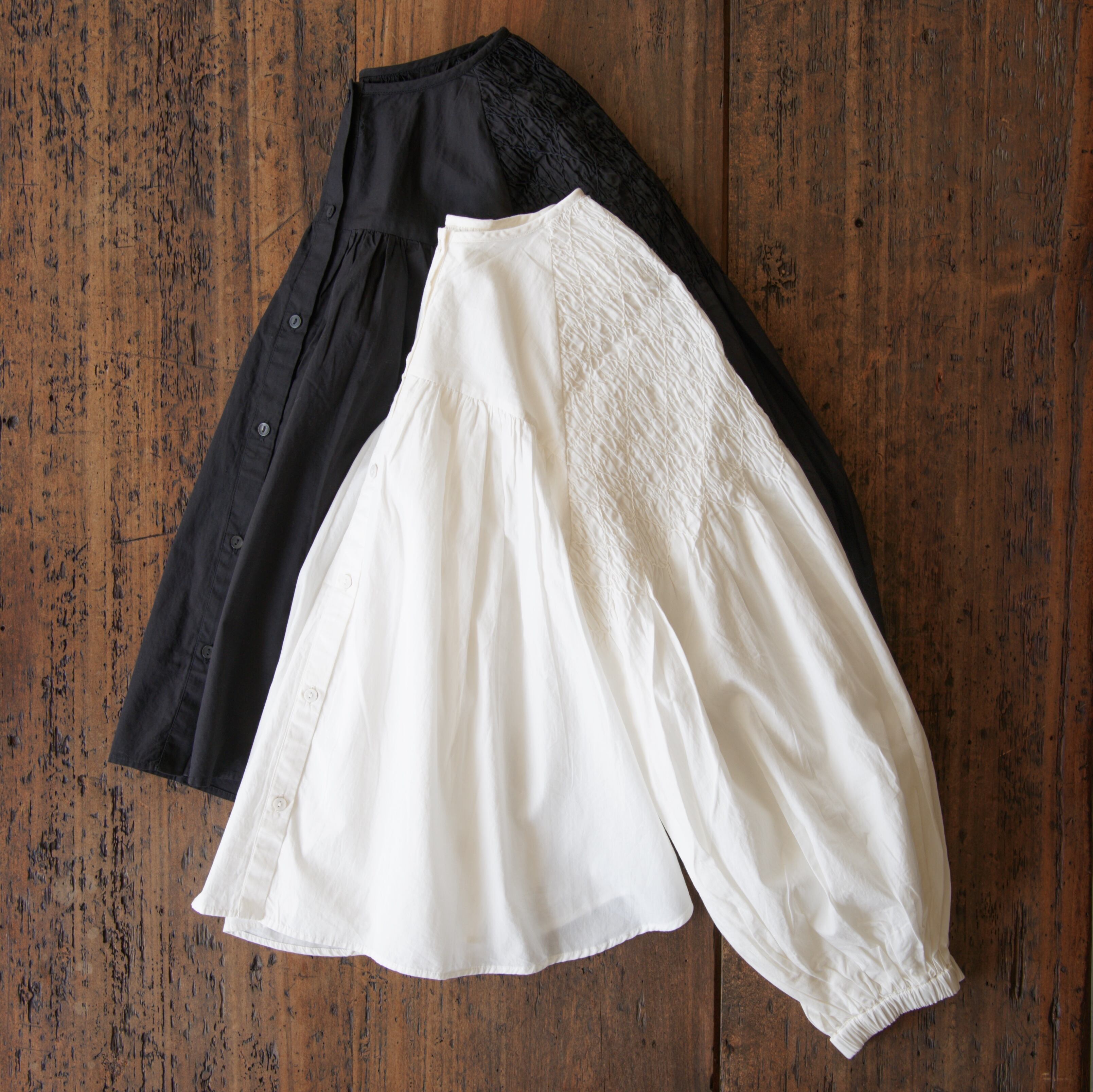 胸元から袖へと続く、繊細なハンドスモッキング刺繍が印象的なブラウス。