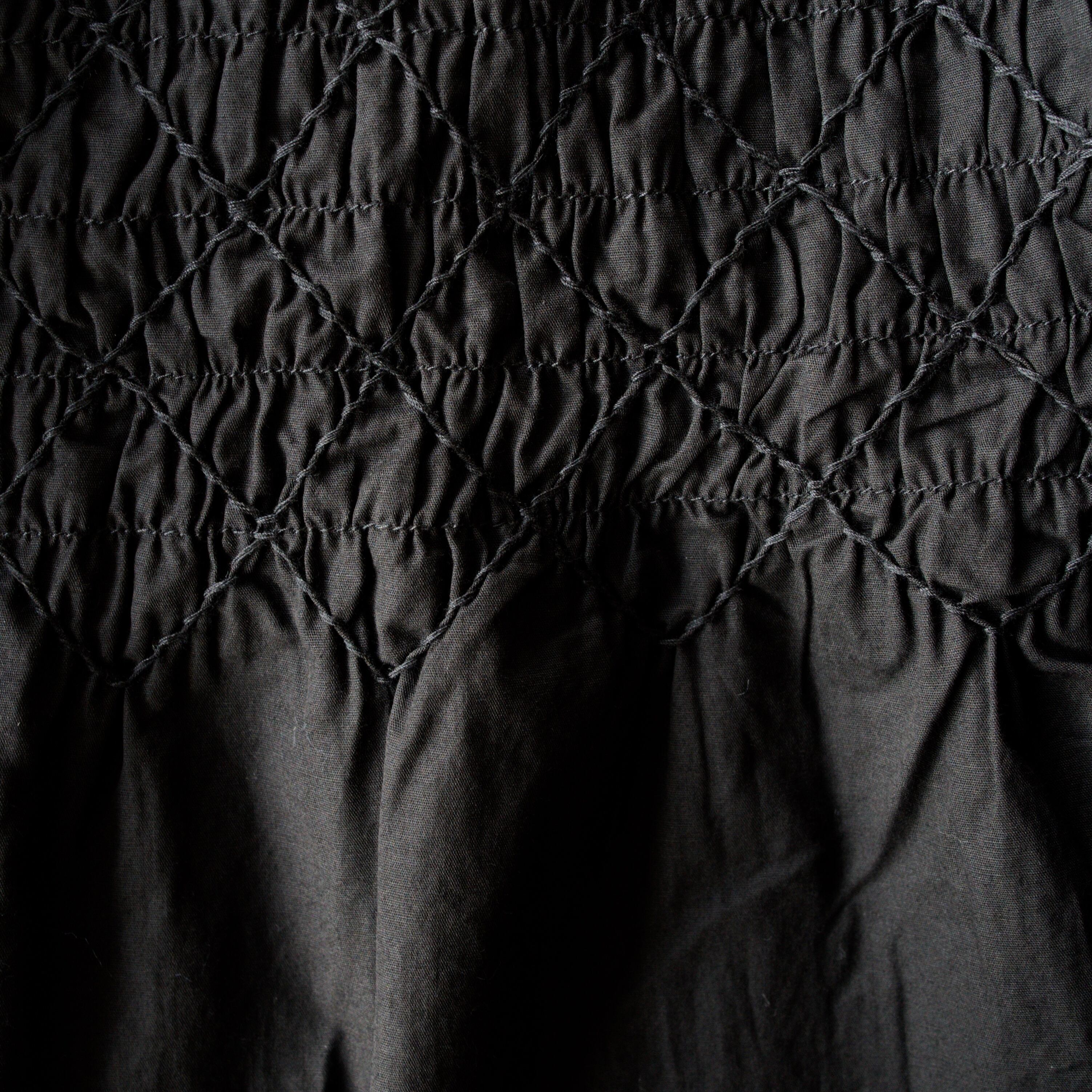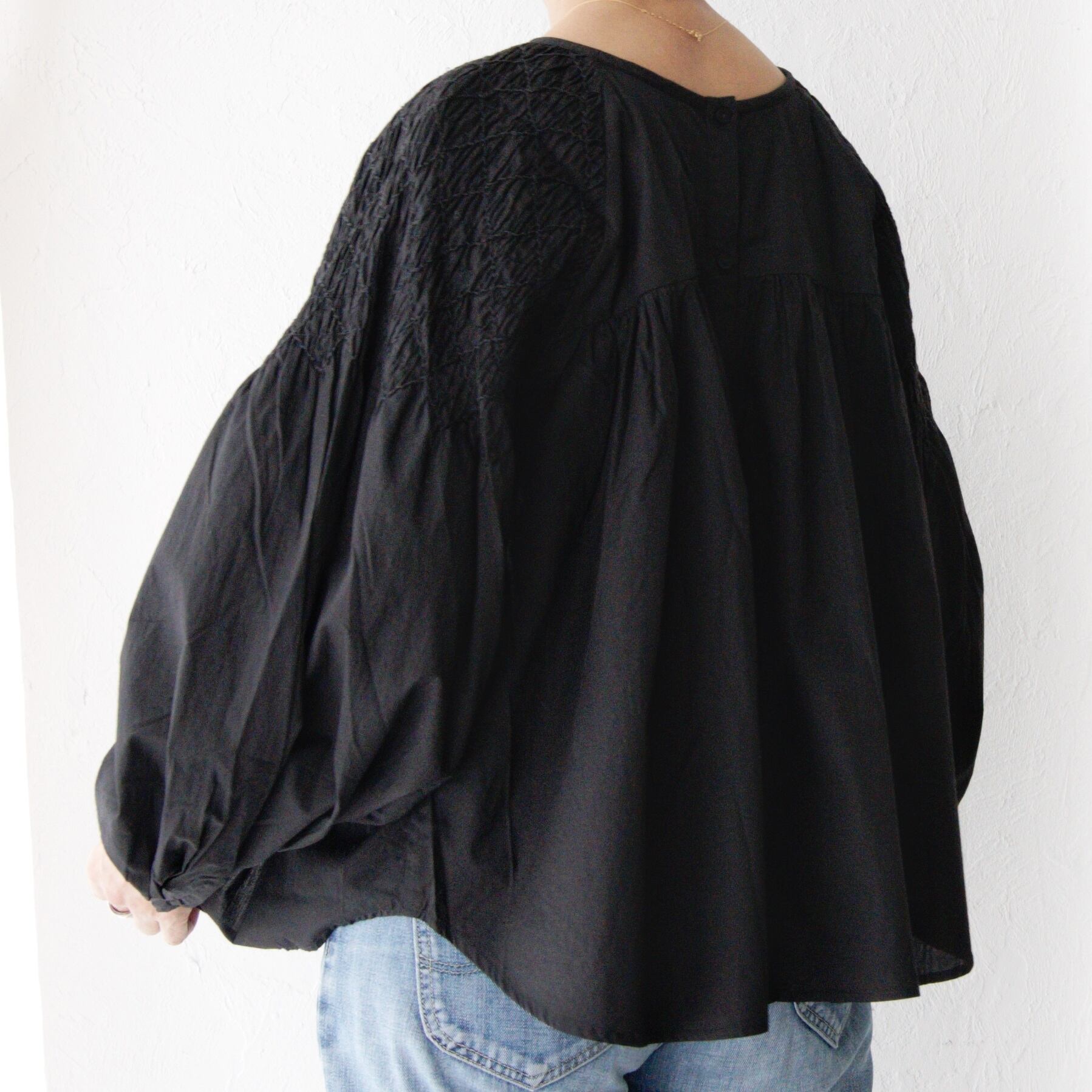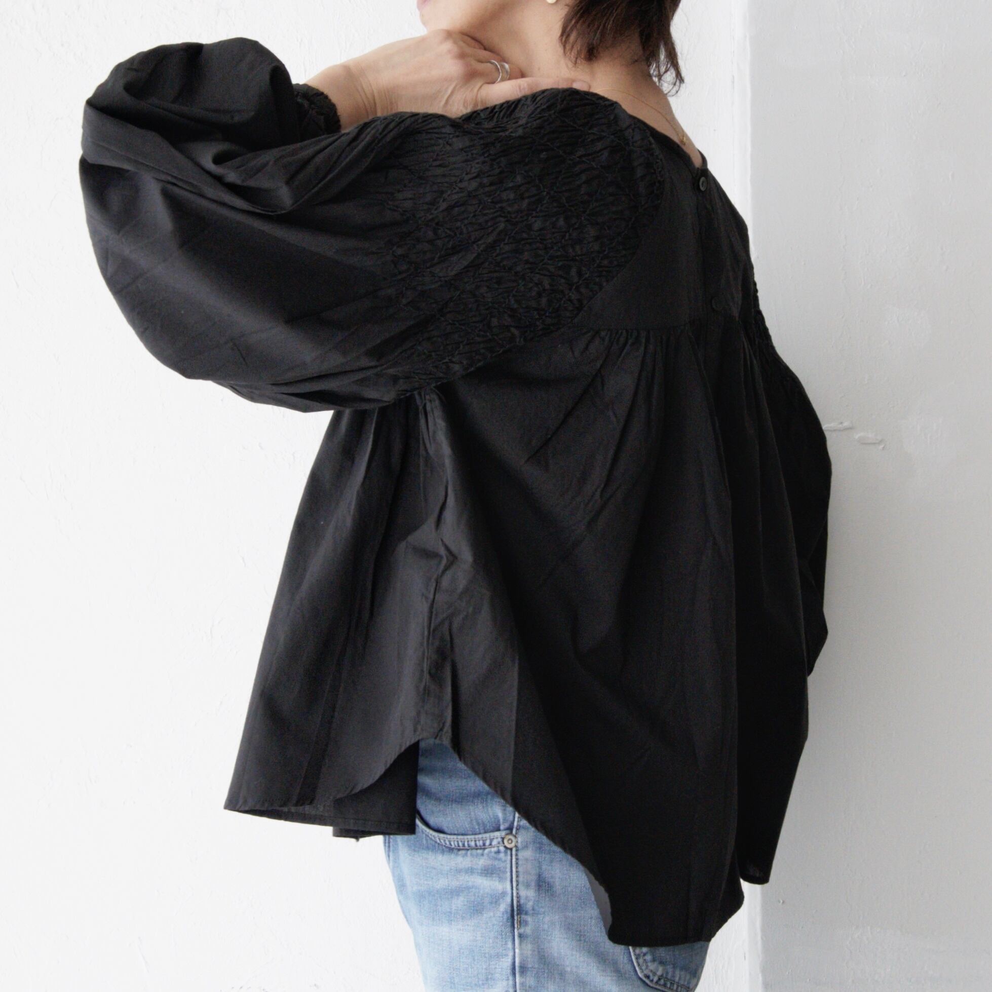 胸元から袖へと続く、繊細なハンドスモッキング刺繍が印象的なブラウス。